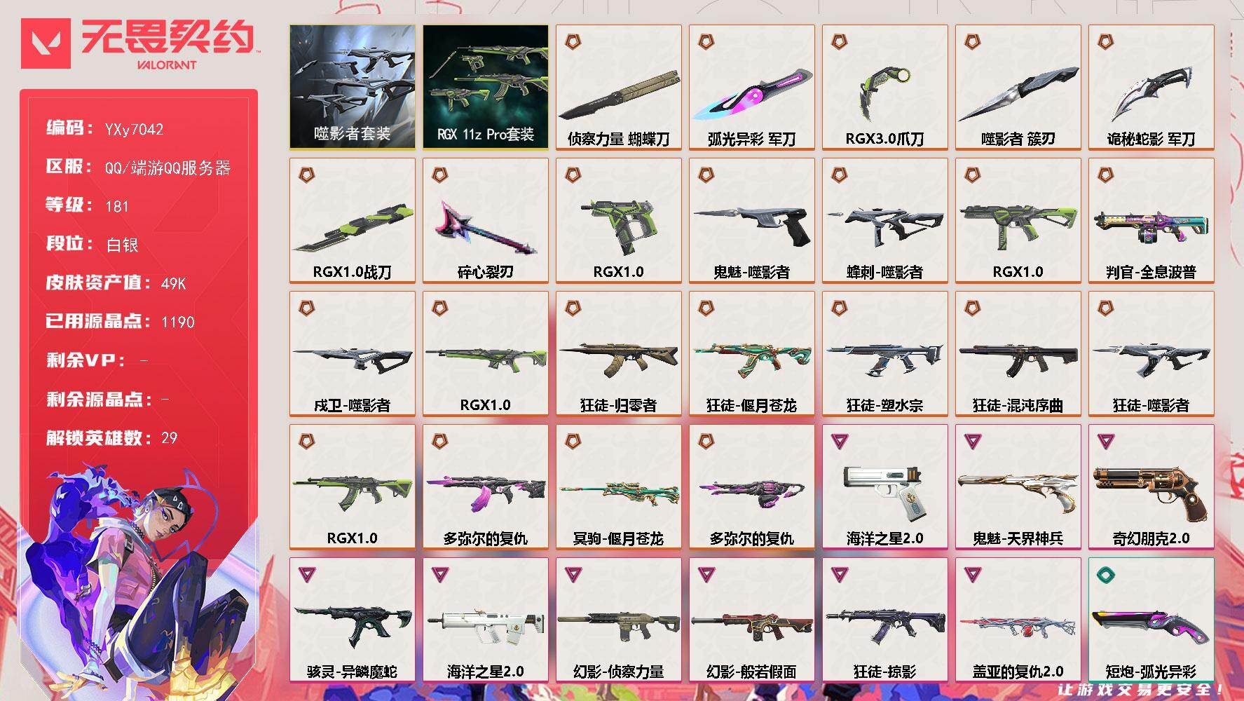 LV等级174/皮肤总价值8650/段位白银/总皮肤数量10/刀皮