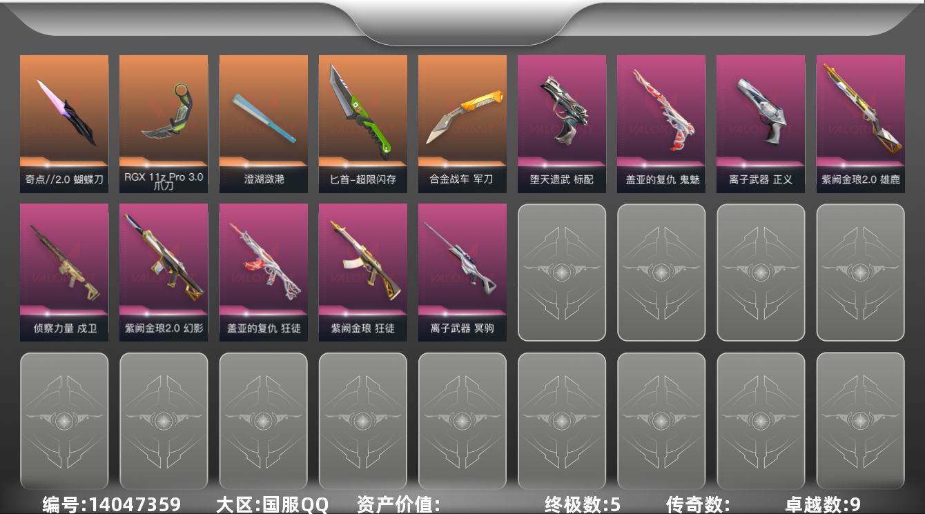 终极*8/传奇*1/卓越*2/皮肤*28/等级*156/段位:铂金/虚空遗器套装/幻棱/炼狱/维斯/暮蝶/钛狐