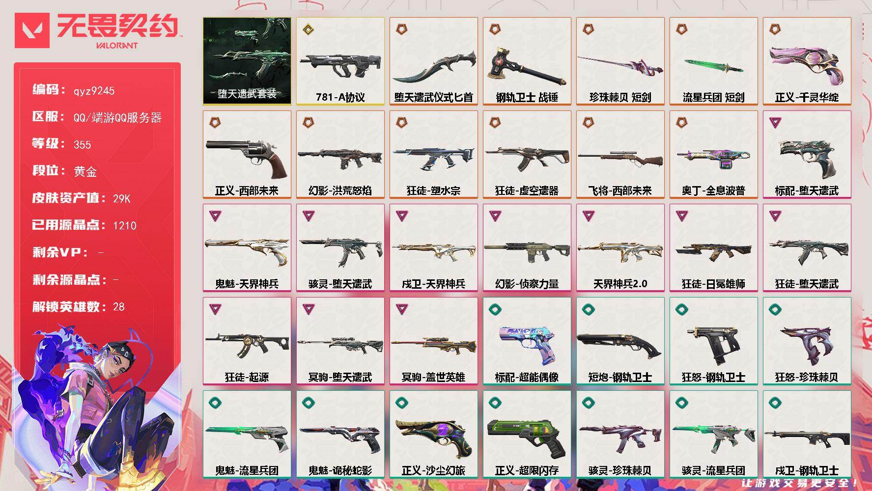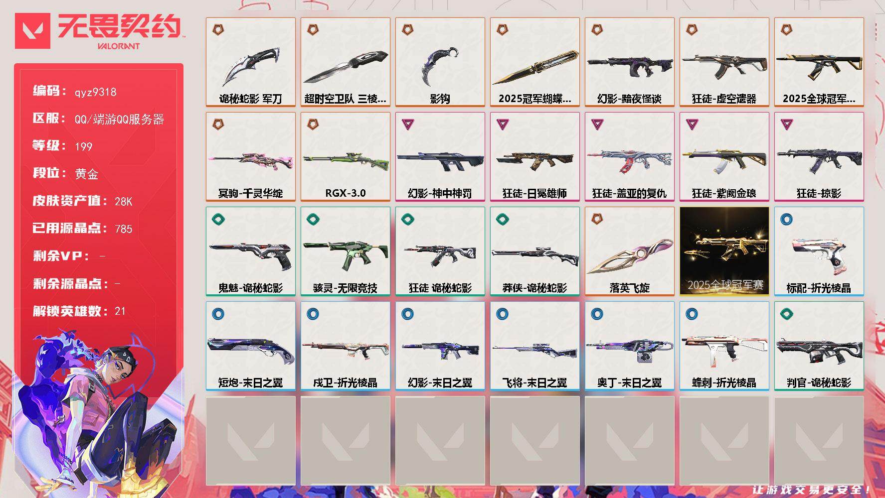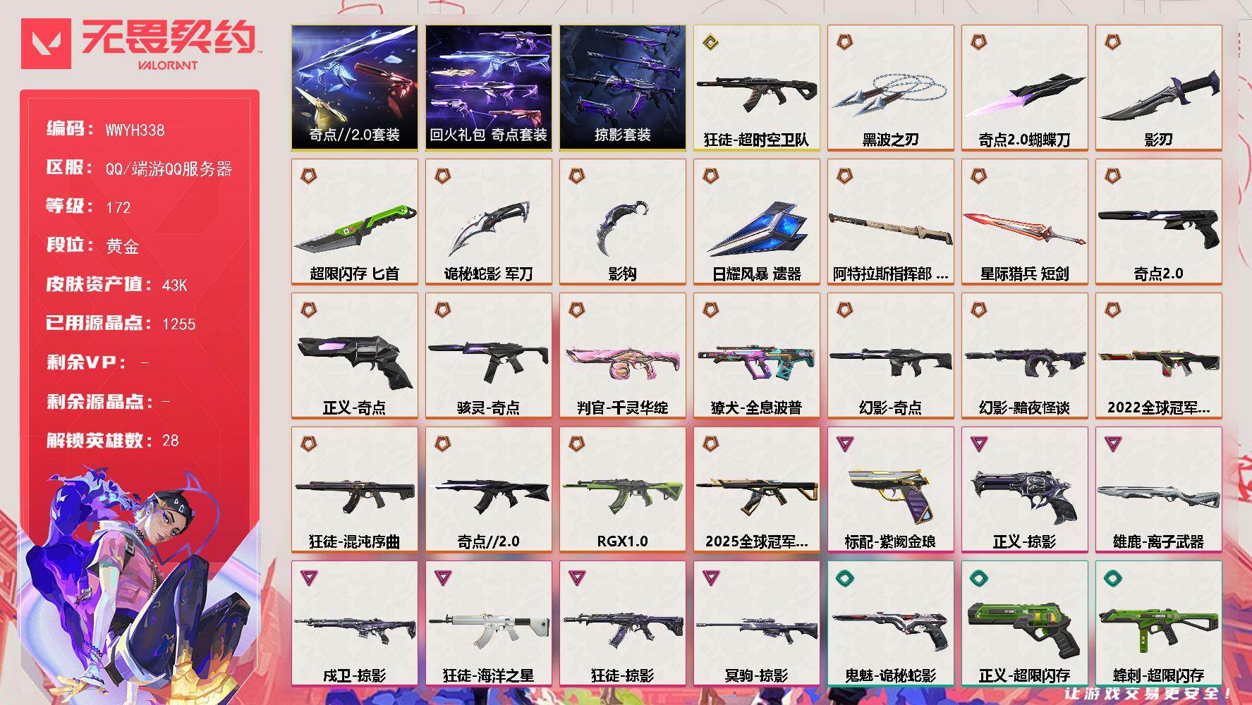 终极*21/传奇*1/卓越*7/皮肤*93/等级*172/段位:黄金/奇点//2.0套装/回火礼包:奇点套装/