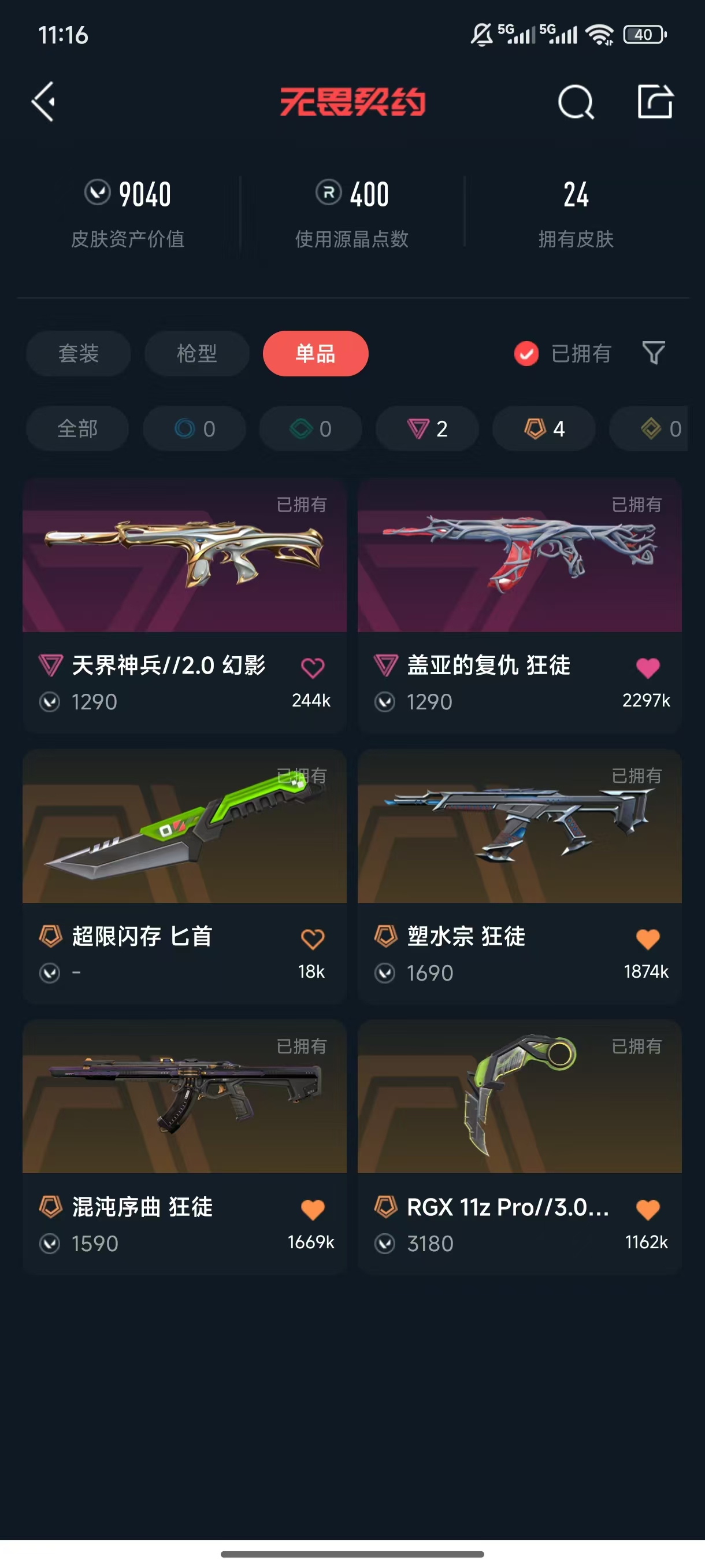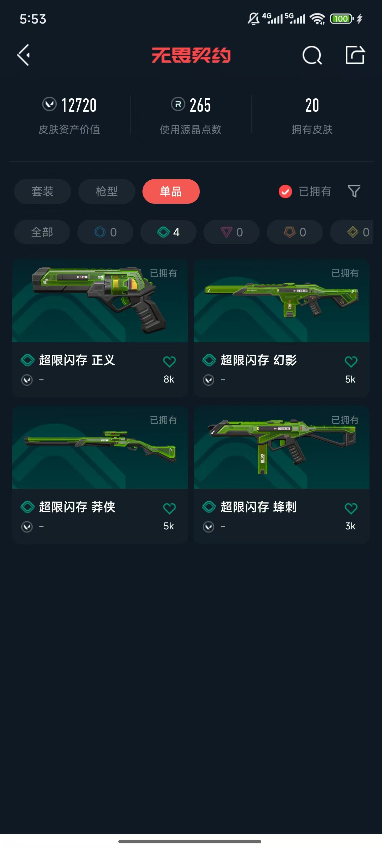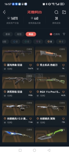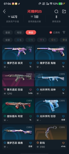 无畏契约【安卓QQ】每把枪基本都有一个超级好的皮肤升级枪刀都满级了主流颜色也都买了皮肤价值11520源晶还有385r点