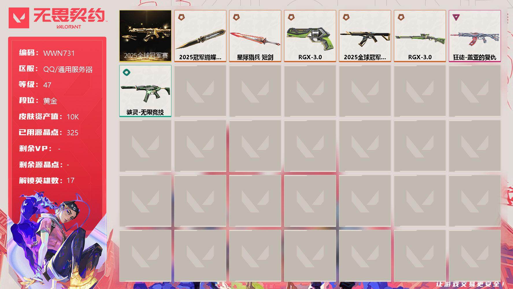无畏契约【端游】终极*2/卓越*2/皮肤*17/等级*47/段位:黄金/