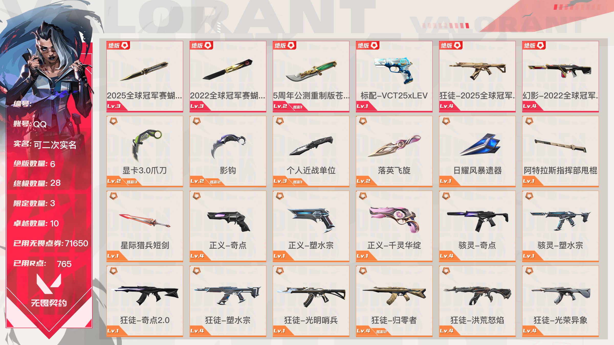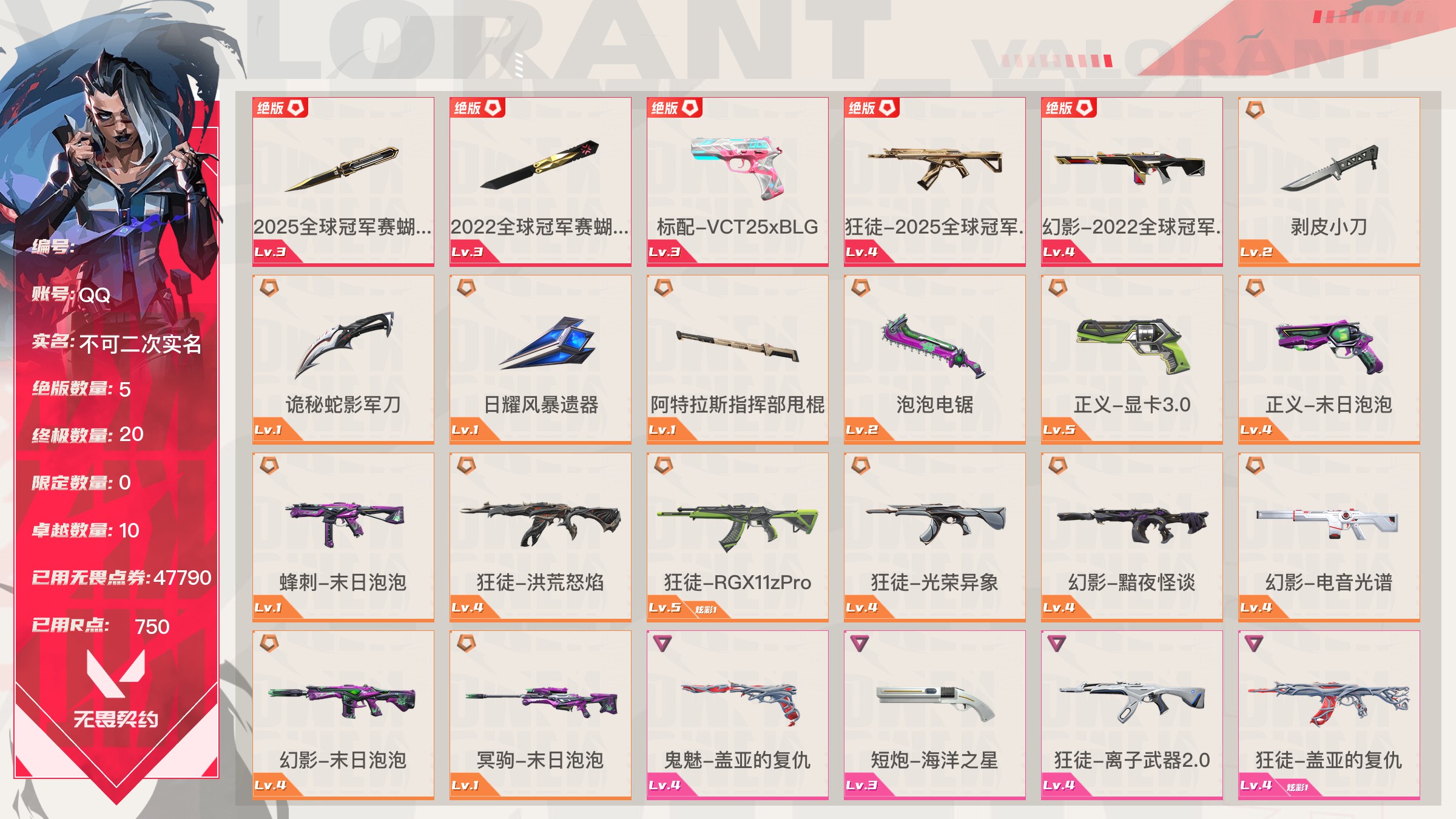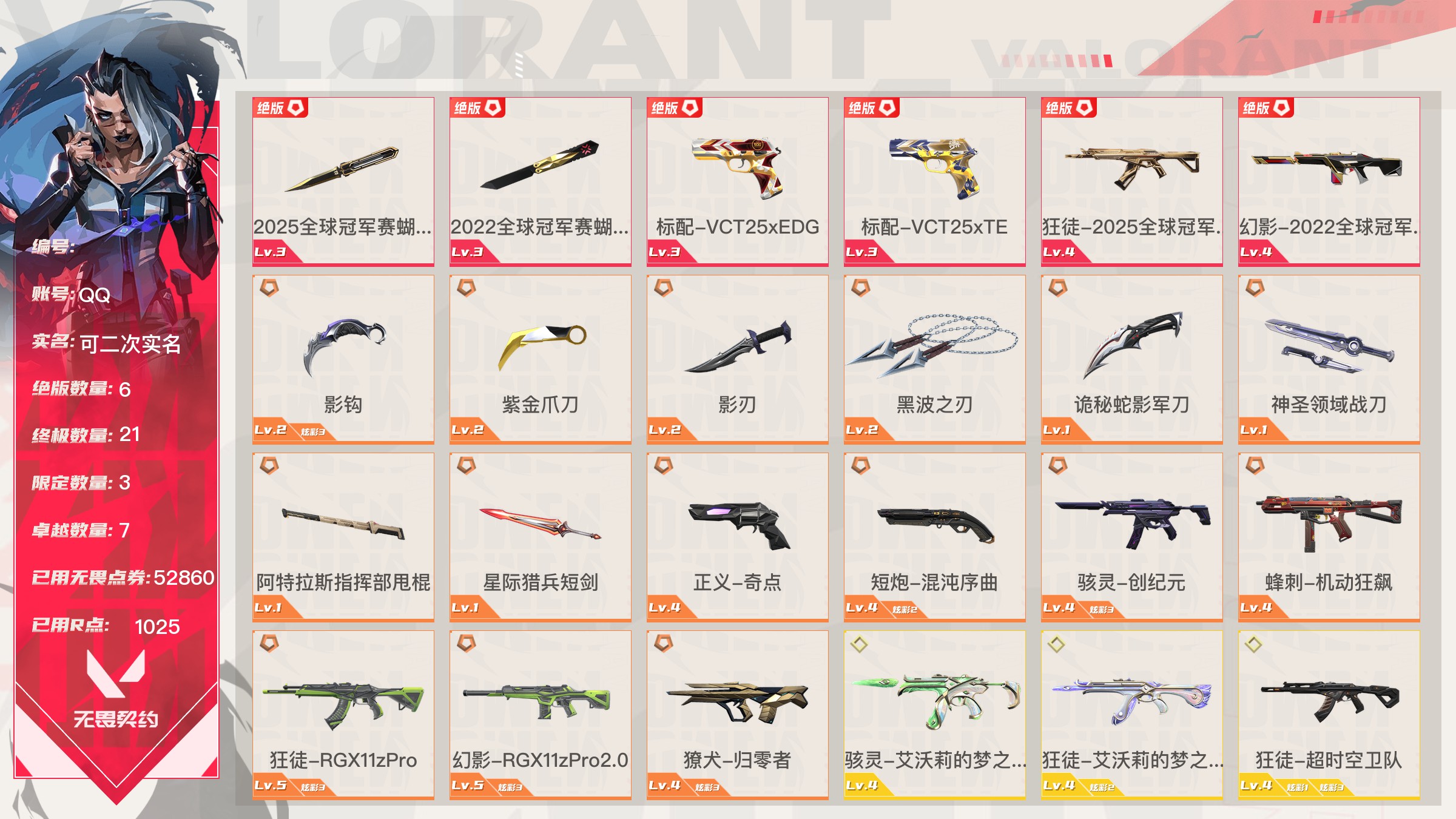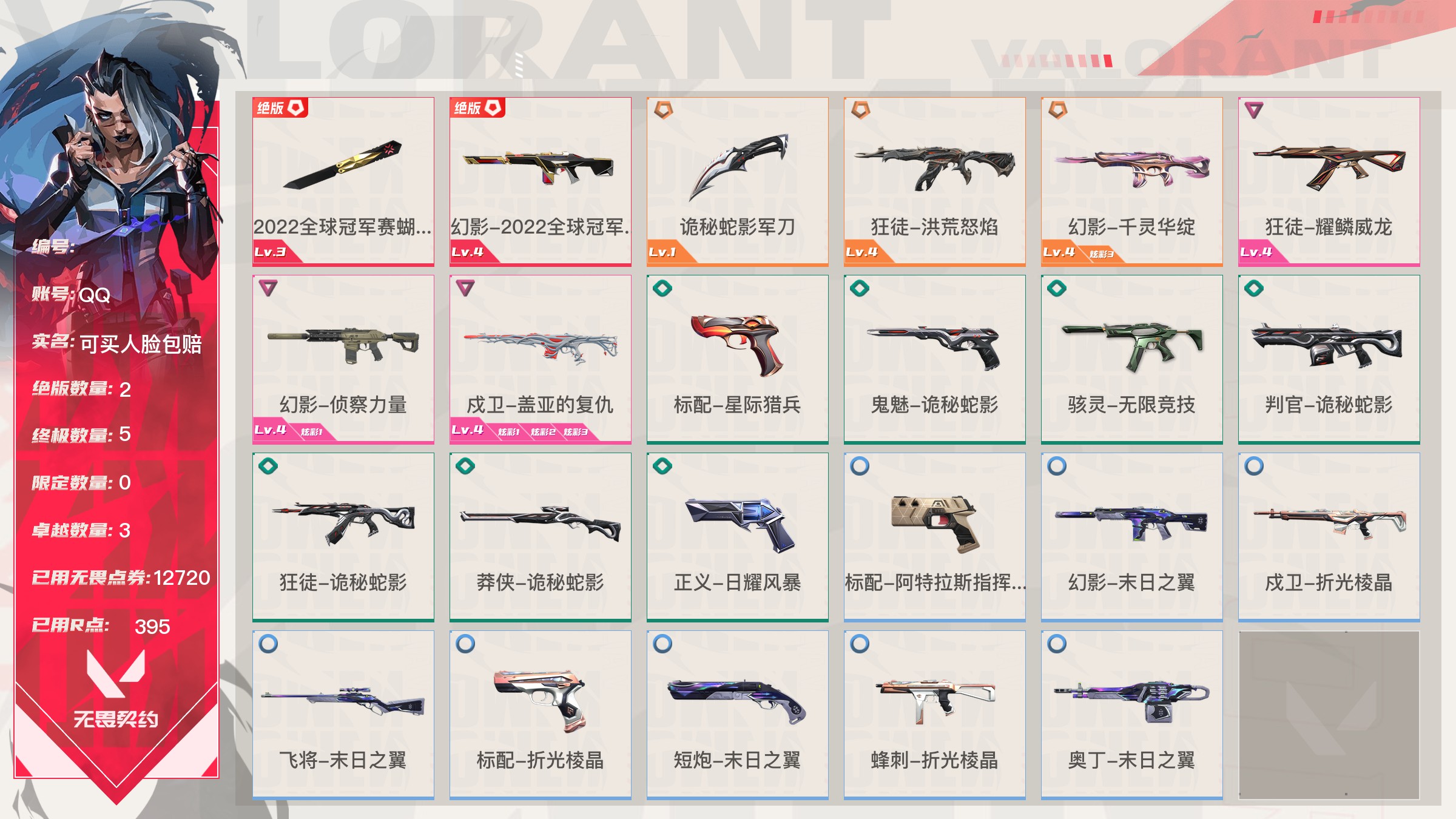 无畏契约【端游】Lv187|未定级, 刀皮数量21,枪皮数量154(绝版6