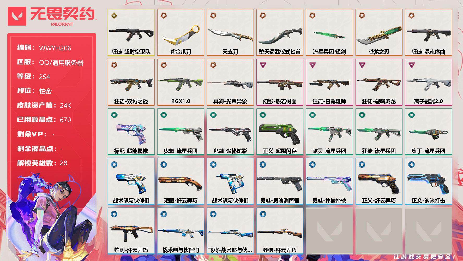 无畏契约【端游】终极*9/传奇*1/卓越*4/皮肤*34/等级*254/段位:铂金/