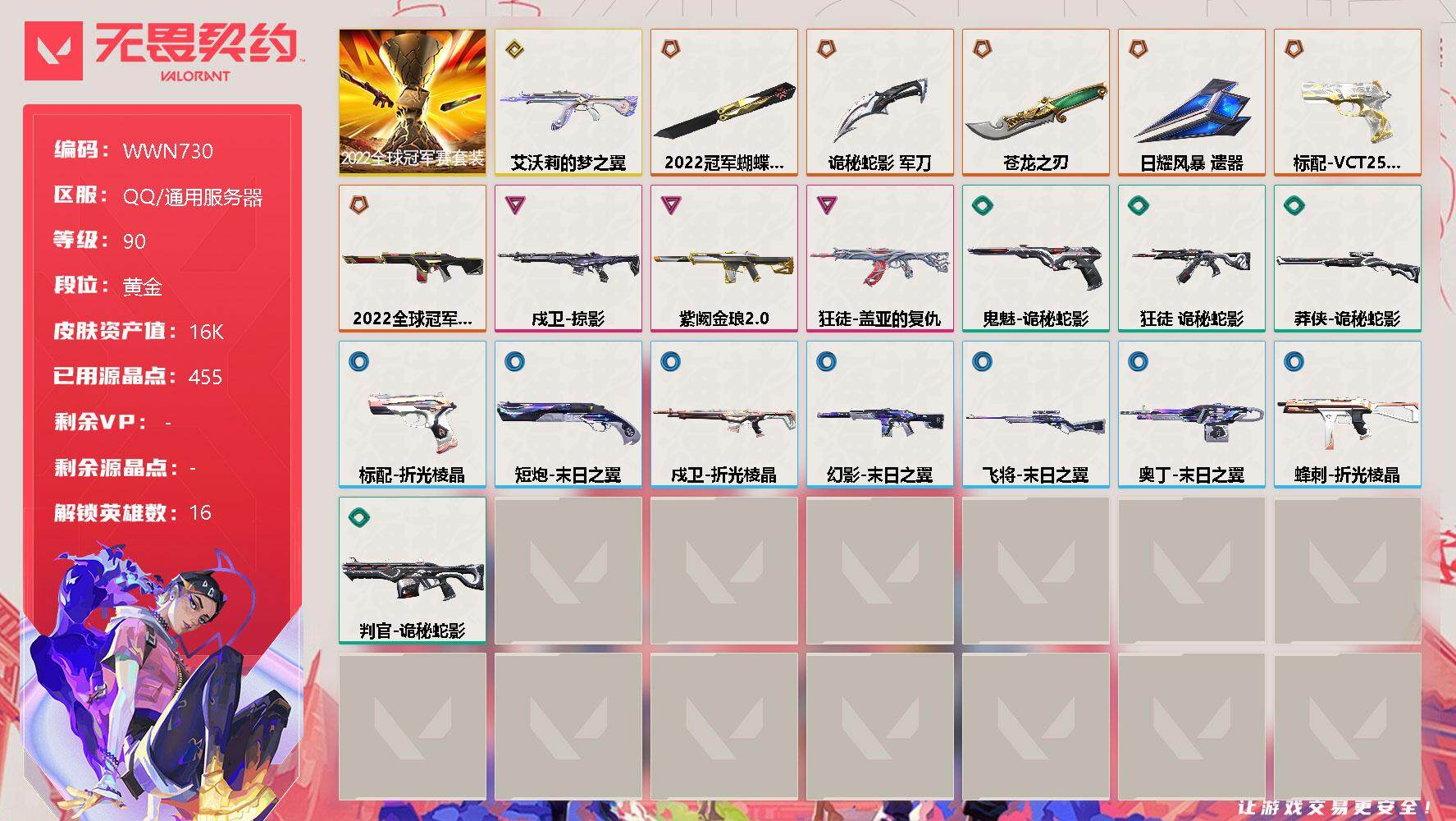 无畏契约【端游】终极*6/传奇*1/卓越*3/皮肤*35/等级*90/段位:黄金/