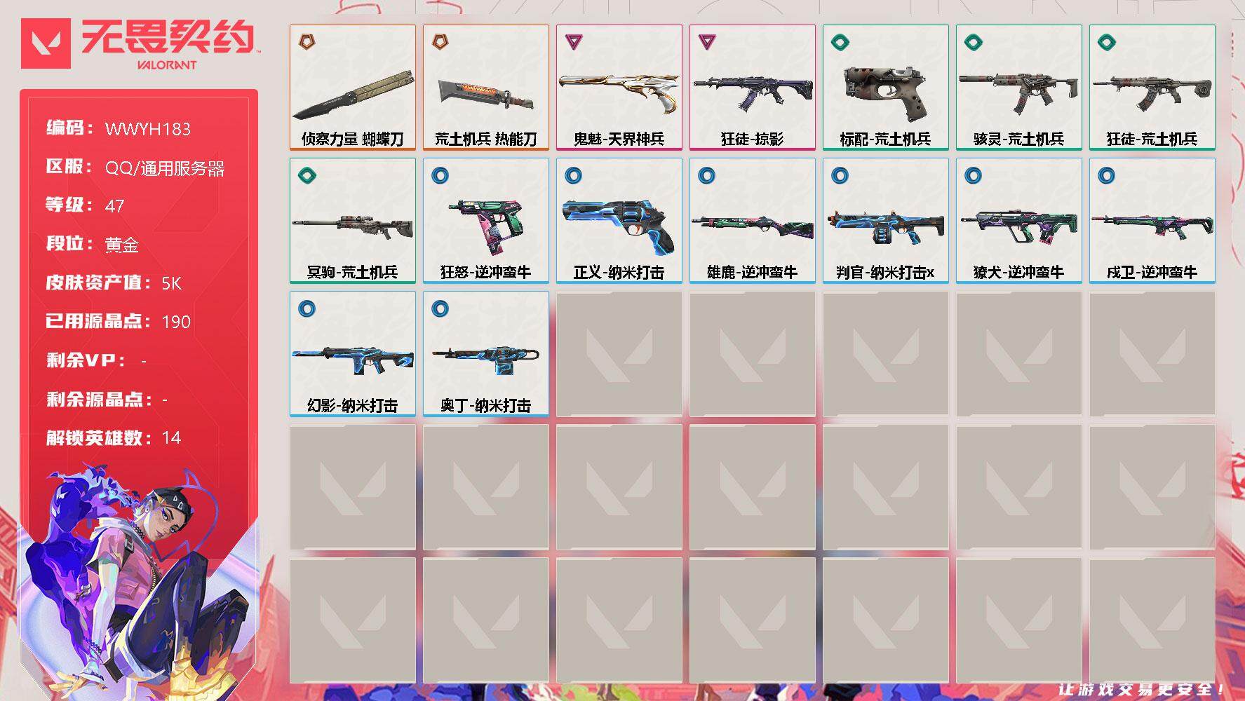 无畏契约【端游】终极*5/卓越*1/皮肤*19/等级*47/段位:黄金/
