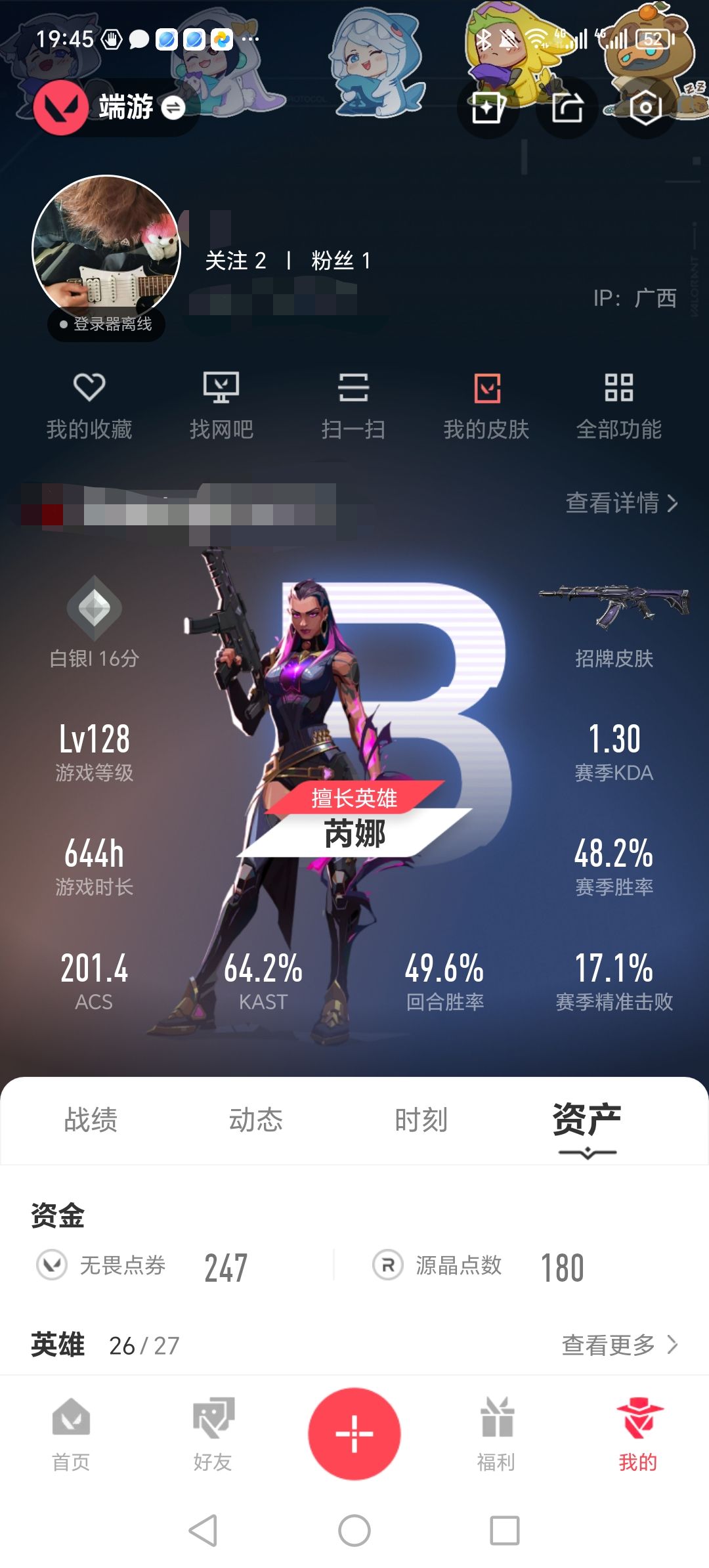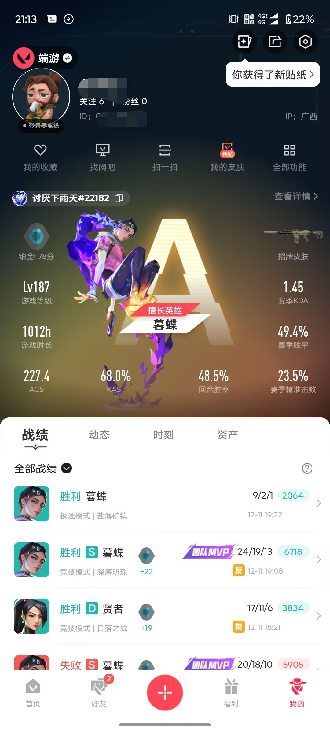 【游戏等级】Lv187 【段位】 铂金I 【R点】1,045