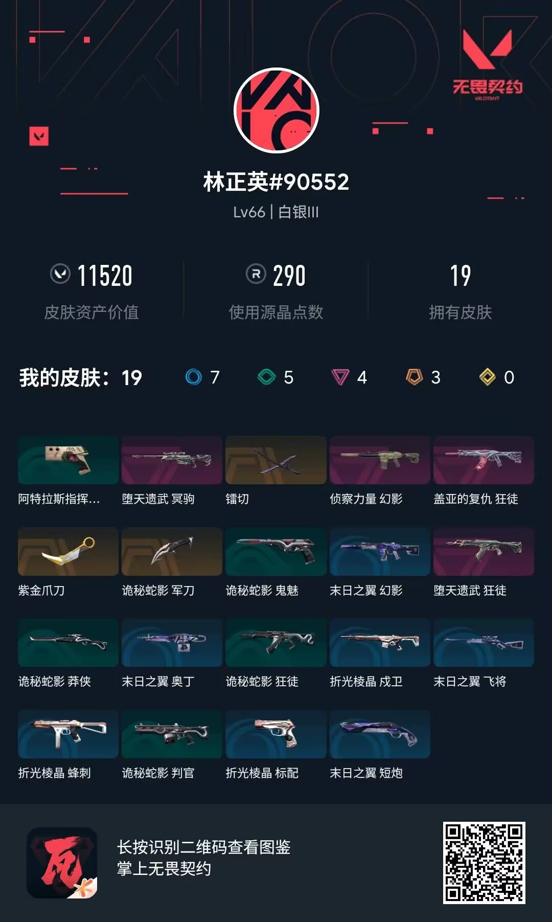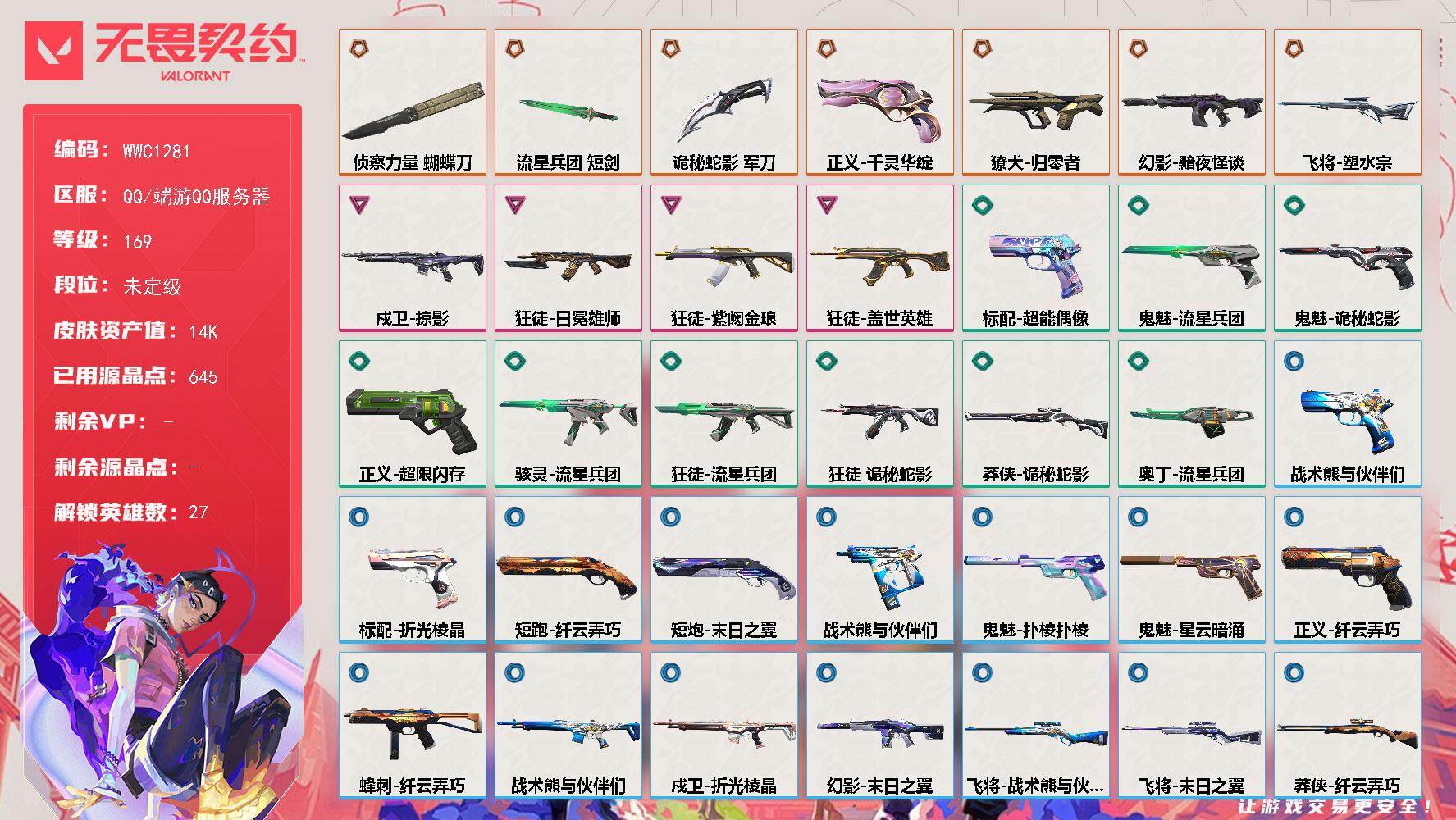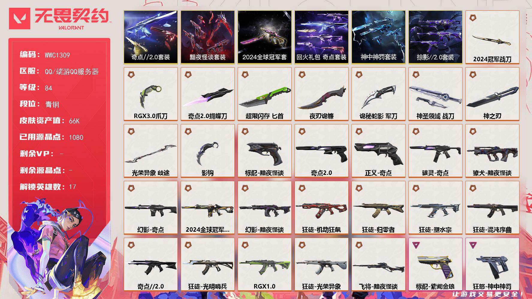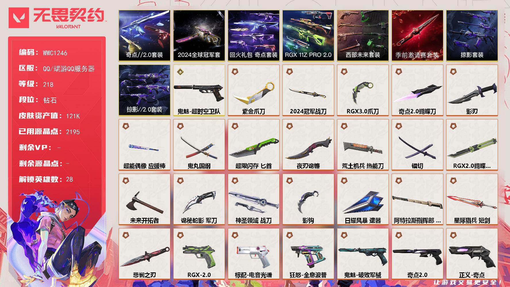 终极*56/传奇*1/卓越*19/皮肤*183/等级*218/段位:钻石/2024全球冠军赛套装/无畏契约季前邀请赛套装/