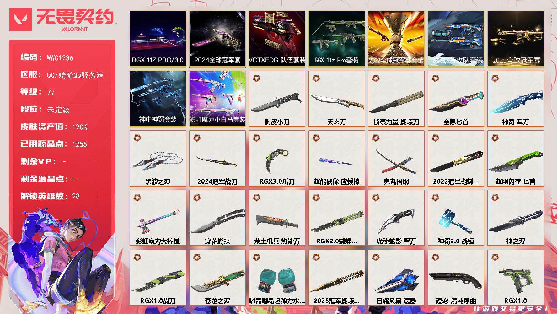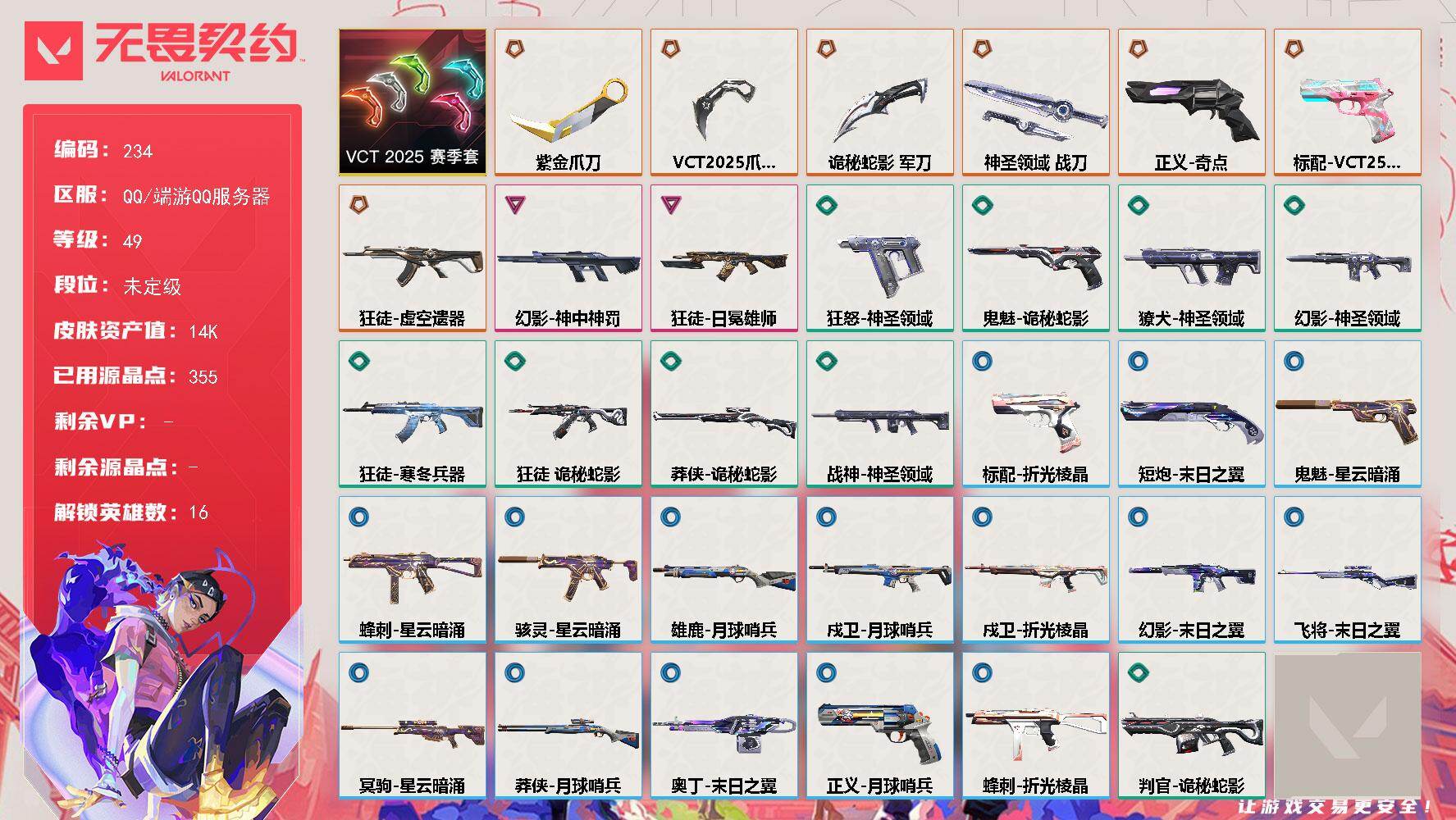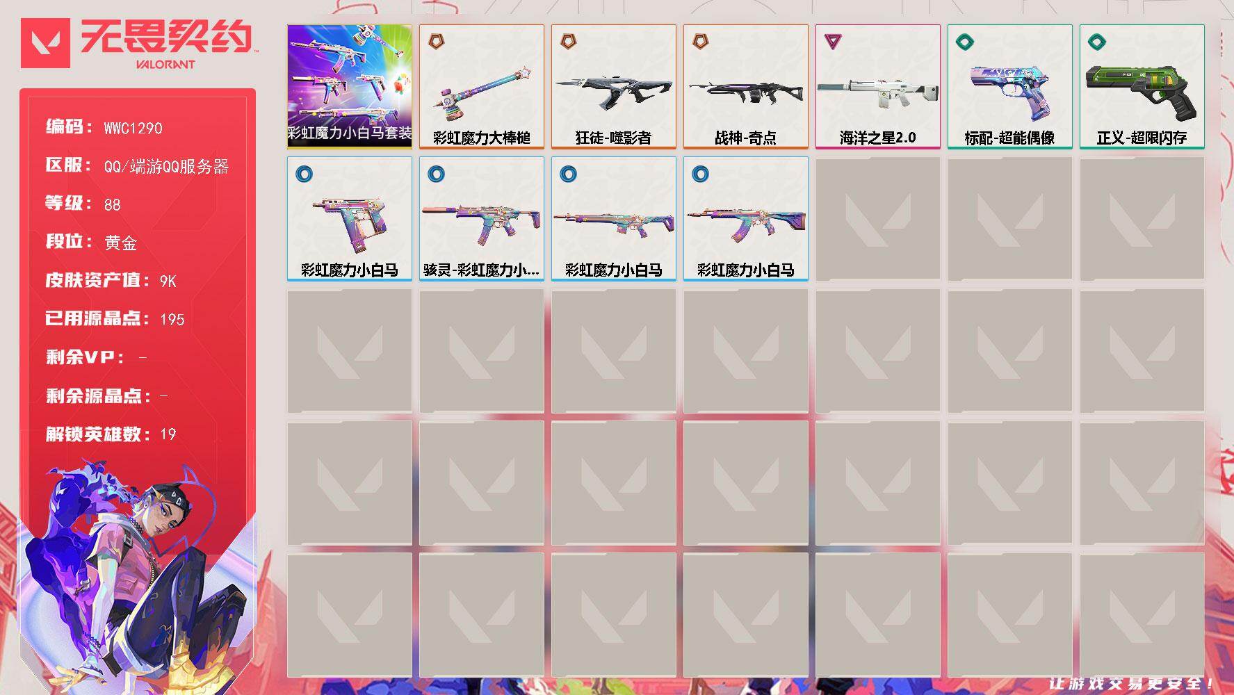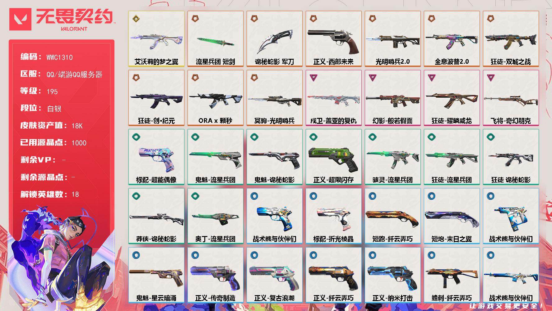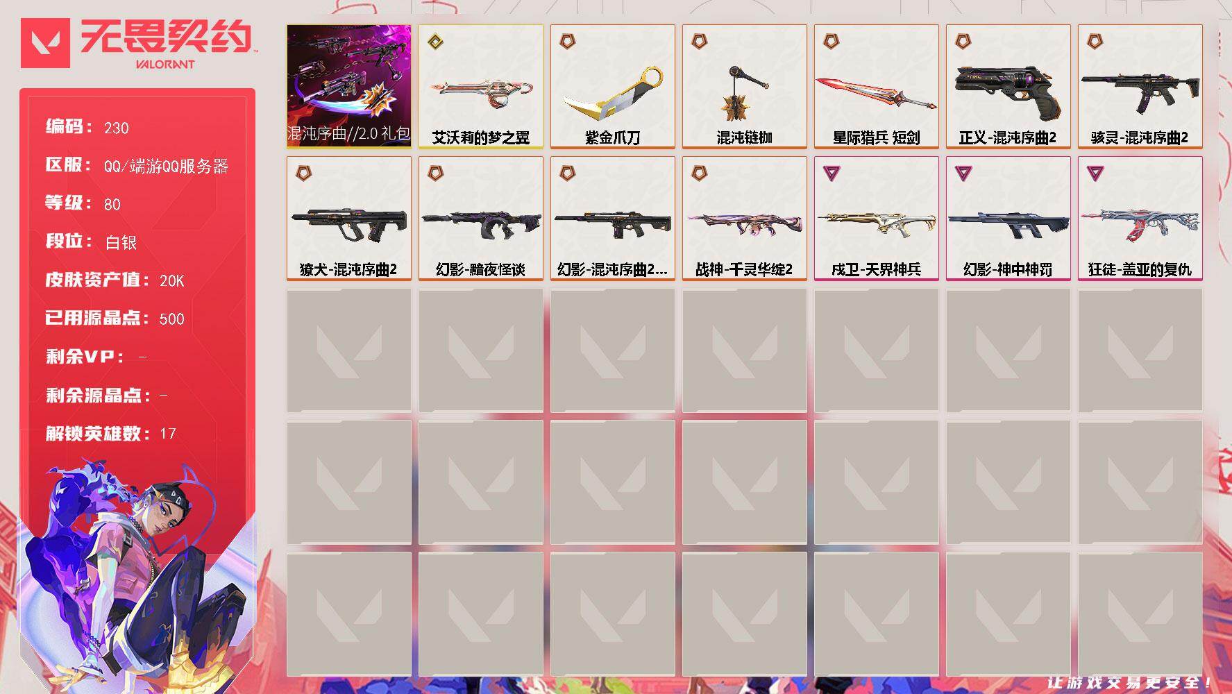 终极*9/传奇*1/卓越*3/皮肤*72/等级*336/段位:青铜/无畏契约季前邀请赛套装/