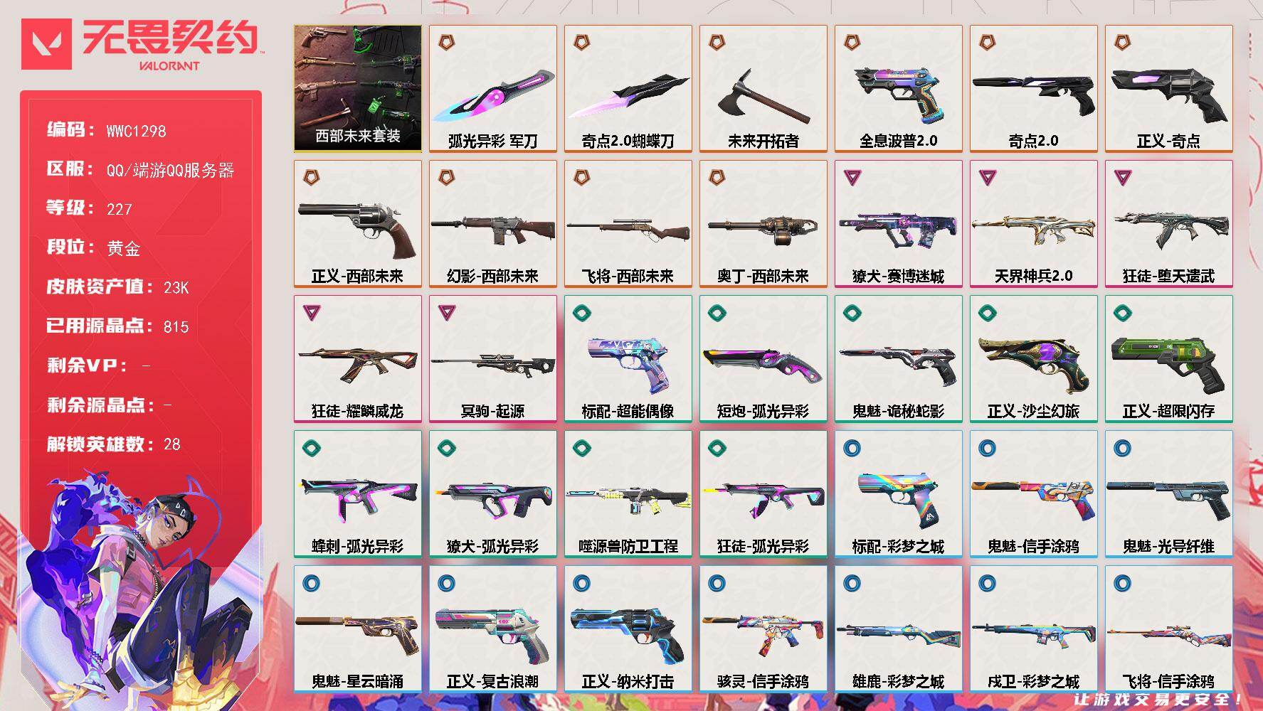 终极*10/卓越*5/皮肤*38/等级*227/段位:黄金/西部未来套装/幻棱/炼狱/