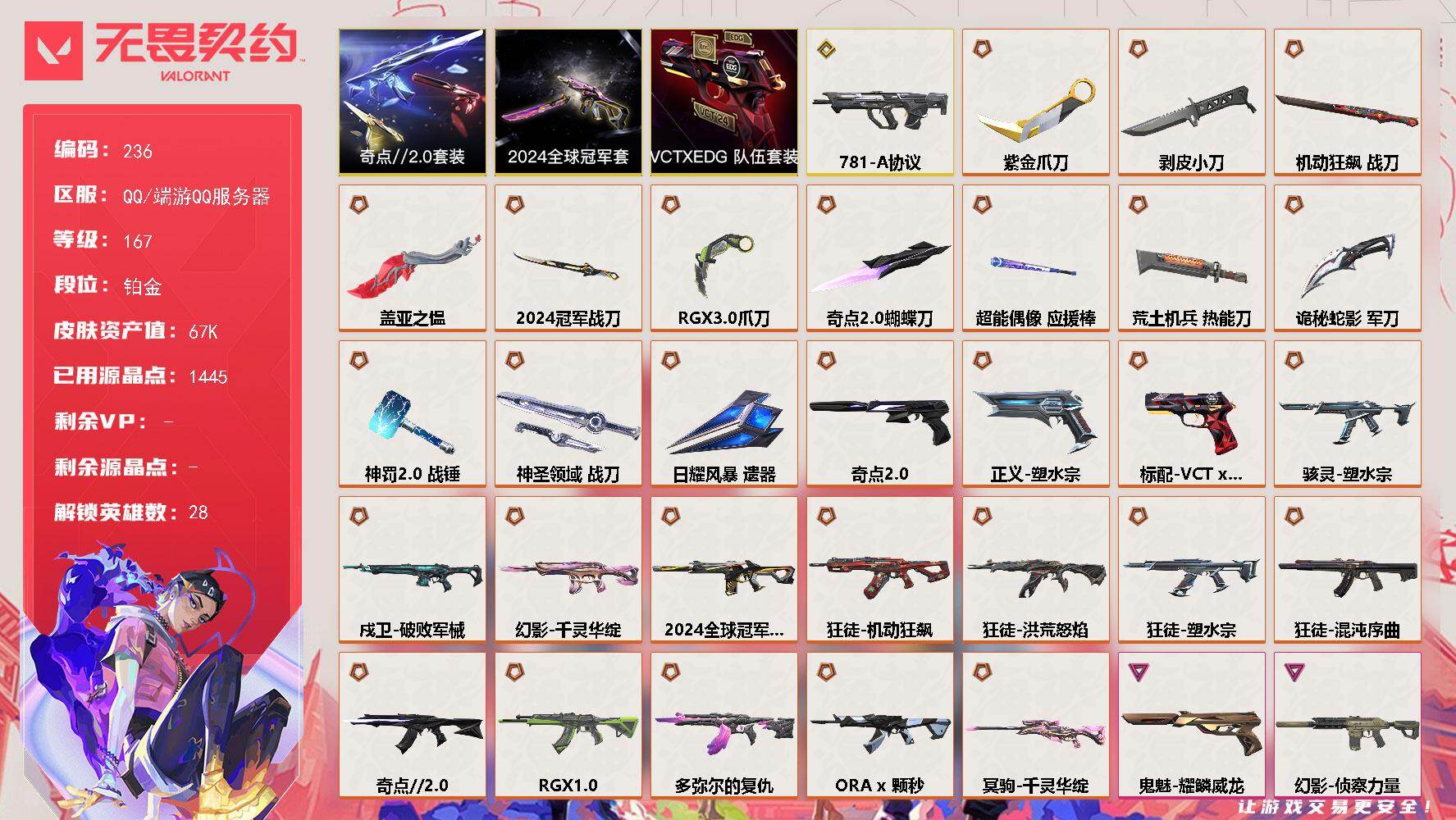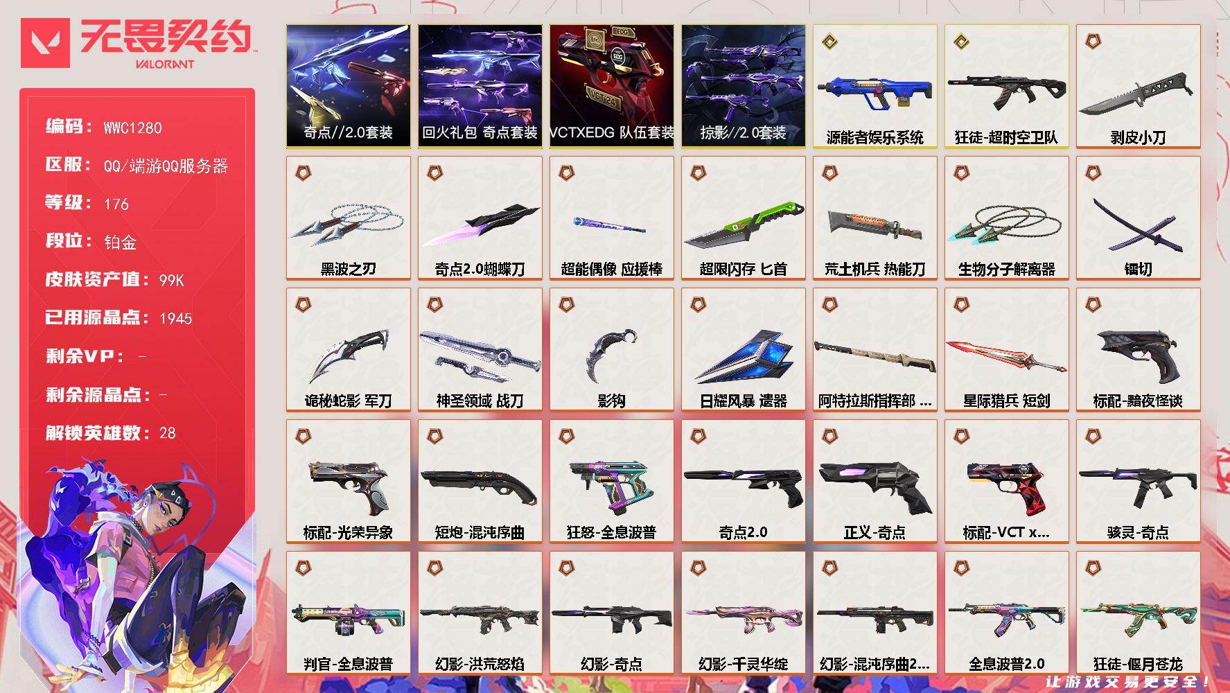 终极*41/传奇*2/卓越*25/皮肤*185/等级*176/段位:铂金/奇点//2.0套装/VCTxEDG 队伍套装/回火礼包:奇点套装/