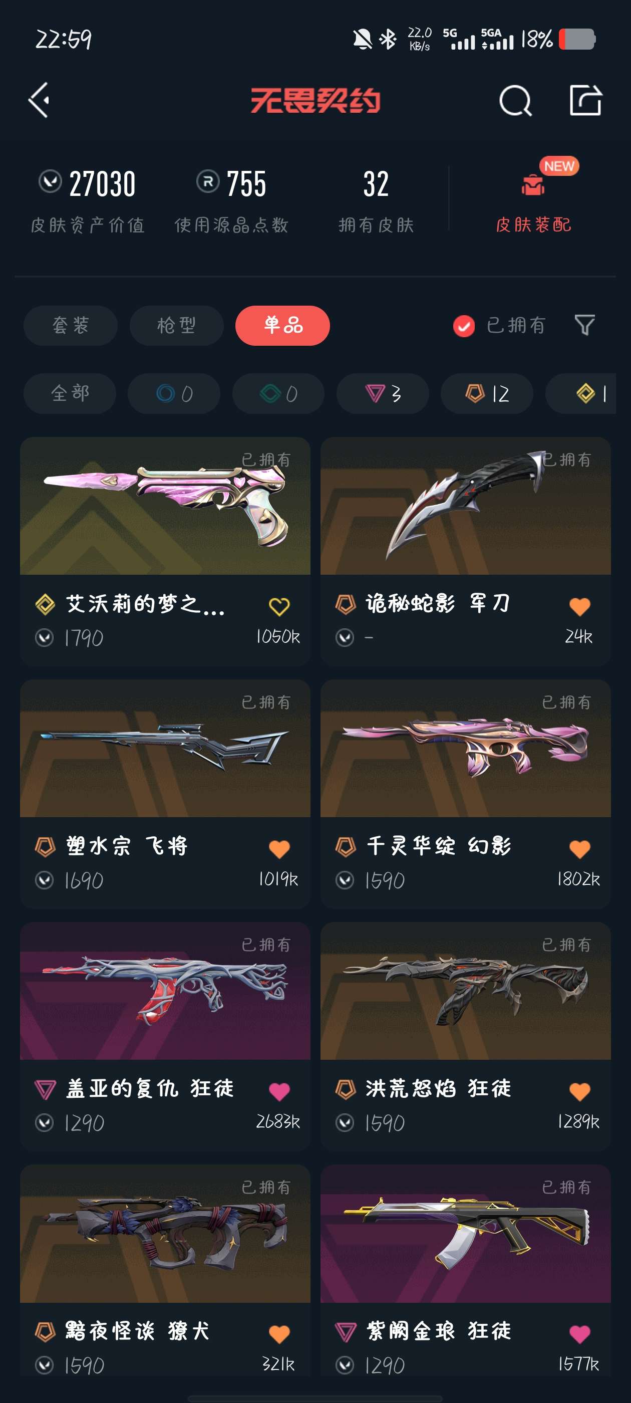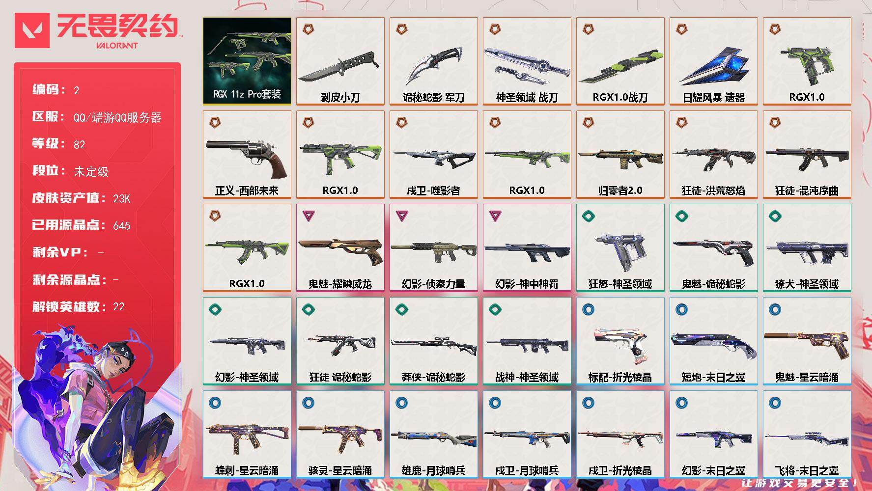 终极*1/卓越*1/皮肤*4/等级*57/段位:黄金/无畏契约季前邀请赛套装