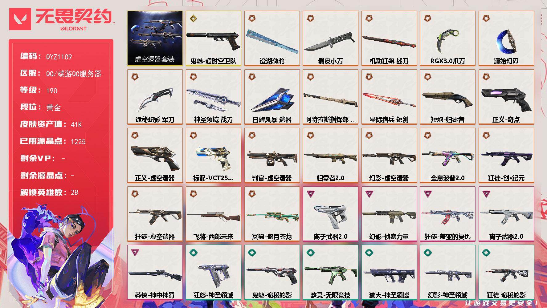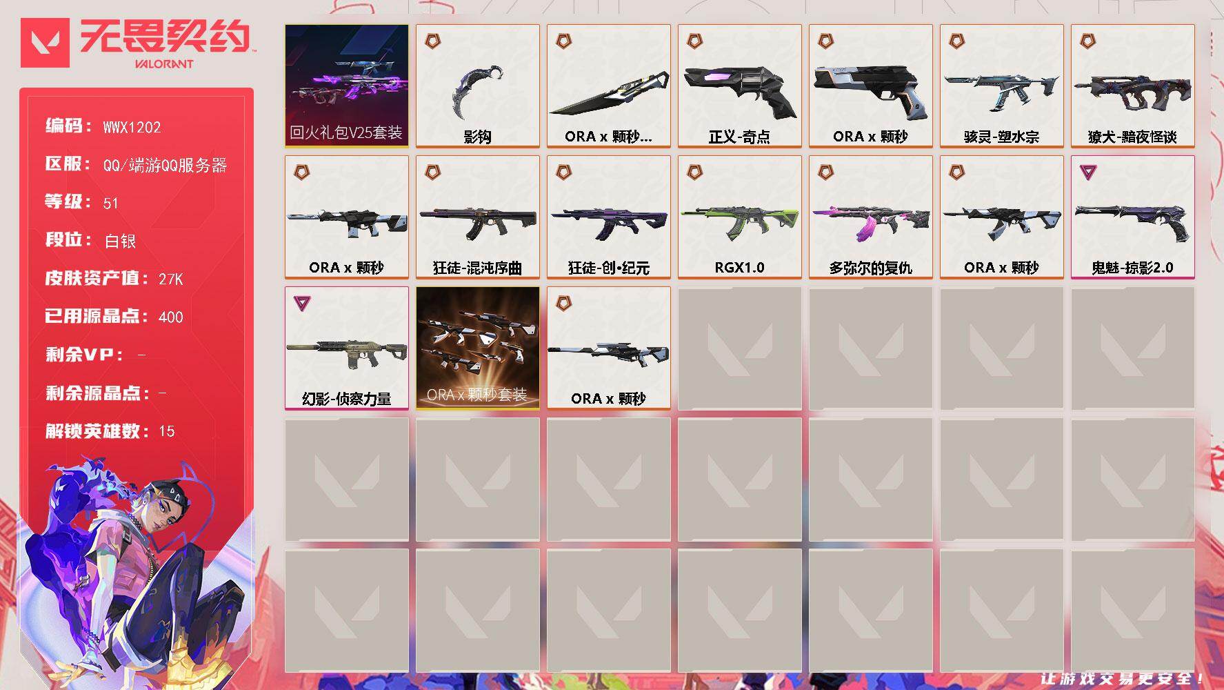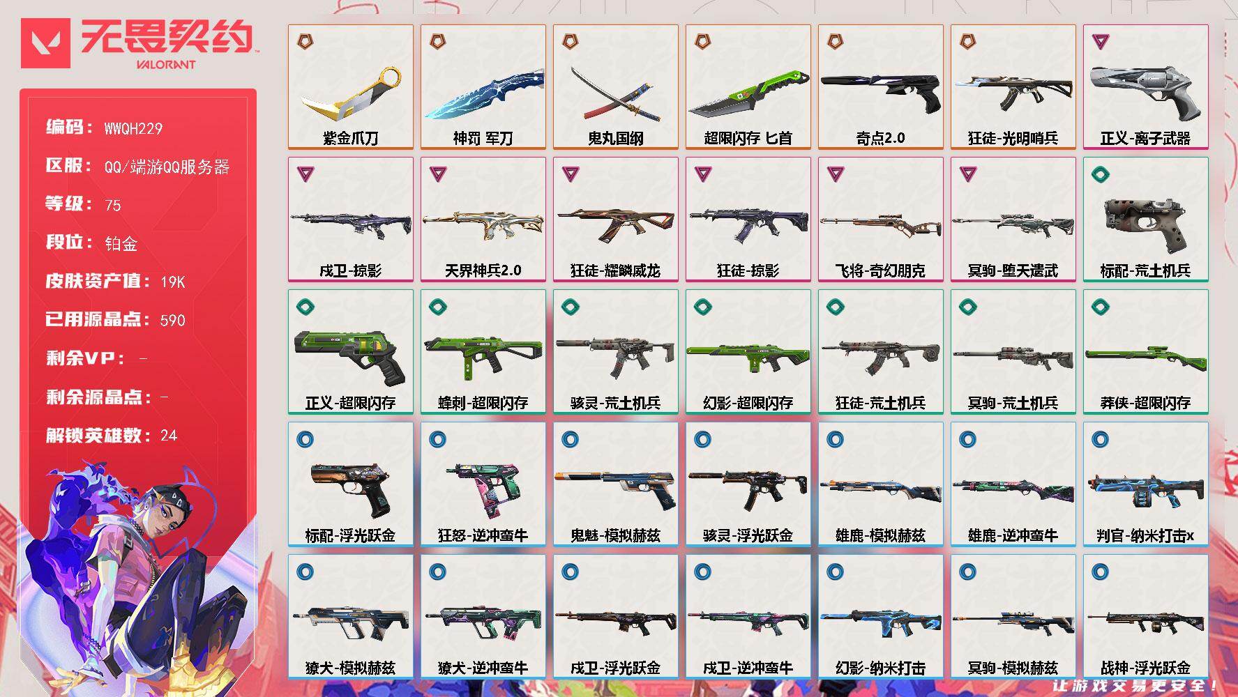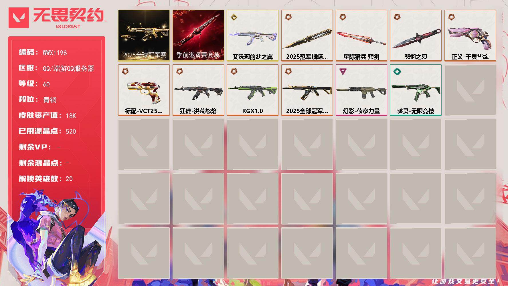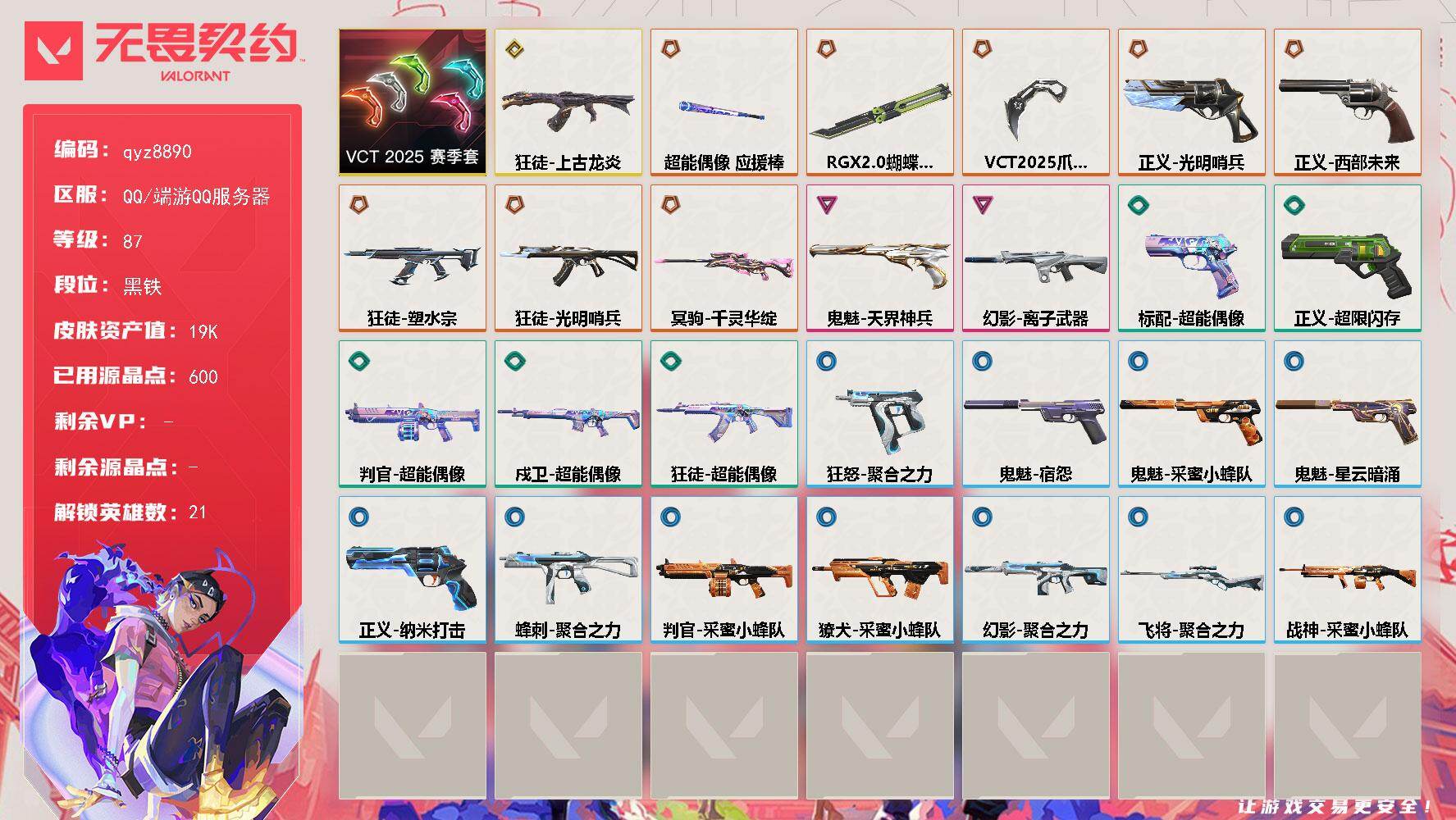 终极*13/卓越*6/皮肤*81/等级*295/段位:铂金/VCT 2025 赛季套装