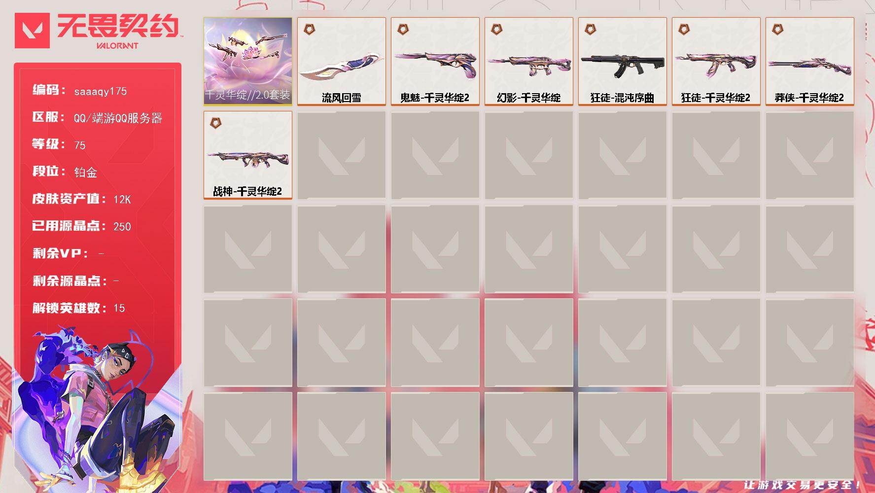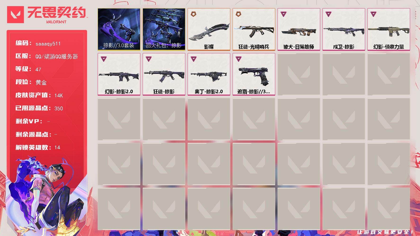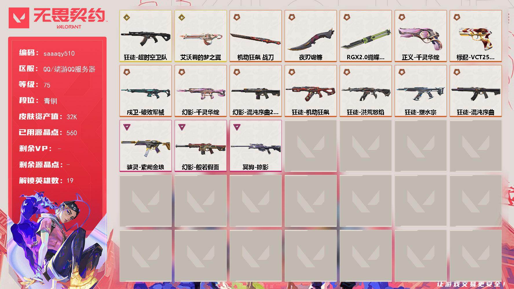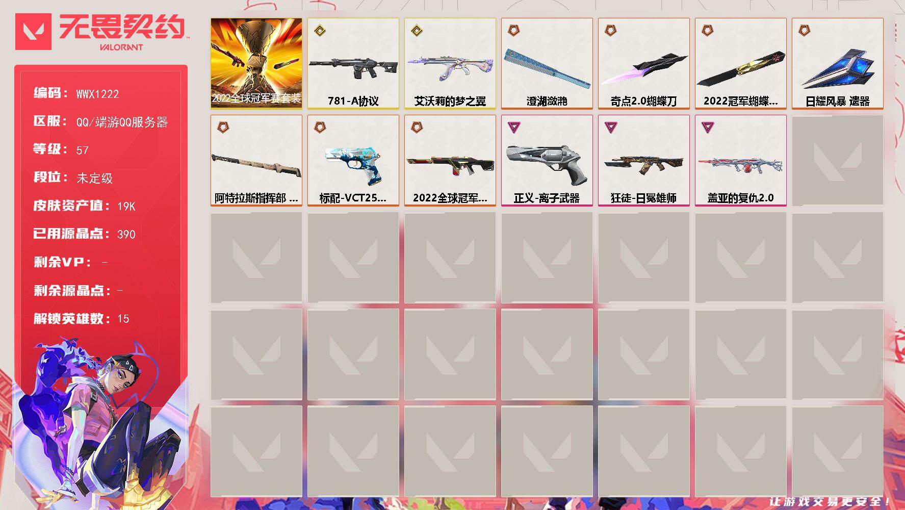 卓越*1/皮肤*1/等级*21/段位:未定级/炼狱/暮蝶/壹决/捷风/不死鸟