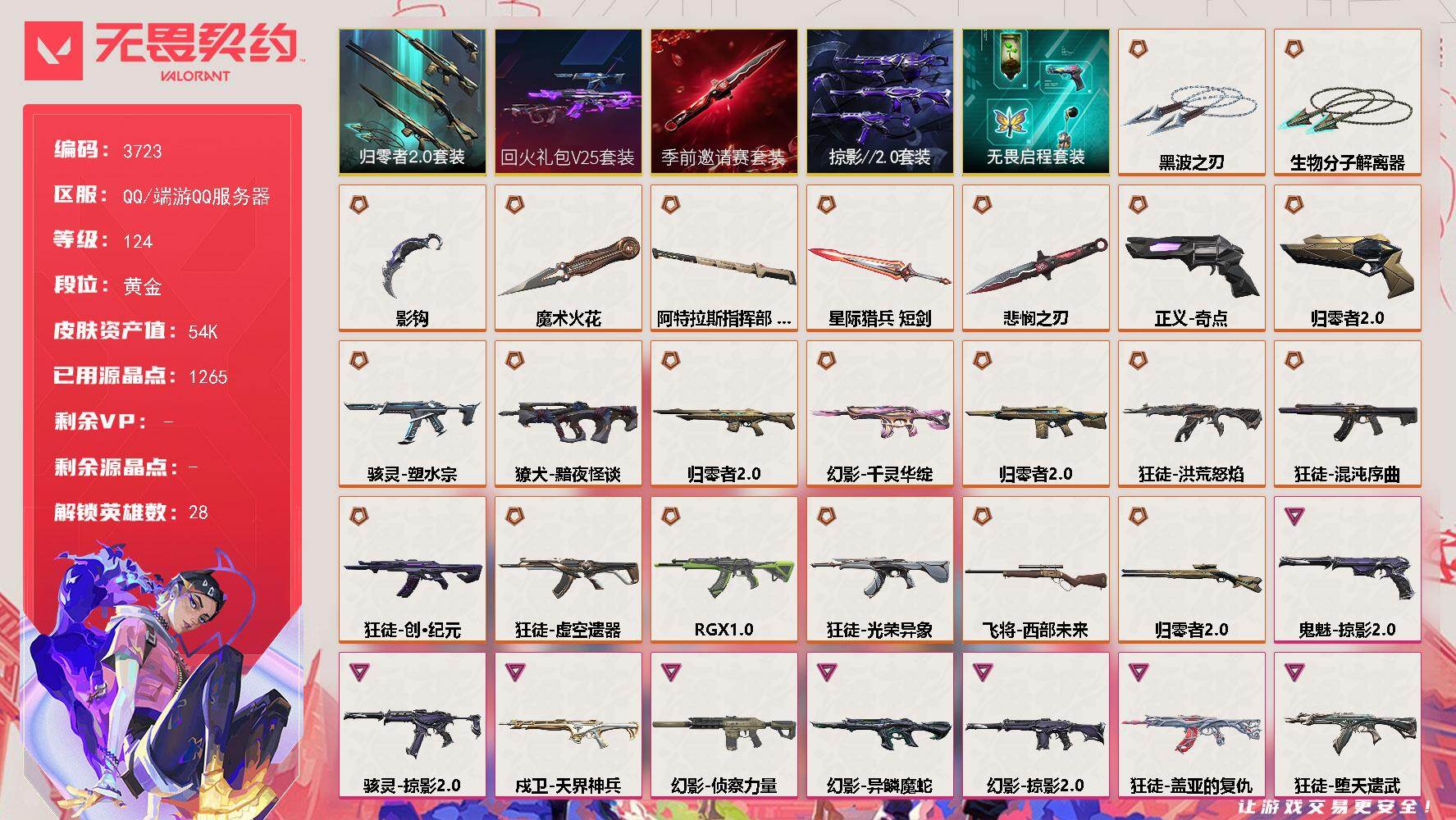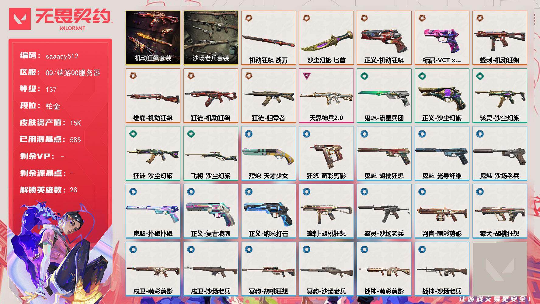 终极*1/卓越*1/皮肤*2/等级*27/段位:黑铁/幻棱/炼狱/暮蝶/壹决/捷风/不死鸟