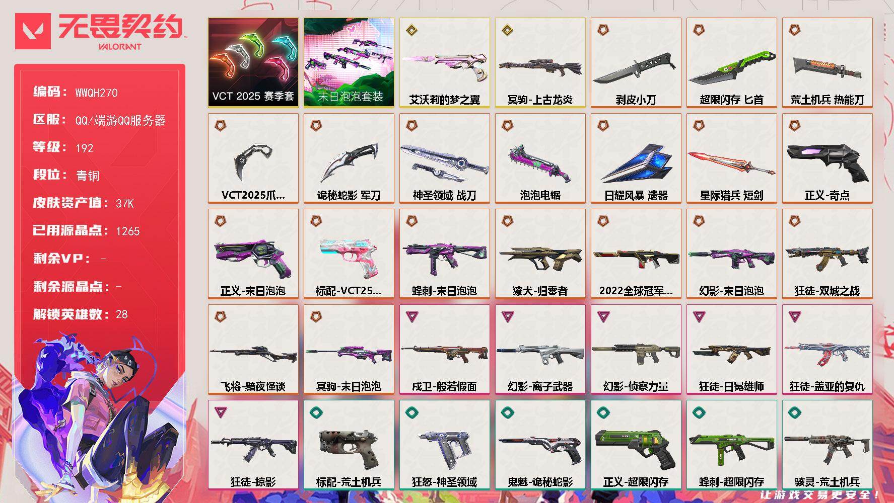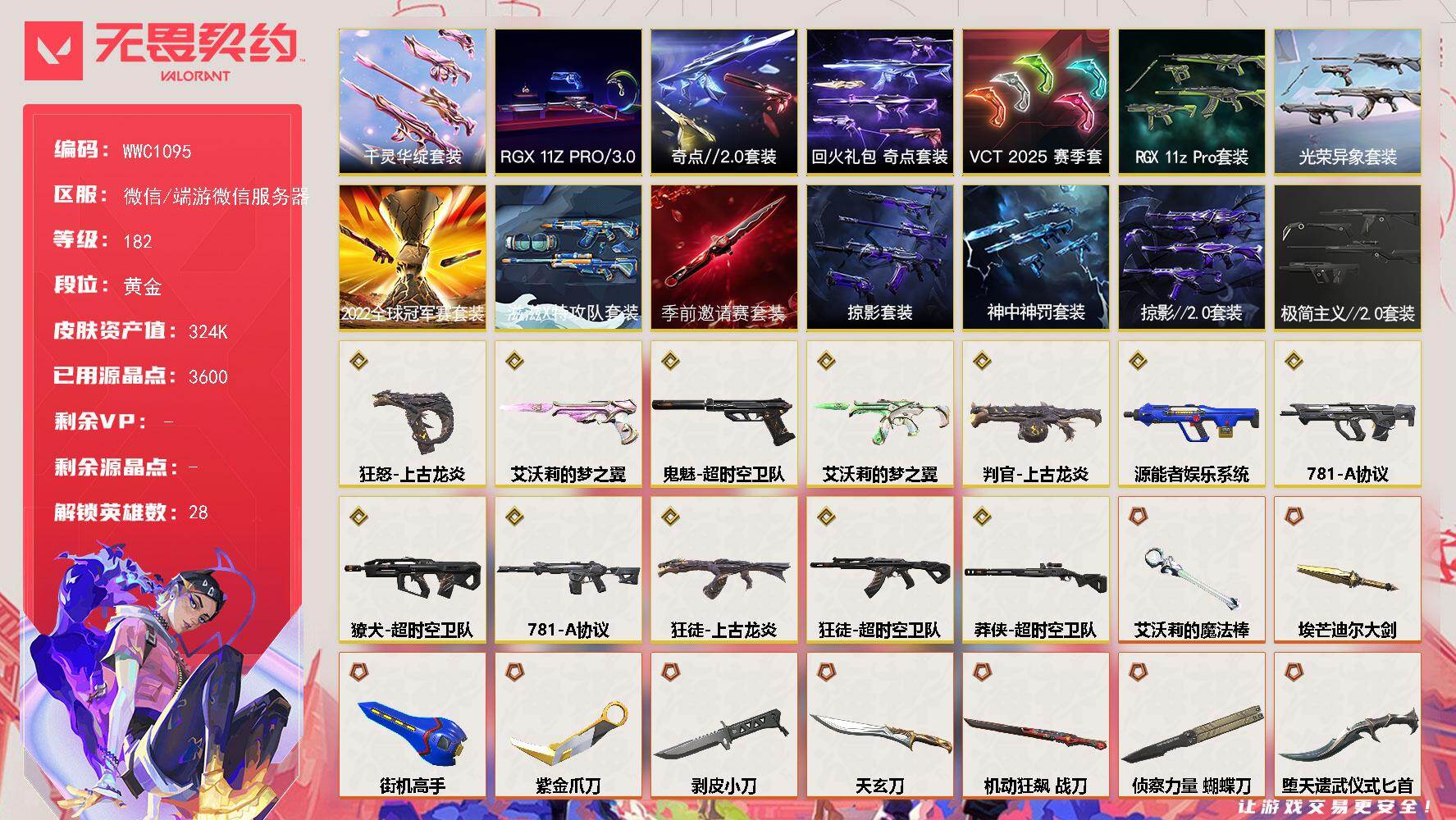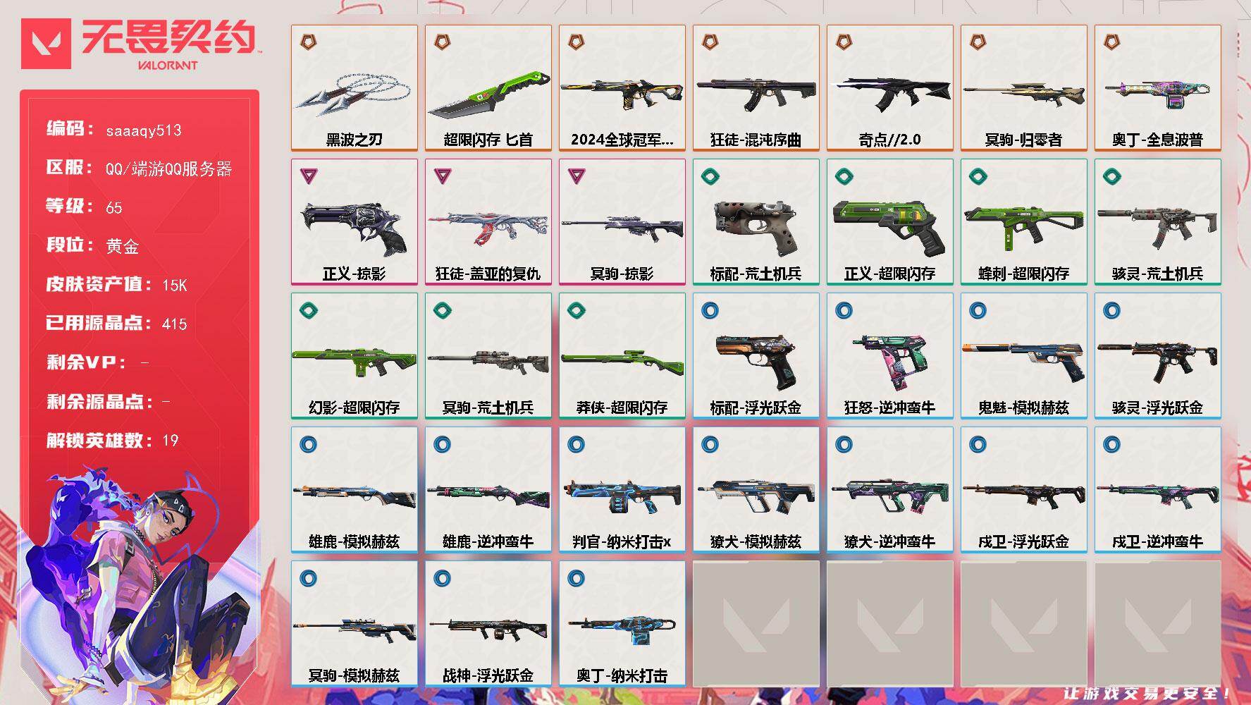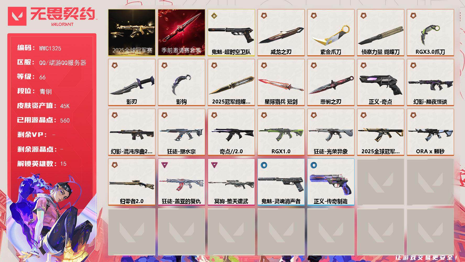 终极*19/传奇*2/卓越*2/皮肤*57/等级*66/段位:青铜/2025全球冠军赛套装