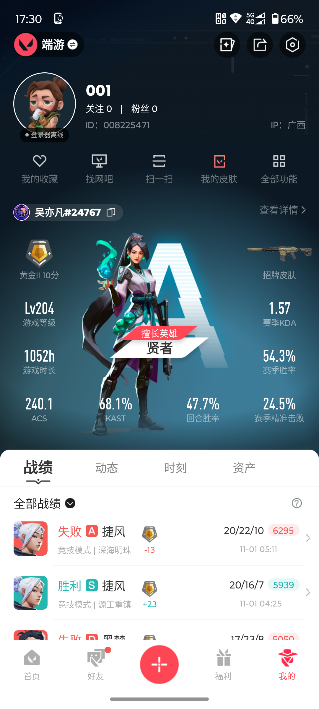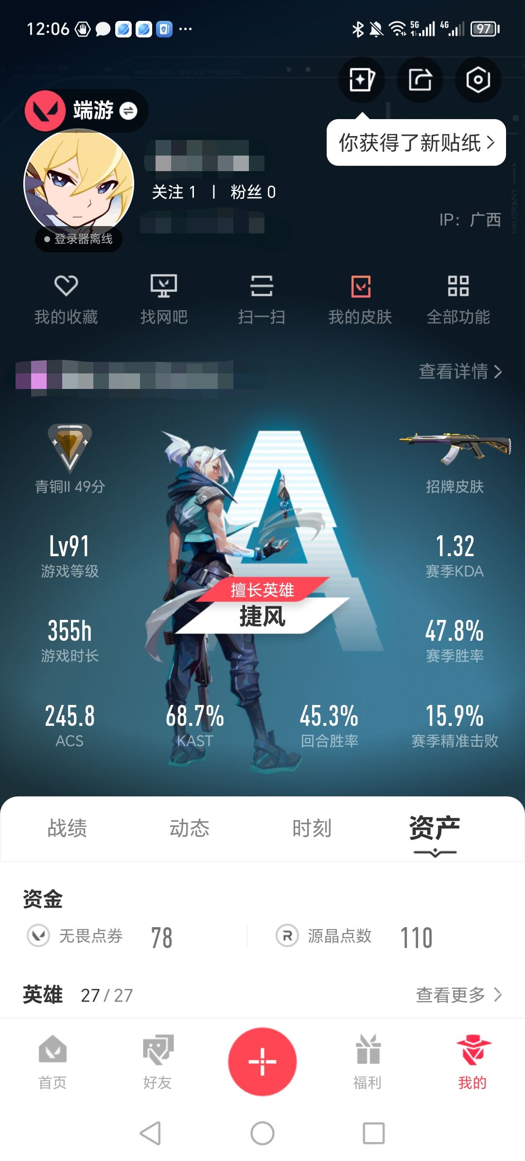 【游戏等级】Lv123 【段位】 青铜II 【R点】690 【皮肤总价值】20,2