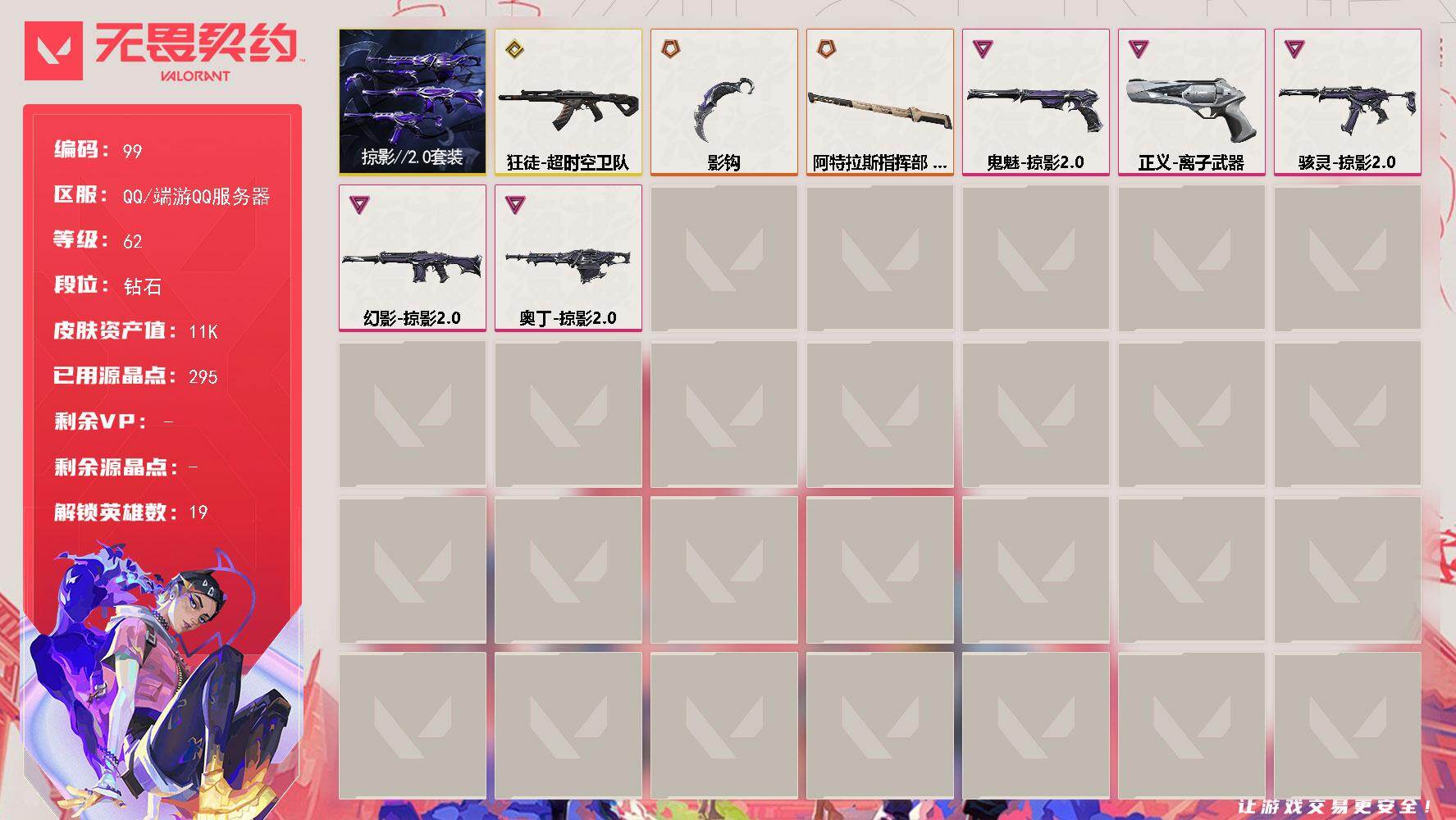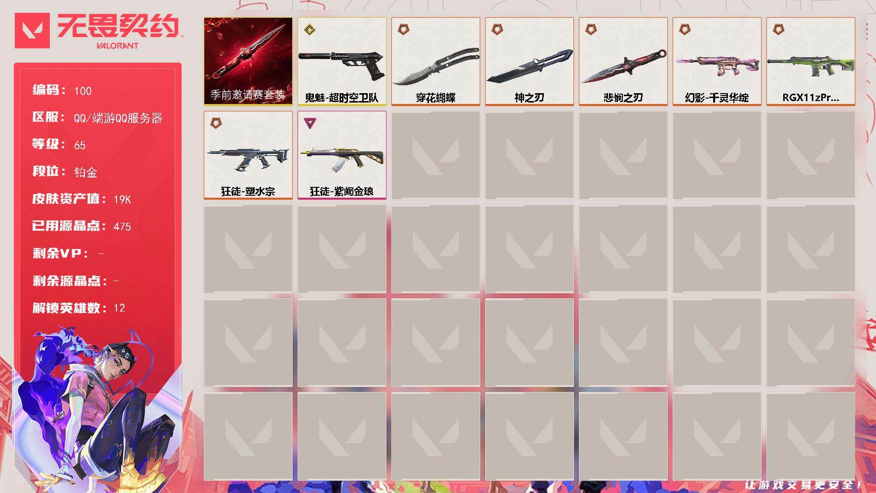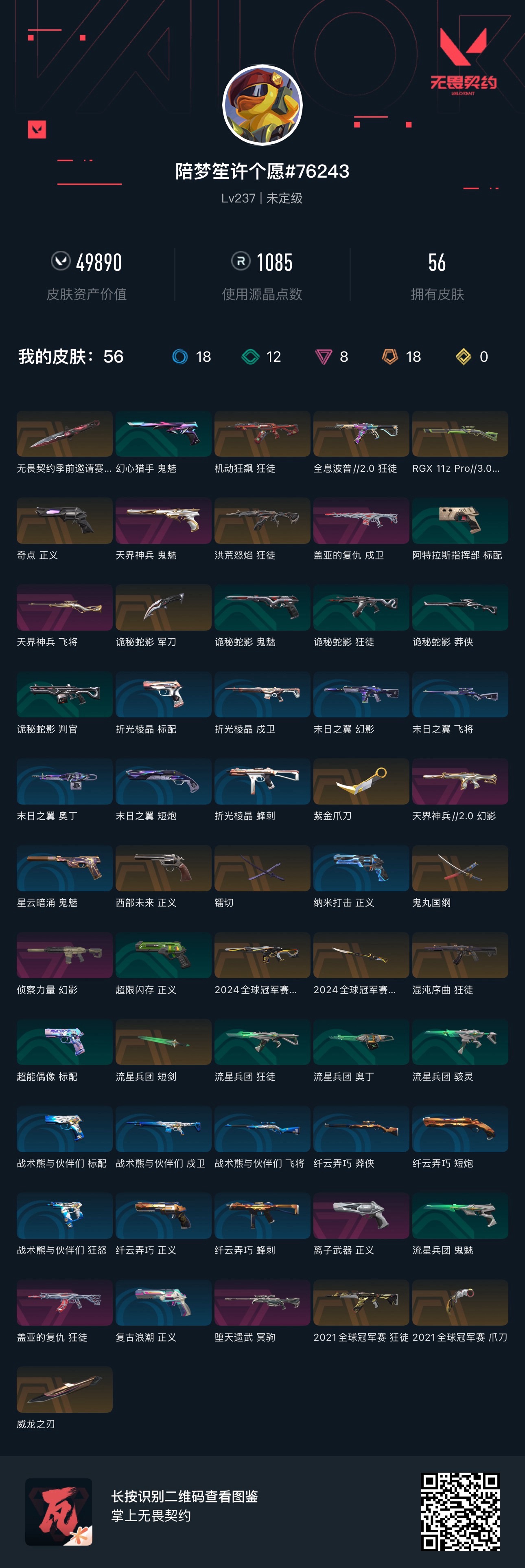 终极*1/卓越*1/皮肤*4/等级*57/段位:黄金/无畏契约季前邀请赛套装