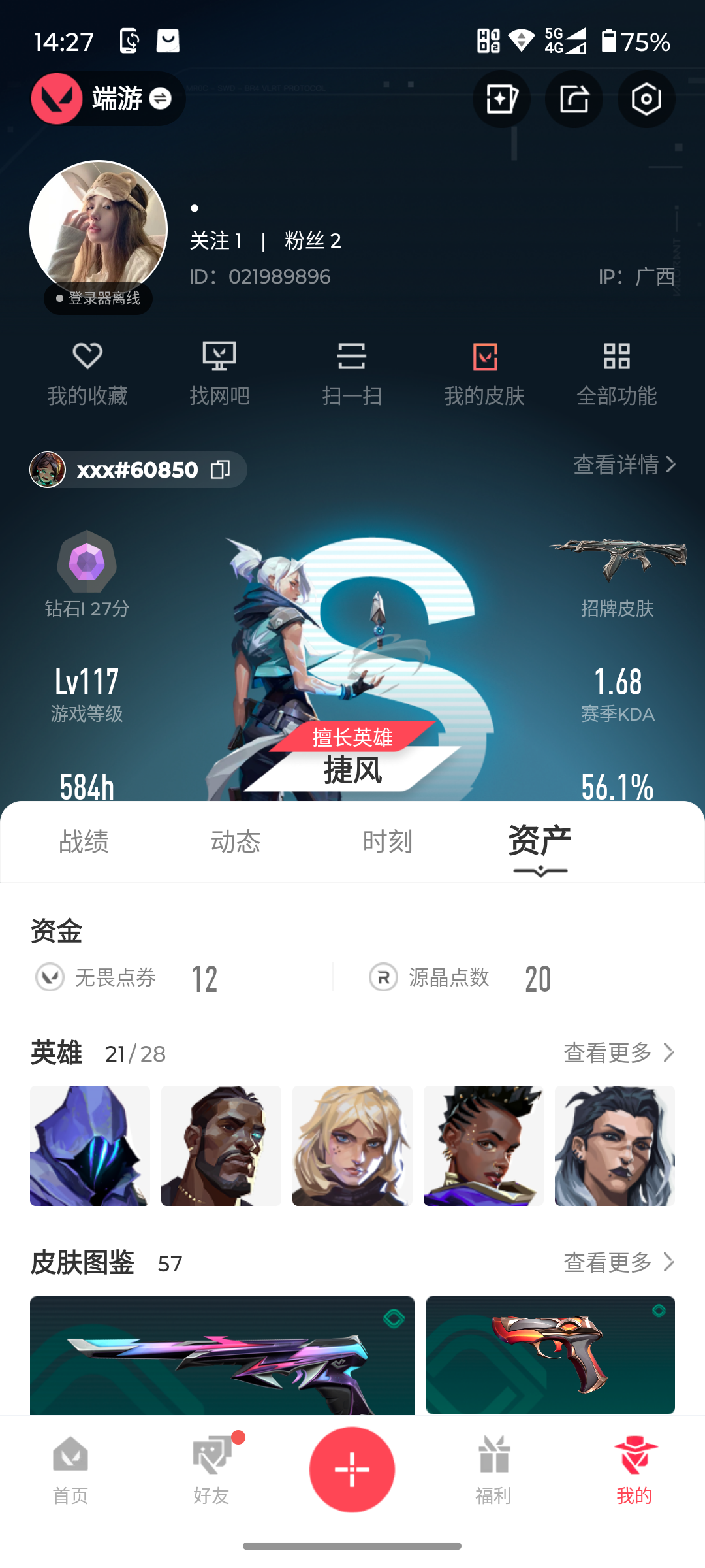 游戏等级:29-段位:白银-皮肤价值5670-已用源晶点数95