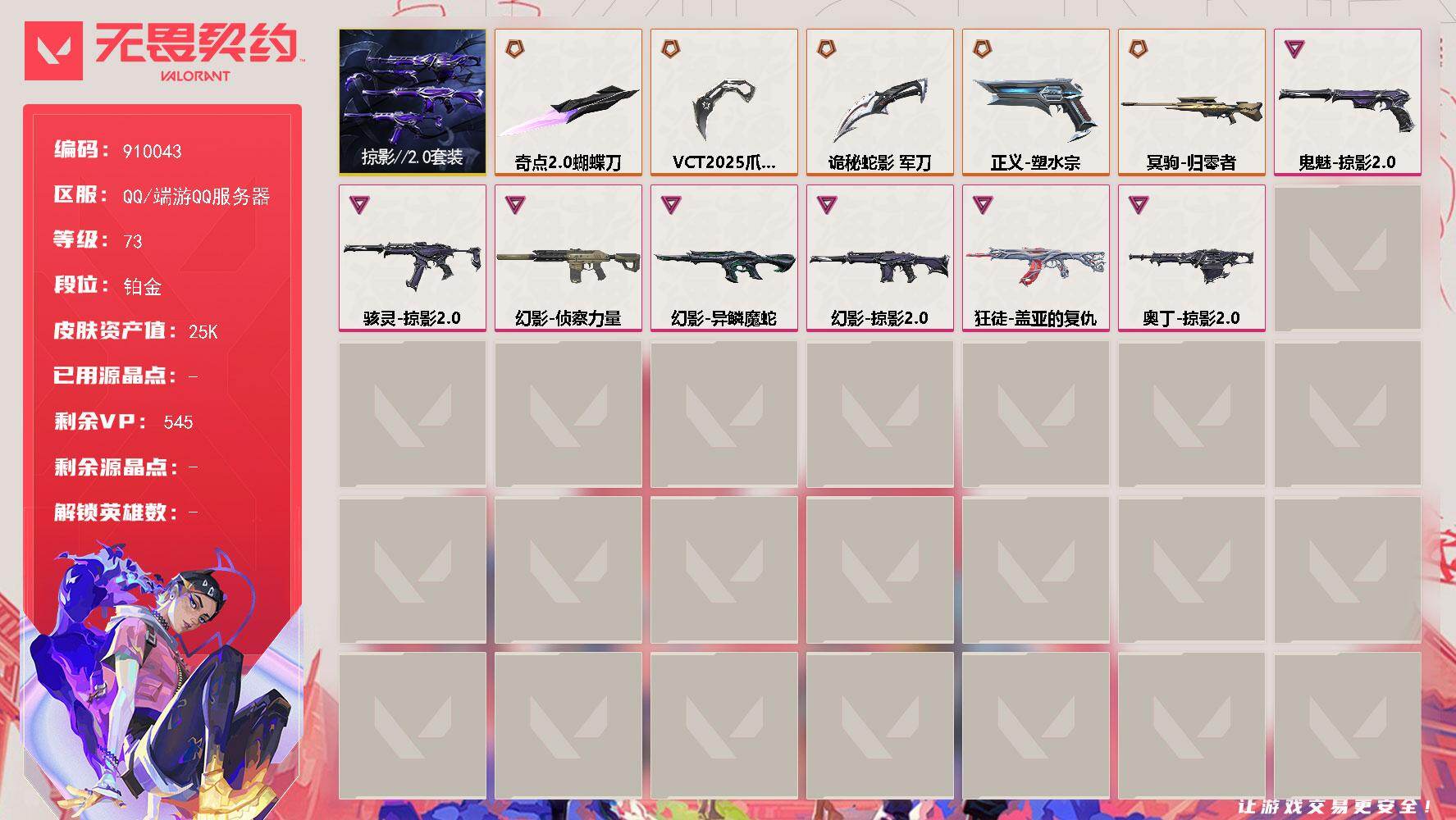 【28英雄 91皮肤 资产38140 VCT25爪刀 奇点2.0蝴蝶刀 剥皮小刀 澄