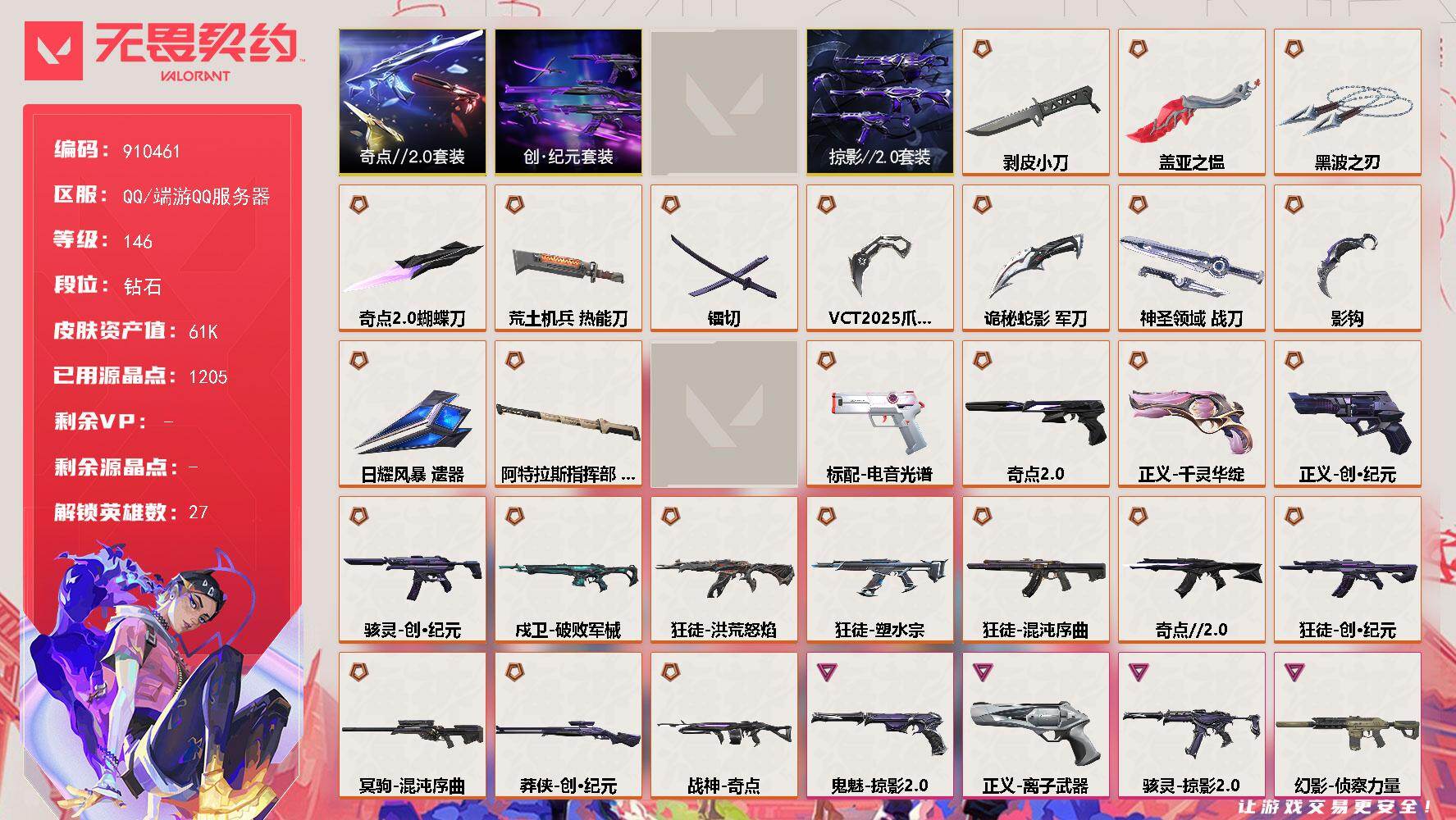 【28英雄 91皮肤 资产38140 VCT25爪刀 奇点2.0蝴蝶刀 剥皮小刀 澄