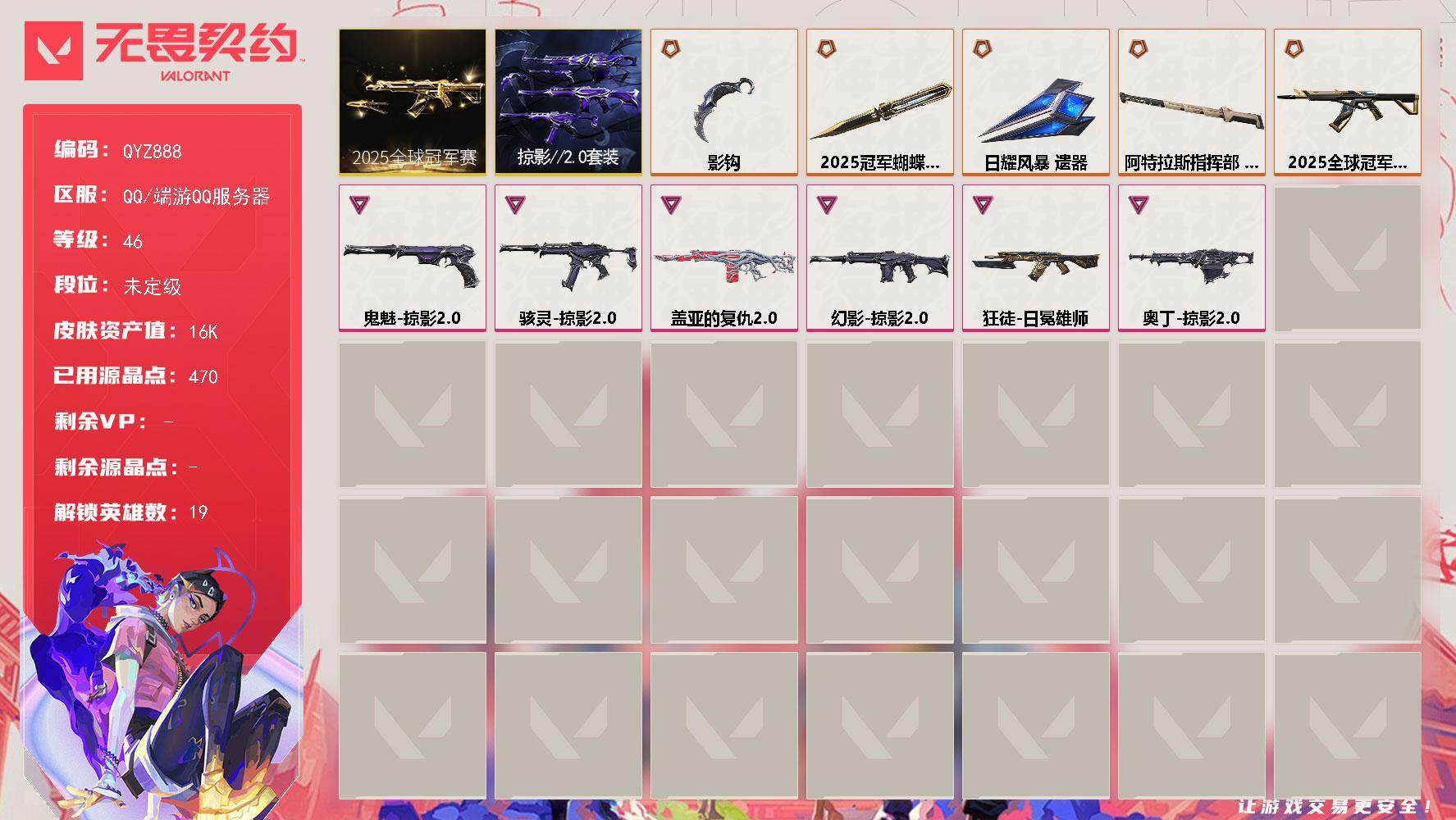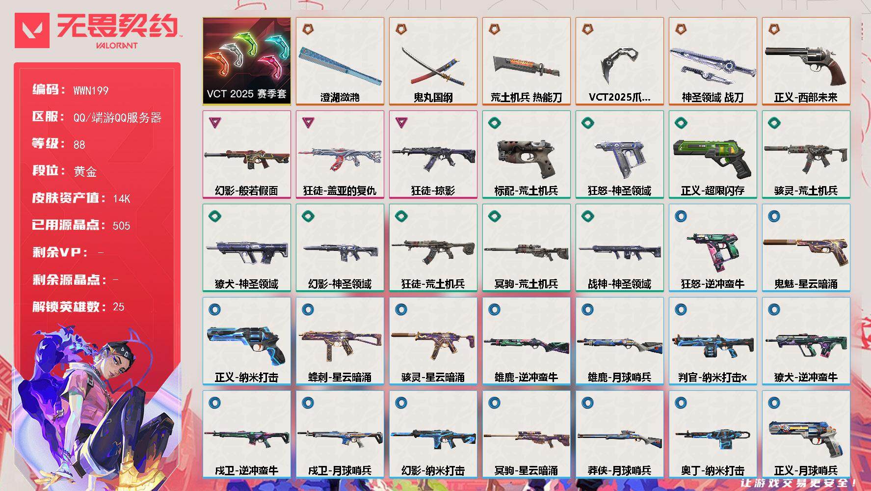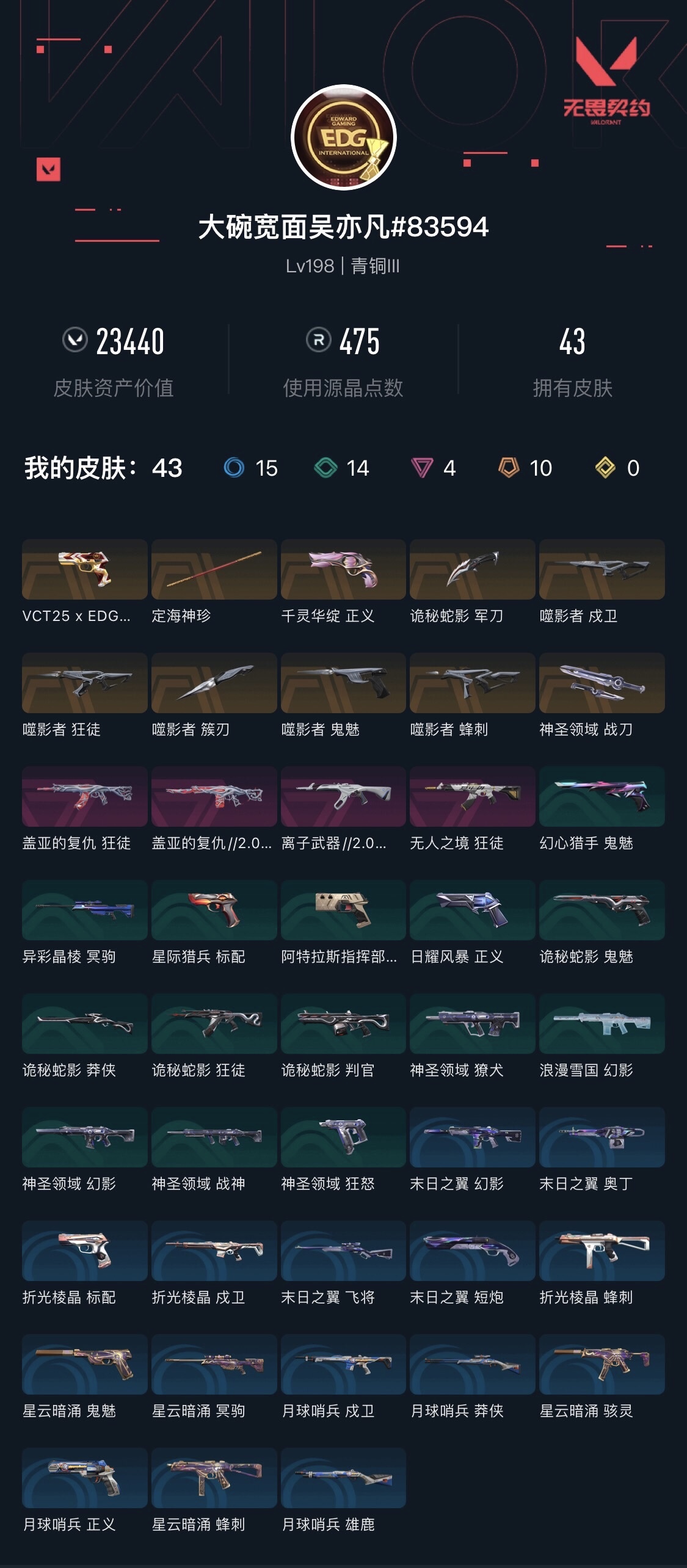 【游戏等级】Lv214 【段位】 铂金I 【R点】1,060 【皮肤总价值】34,570 【英雄数量】28 【皮肤数量】76 【挂饰数量】89 【卡面数量】125 【喷漆数量】109