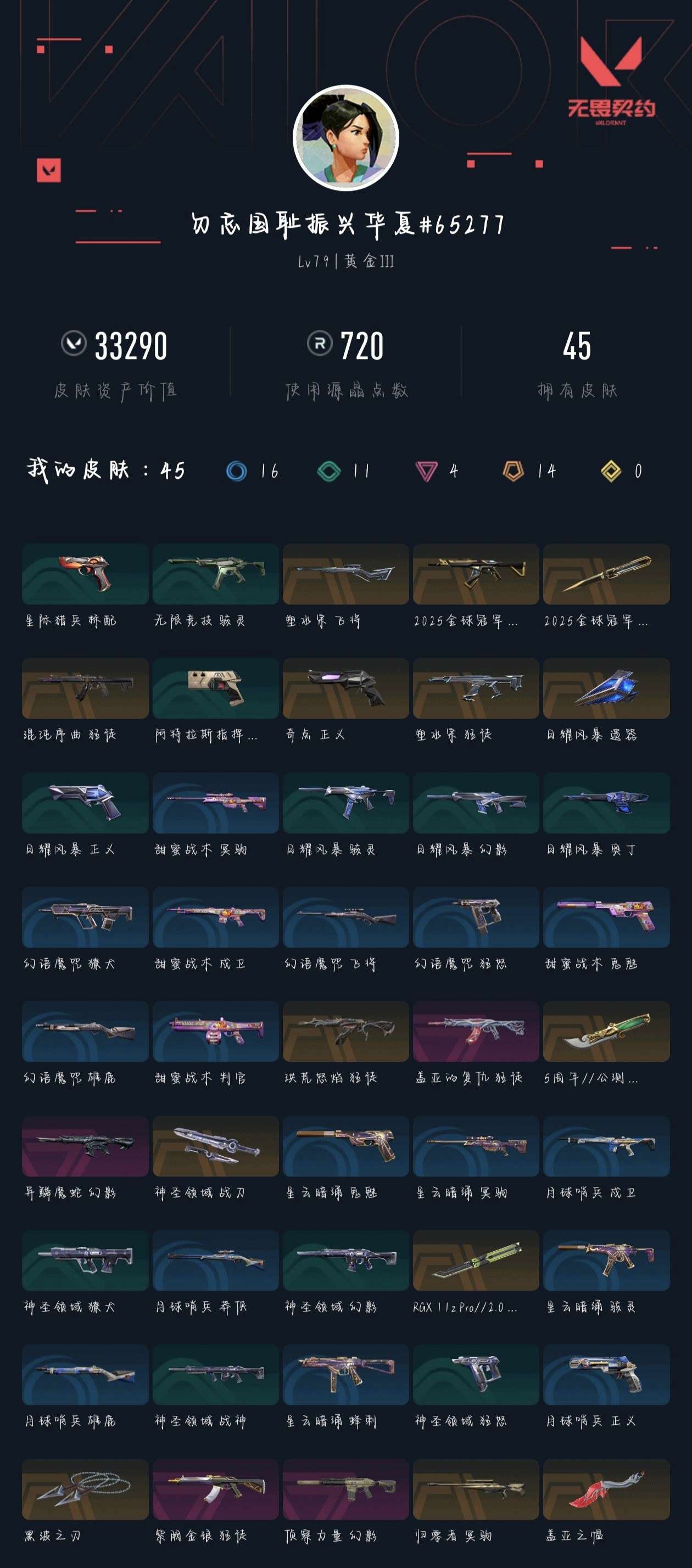 终极*4/传奇*1/皮肤*20/等级*125/段位:黄金