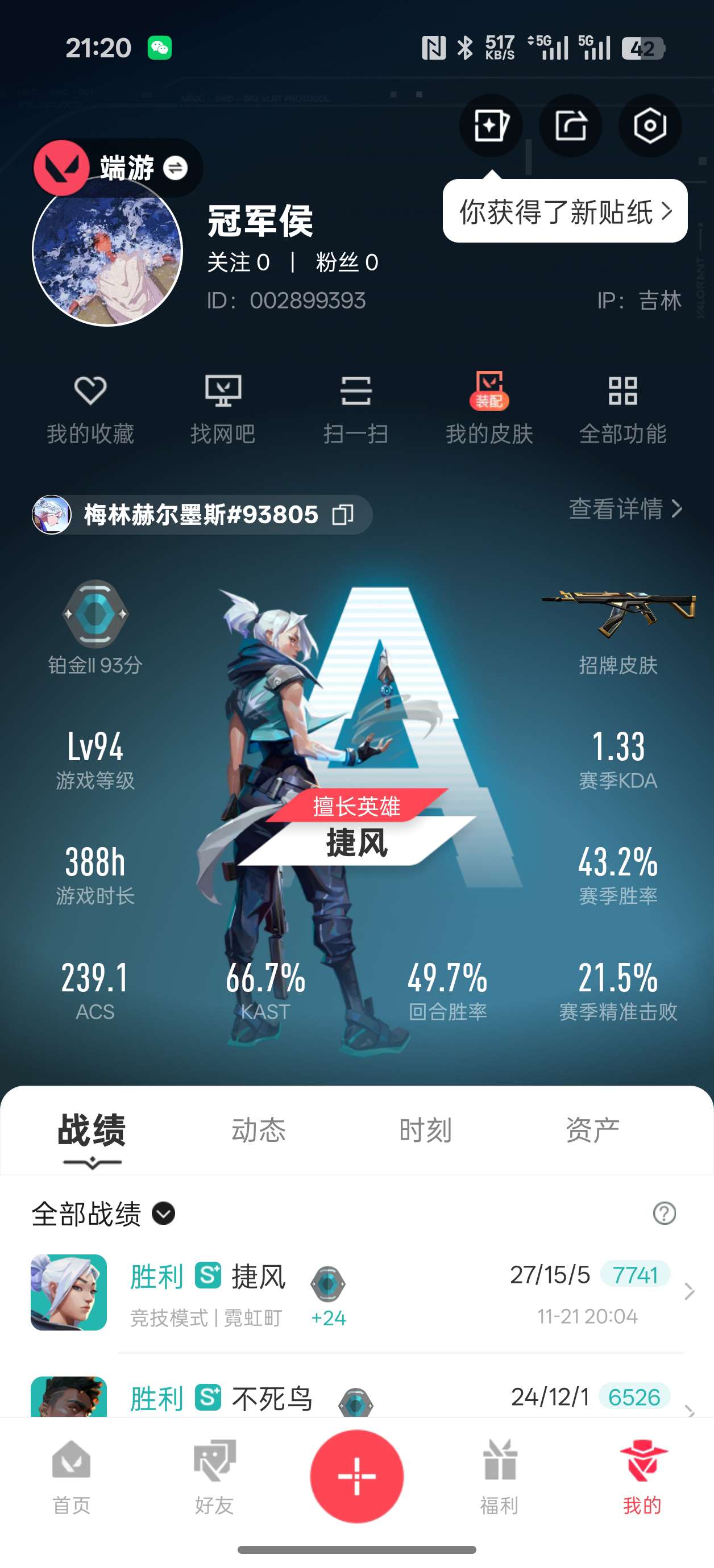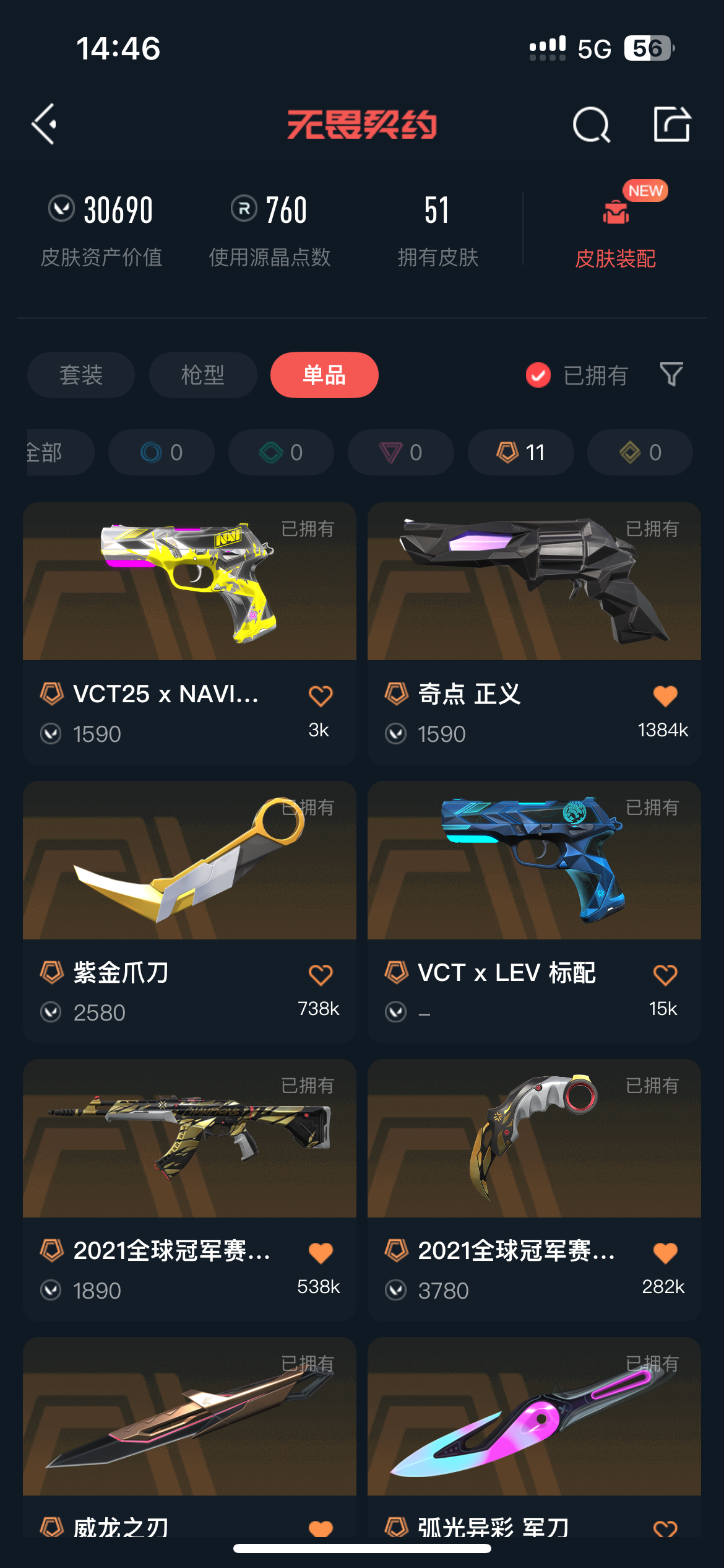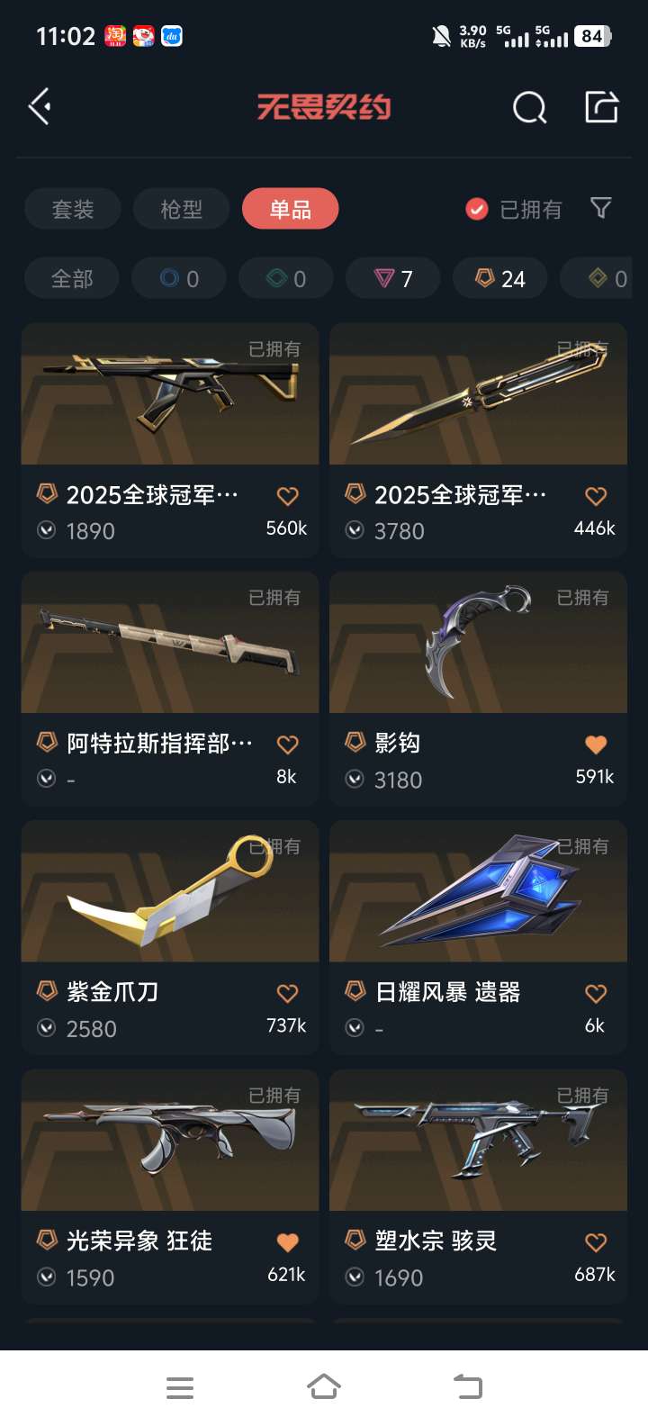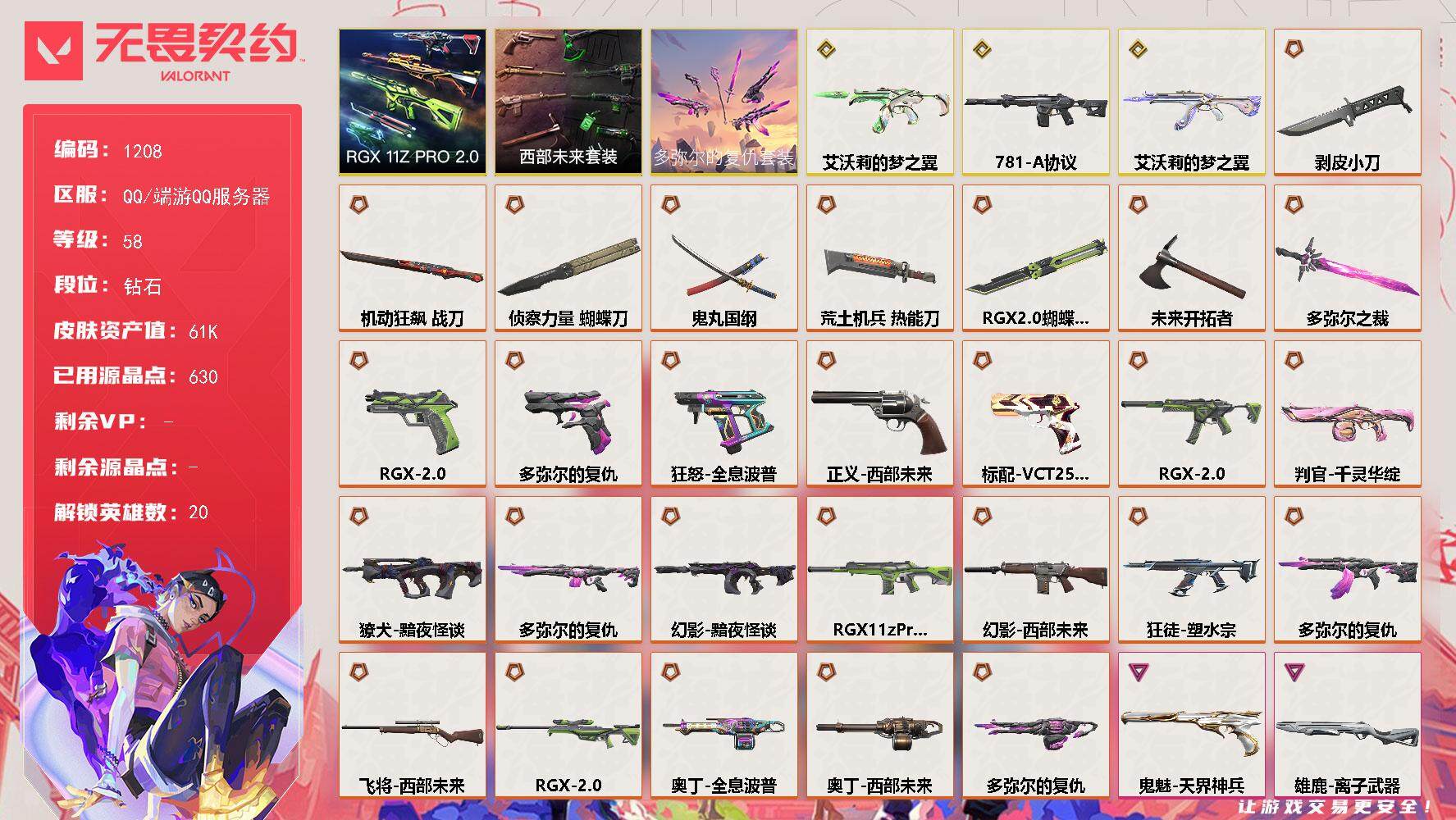 94级,57皮肤,铂金二,25冠军套,vct爪刀,边陲套,掠夺爪,黑波