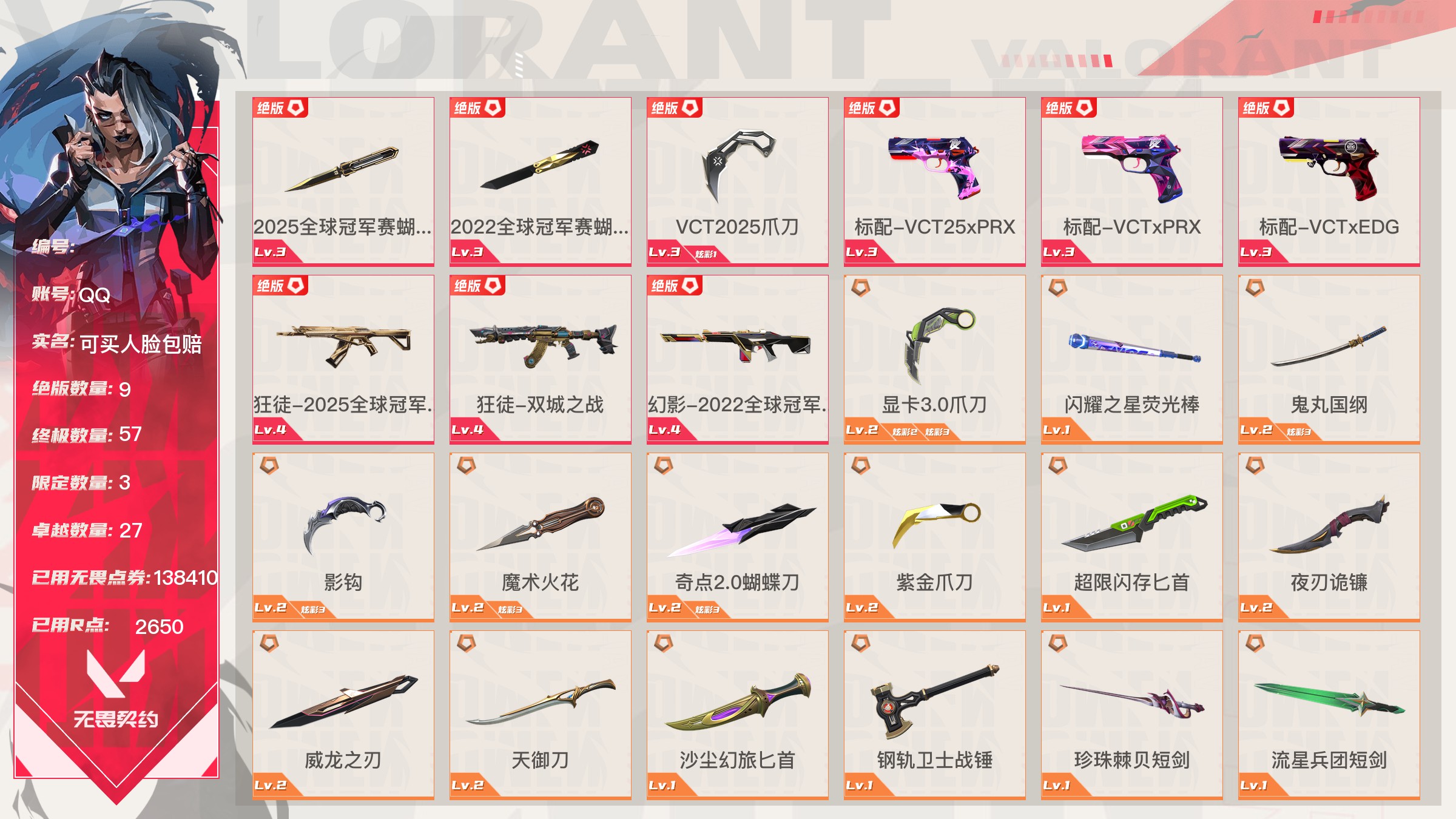 Lv308|未定级, 刀皮数量19,枪皮数量138(绝版5限定