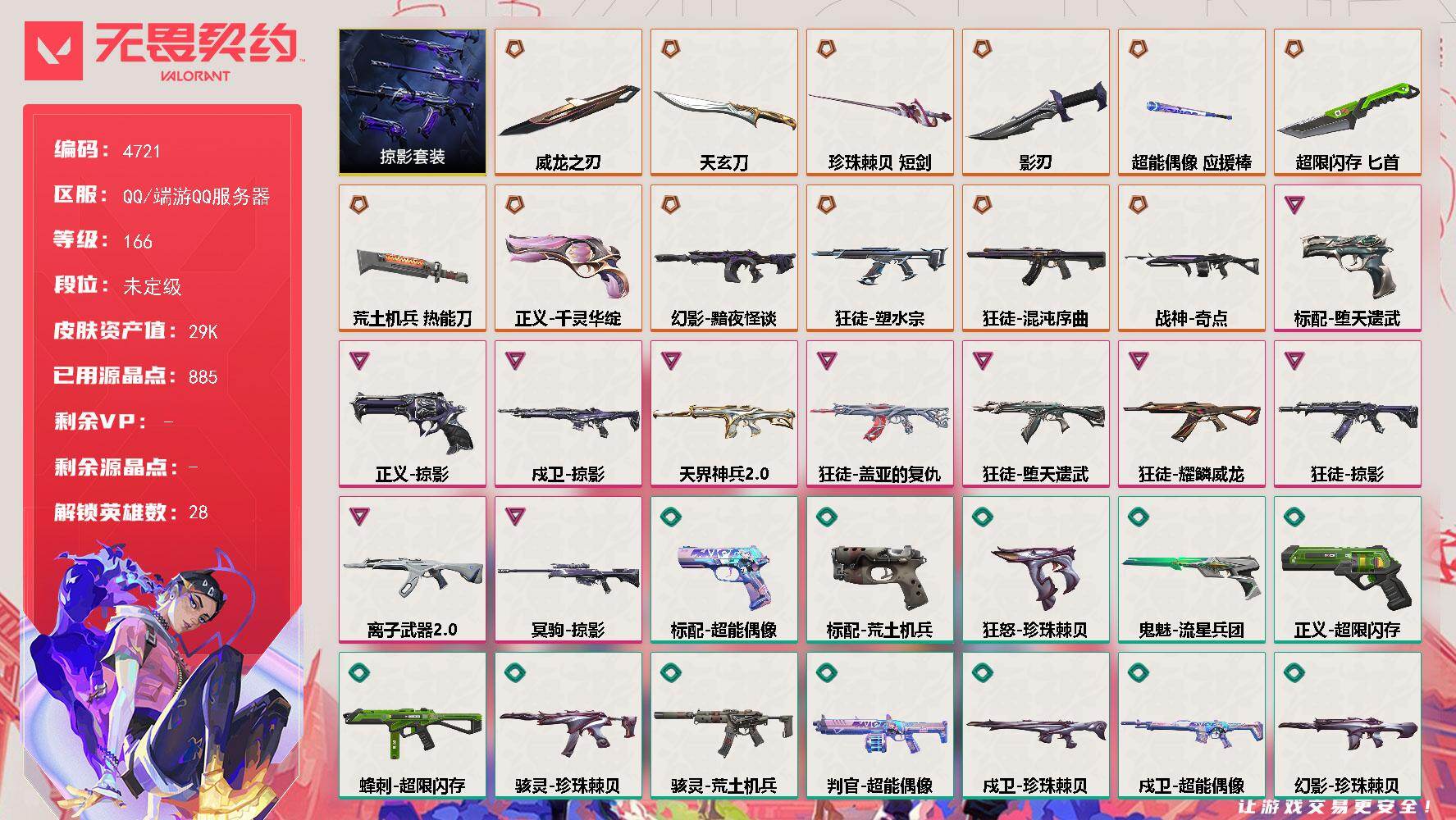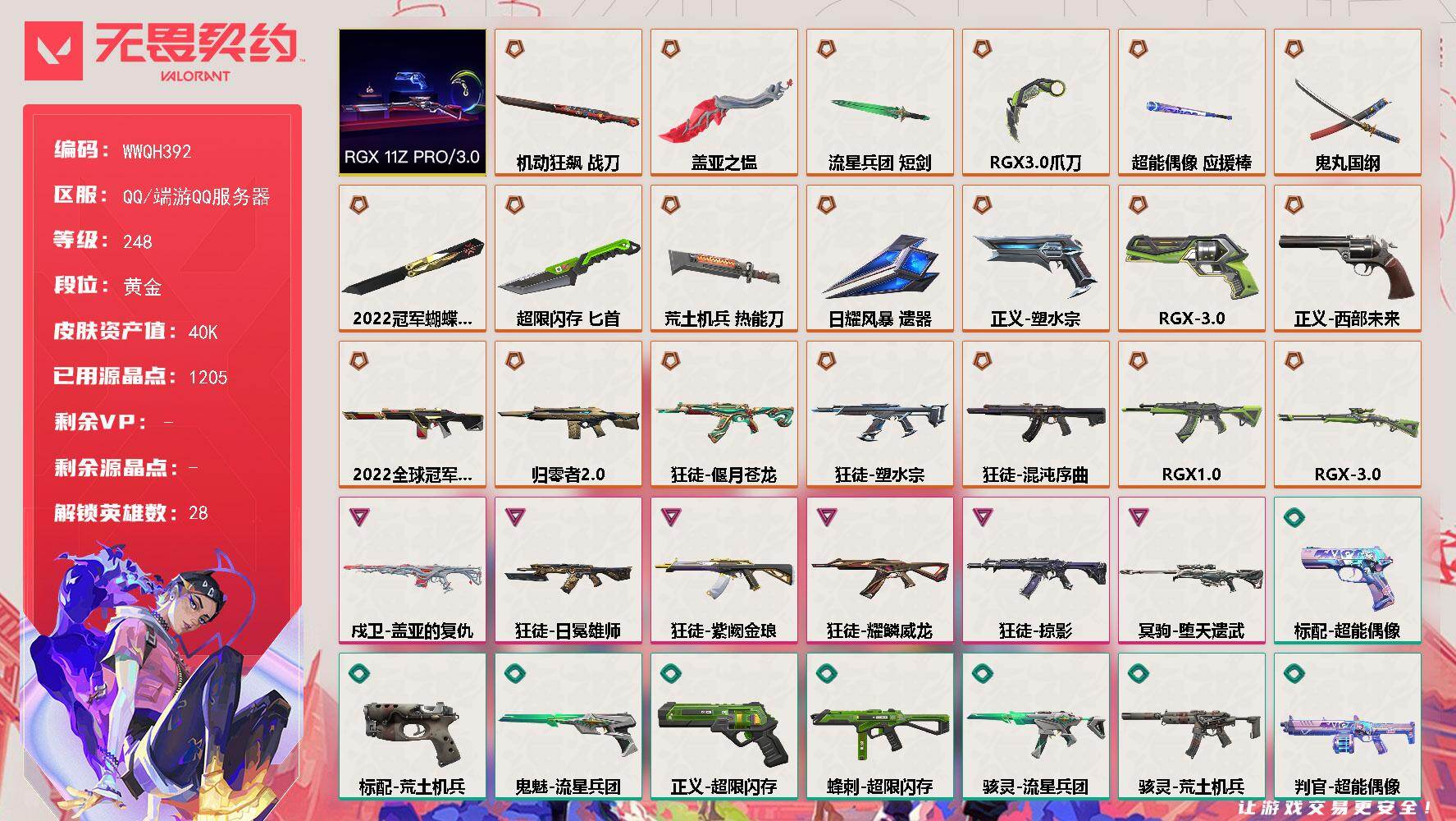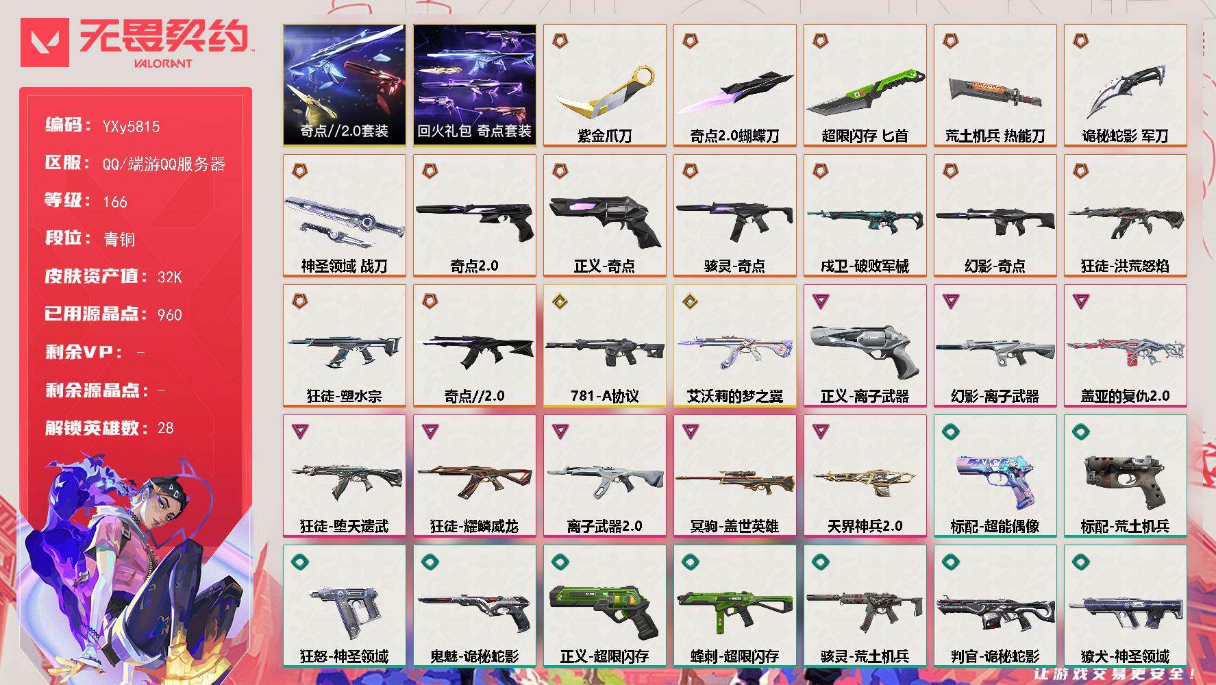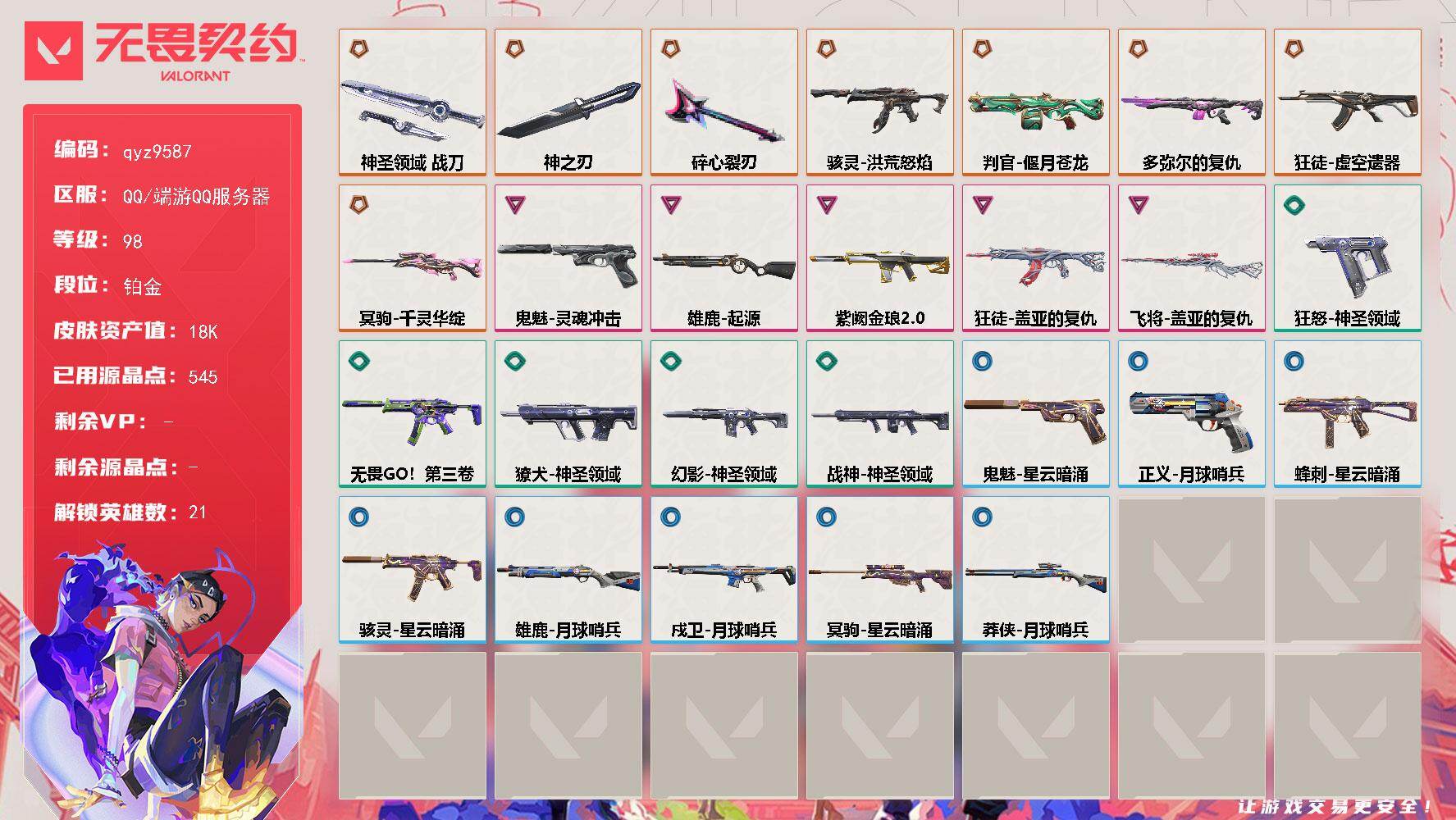 终极*6/卓越*3/皮肤*32/等级*76/段位:黄金/无畏契约季