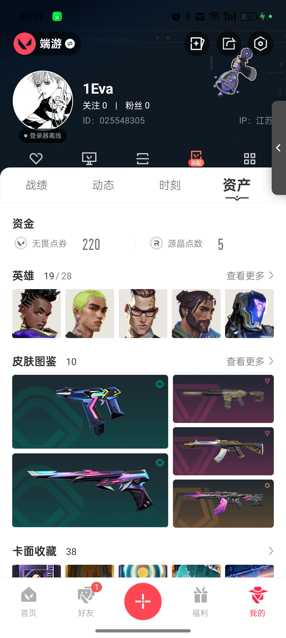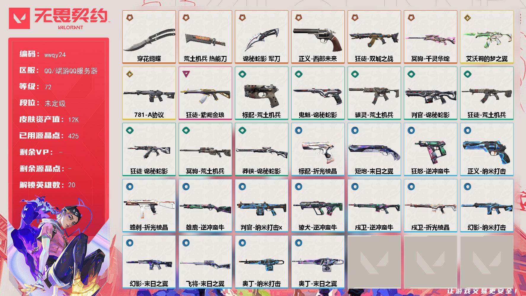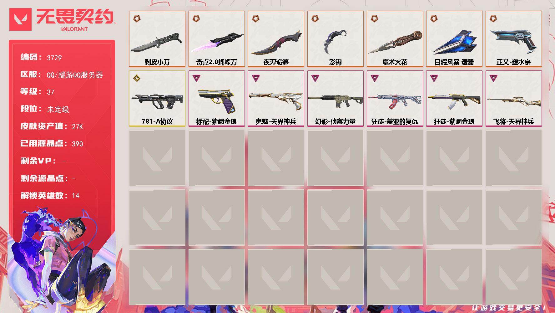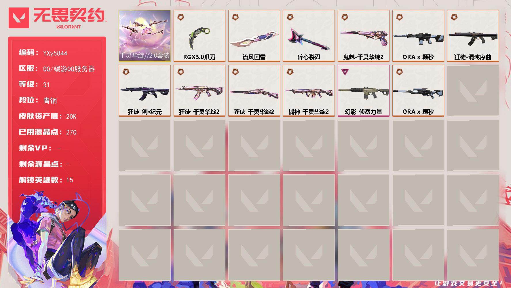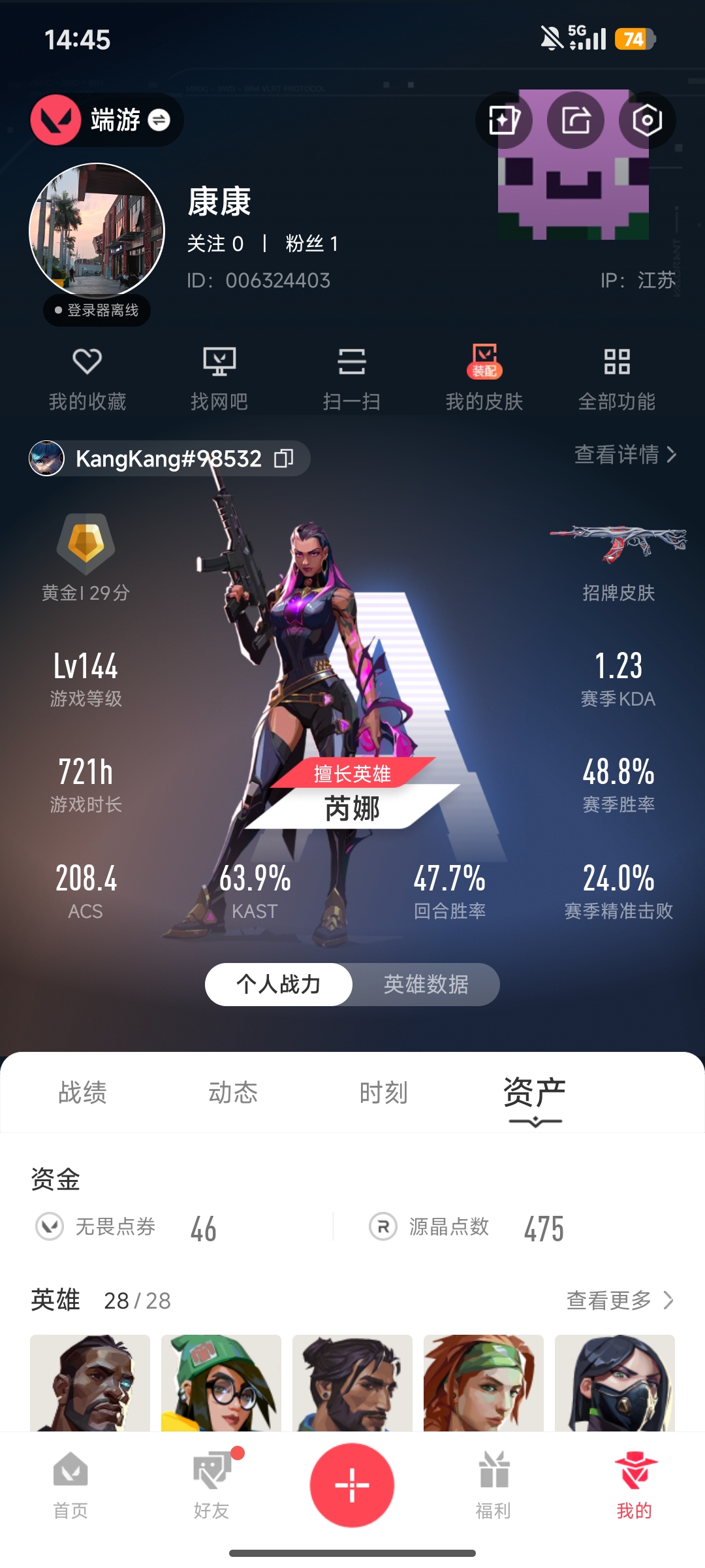 终极*6/卓越*3/皮肤*32/等级*76/段位:黄金/无畏契约季