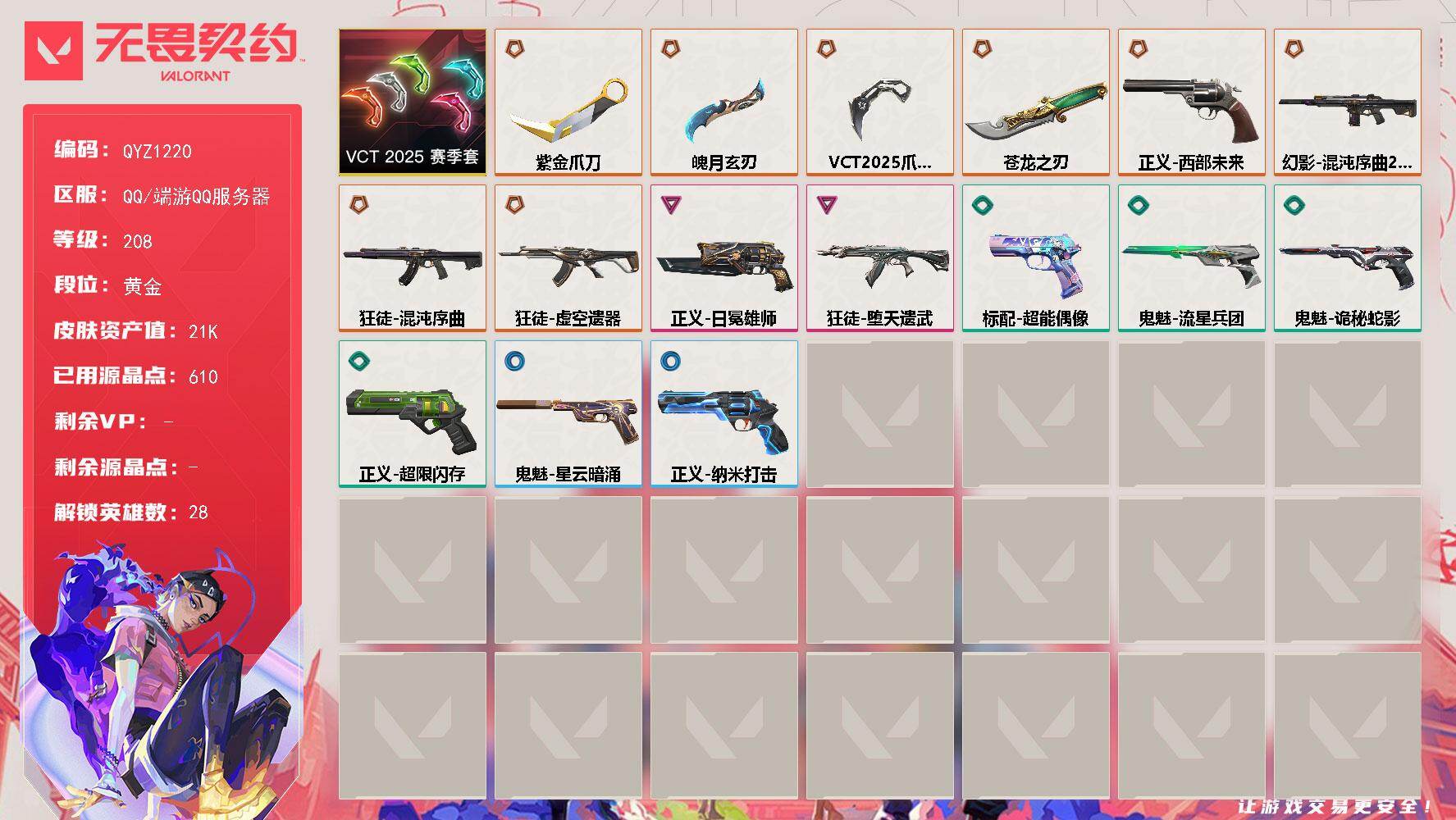 【套装】:VCT 2025 赛季套装【英雄】:幻棱,炼狱,维斯,暮蝶,钛狐,壹决,