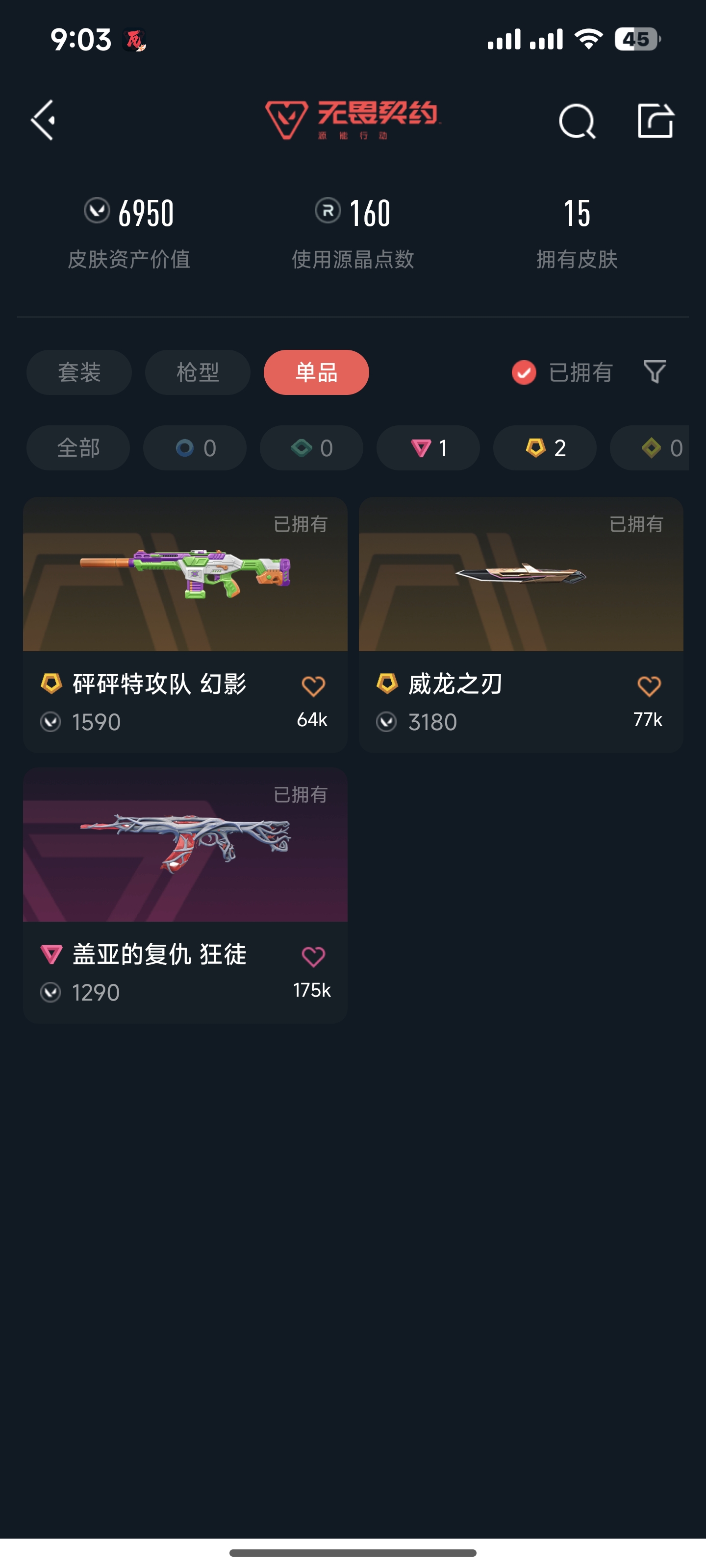 1刀皮 4枪皮 2橙皮 三紫皮 满级枪刀皮 青瓷影 光明哨兵狂徒 怒海惊澜幻影 狂沙噬天狂徒 紫阙金酿2.0幻影