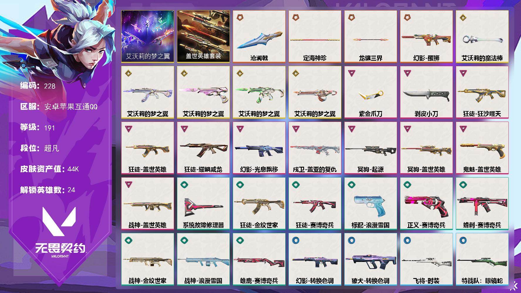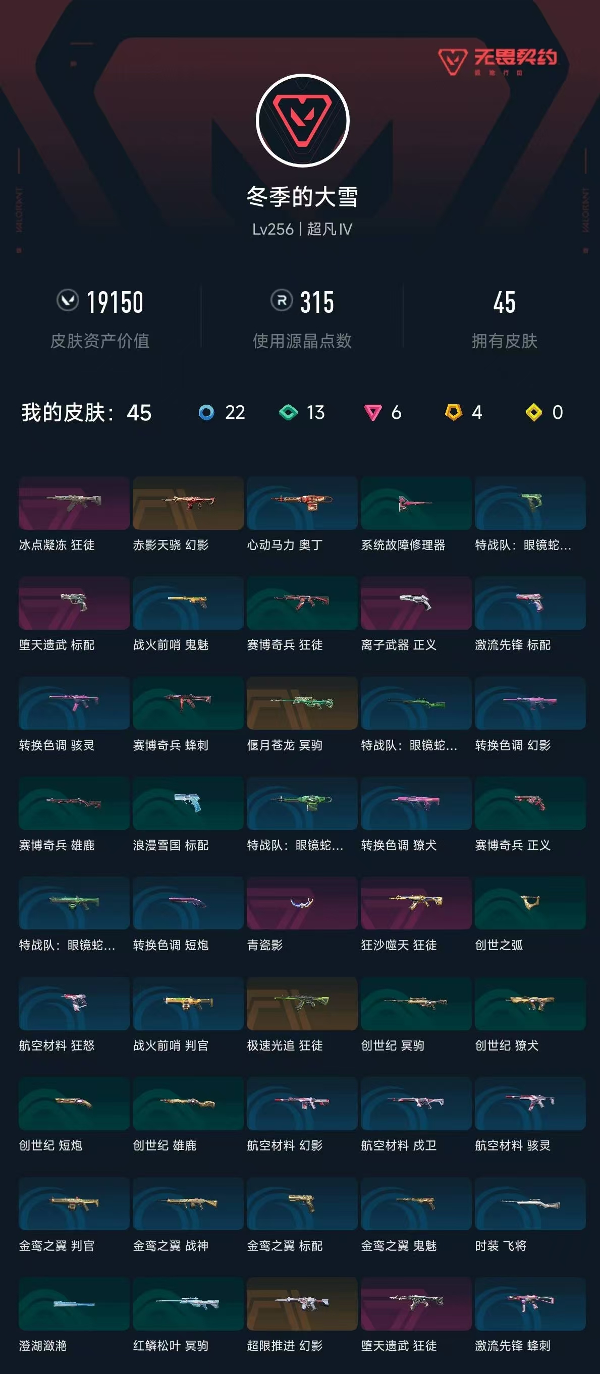 xy134Lv256 ,皮肤总价值19150,超凡IV,总皮肤45,刀皮4枪皮41(传奇4卓越6)