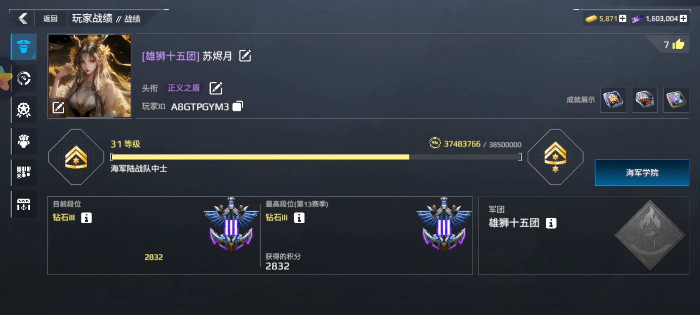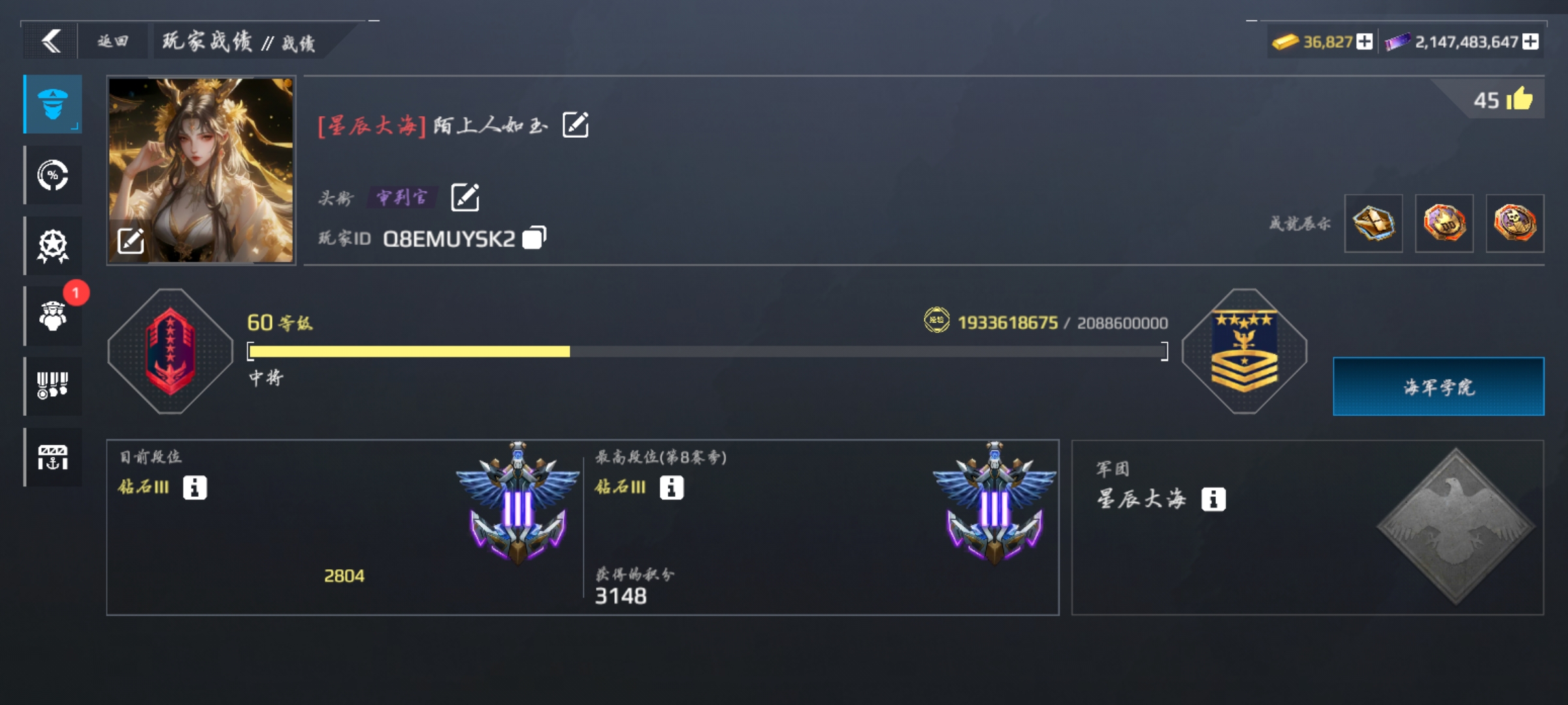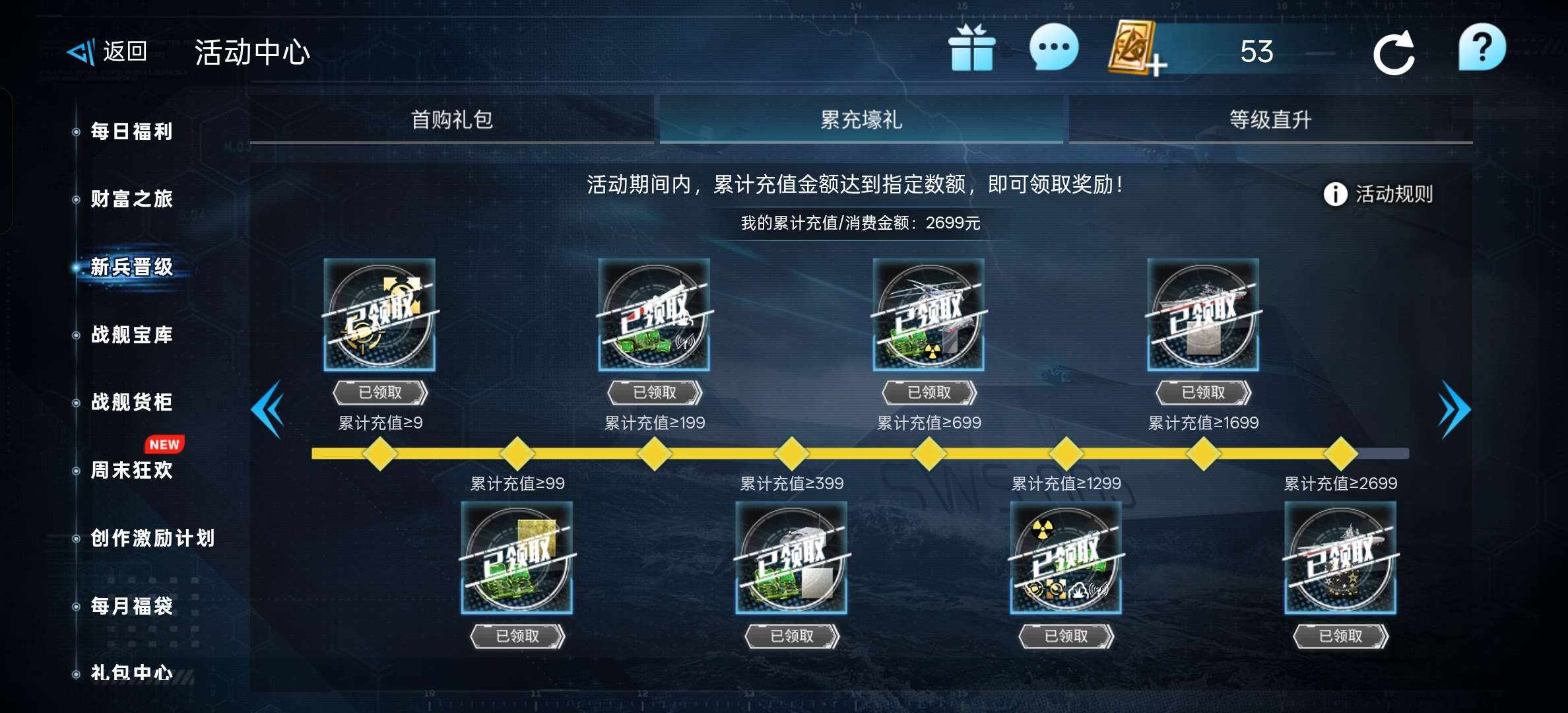 53级,战火国服,官方账号。自从入坑以来的每月活动基本全肝完,武器装备也全拿完。
