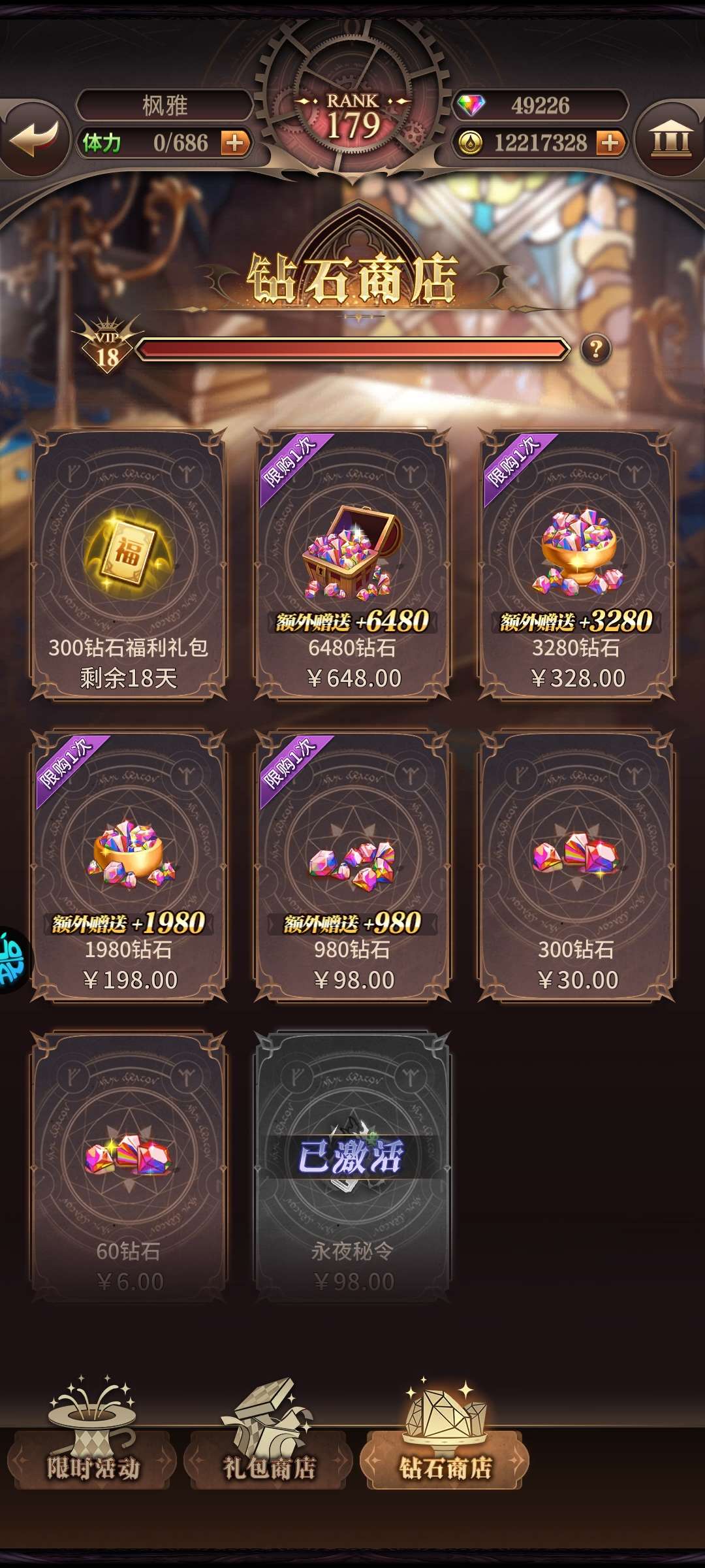 保底640-700抽,其中钻石65000-70000,水晶4500,召唤卷50+,黑函30+