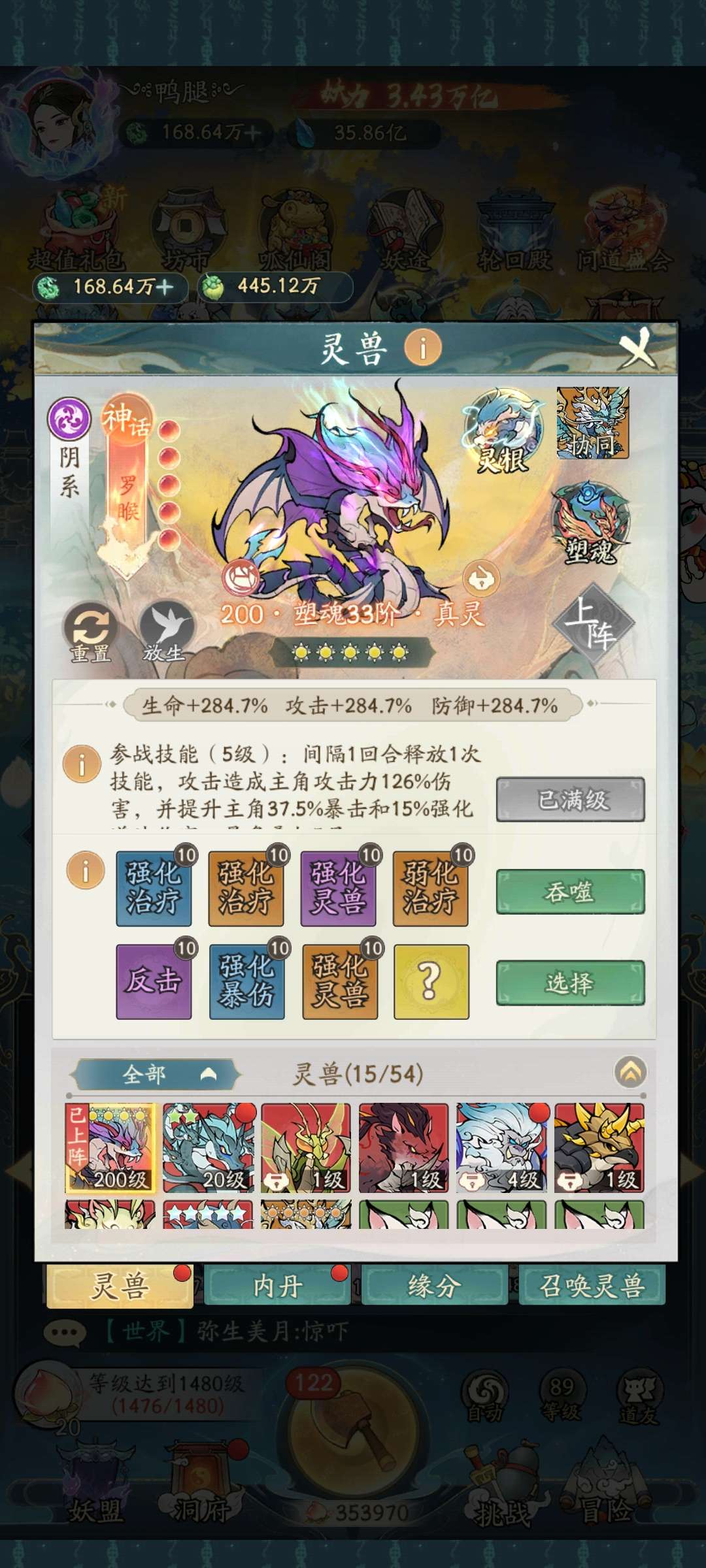 寻道大千 1200卡级谛听号 10几只灵兽没吃满看图,灵兽15+11双减减伤400+持续增加