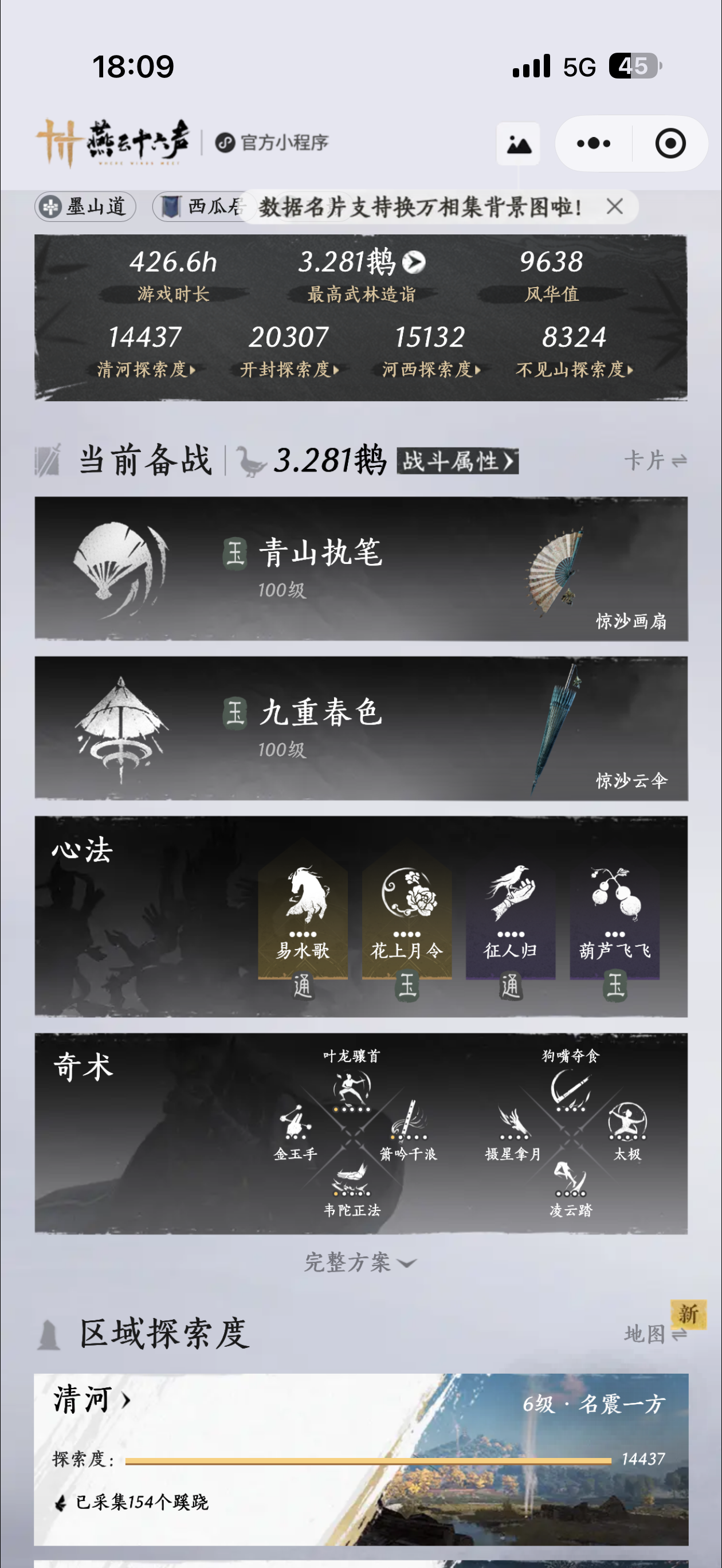 开服账号,一个绑定八音窍,零氪,1.9鹅回归号,开封探索度46,清河61,河西14,风华4300