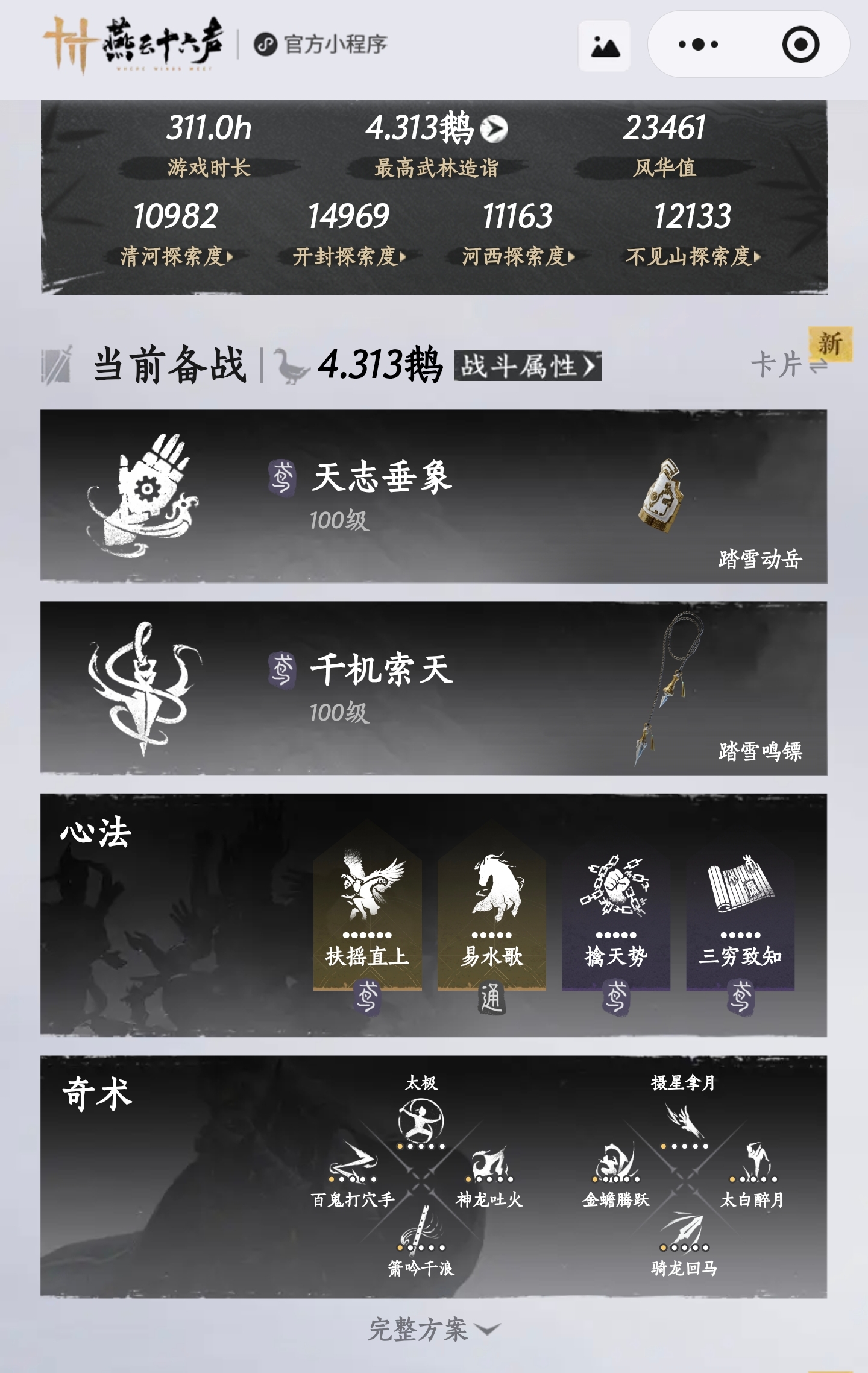 4.31鹅,3颗八音(2颗已用,一颗未用),心法6555,武库天赋满,随缘出,具体看图