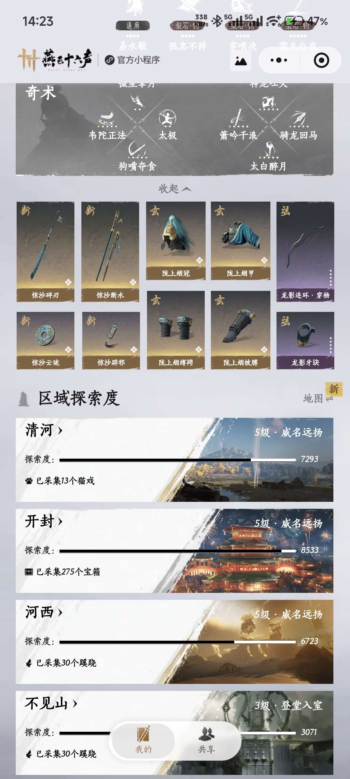 燕云十六声探索号,全图满探索,有一颗八音窍,246小时的游戏时长,在探索方面包有面子,任务也快做完了