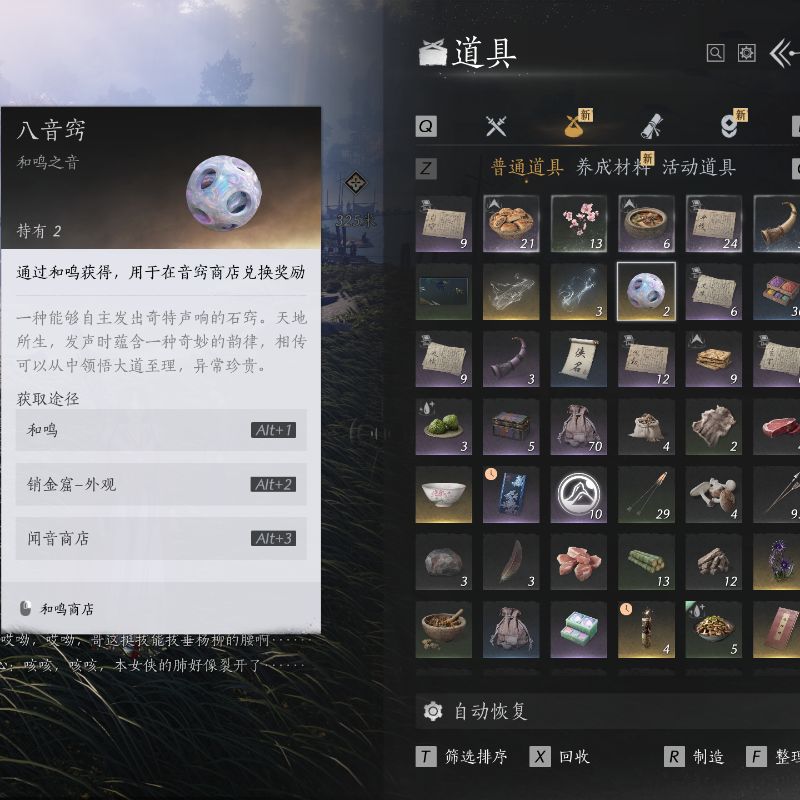 风吟彼岸➕浮岚,已用八音窍3,背包存有碎冰冰*1,可分解为八音窍2