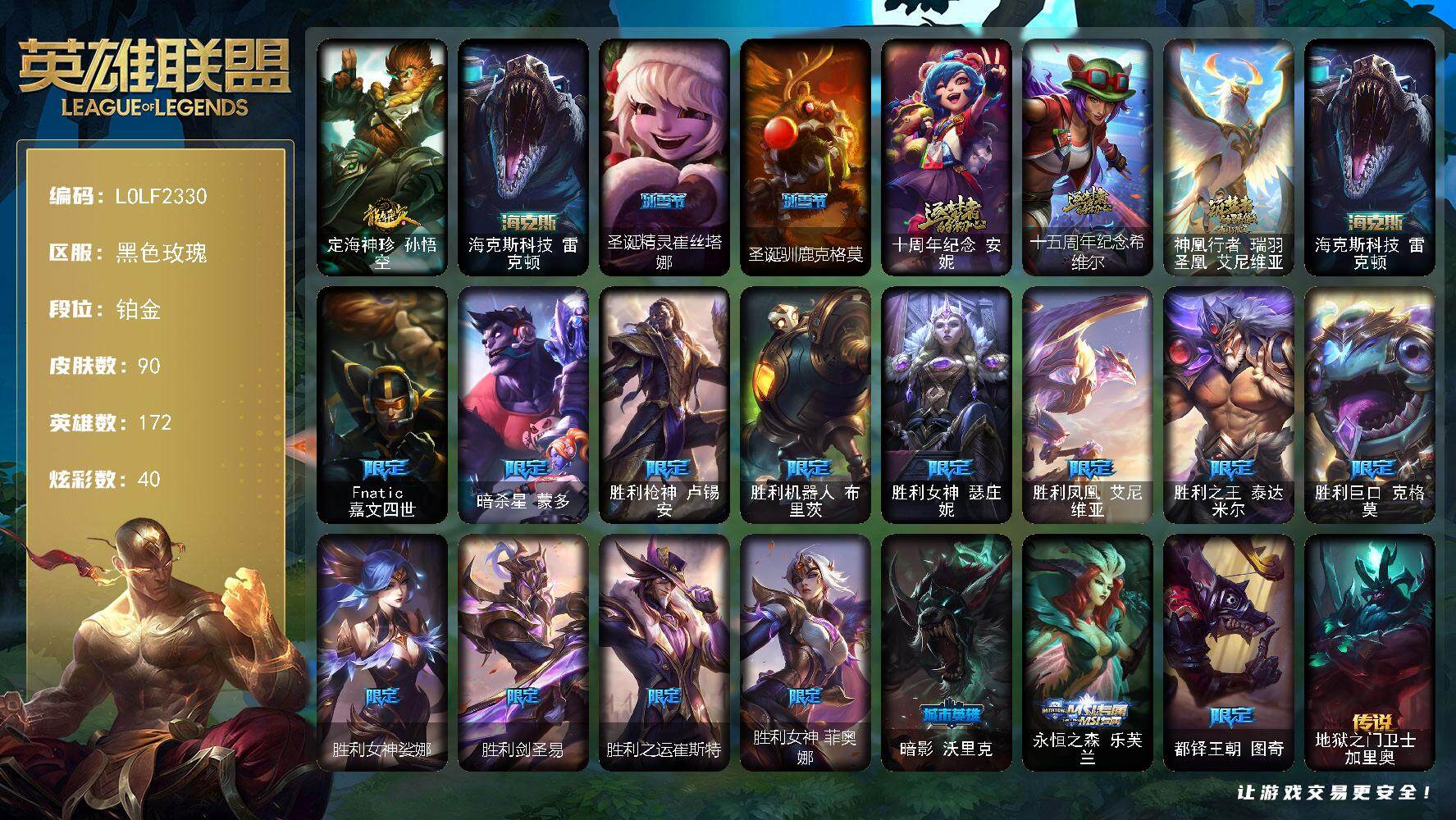 172英雄/90皮肤/1终极/2神话/16限定/6臻彩/46炫彩/6传说/10史诗/未定级账号等级:191/