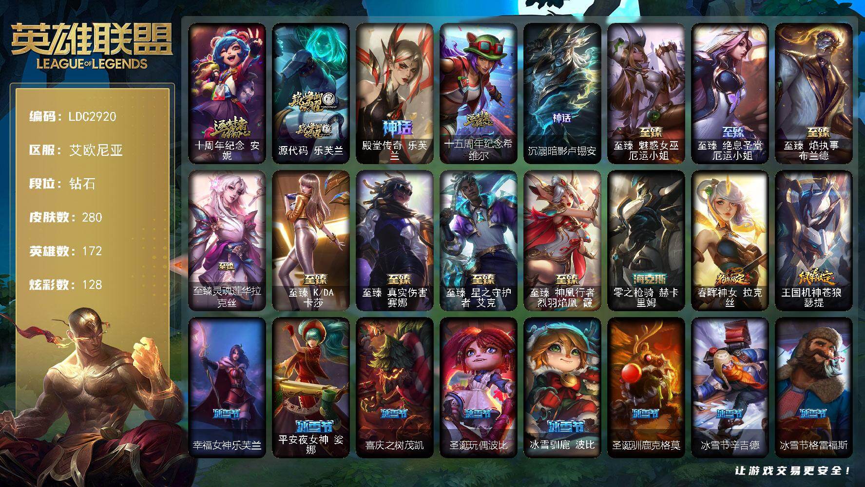 172英雄/280皮肤/14神话/45限定/7臻彩/128