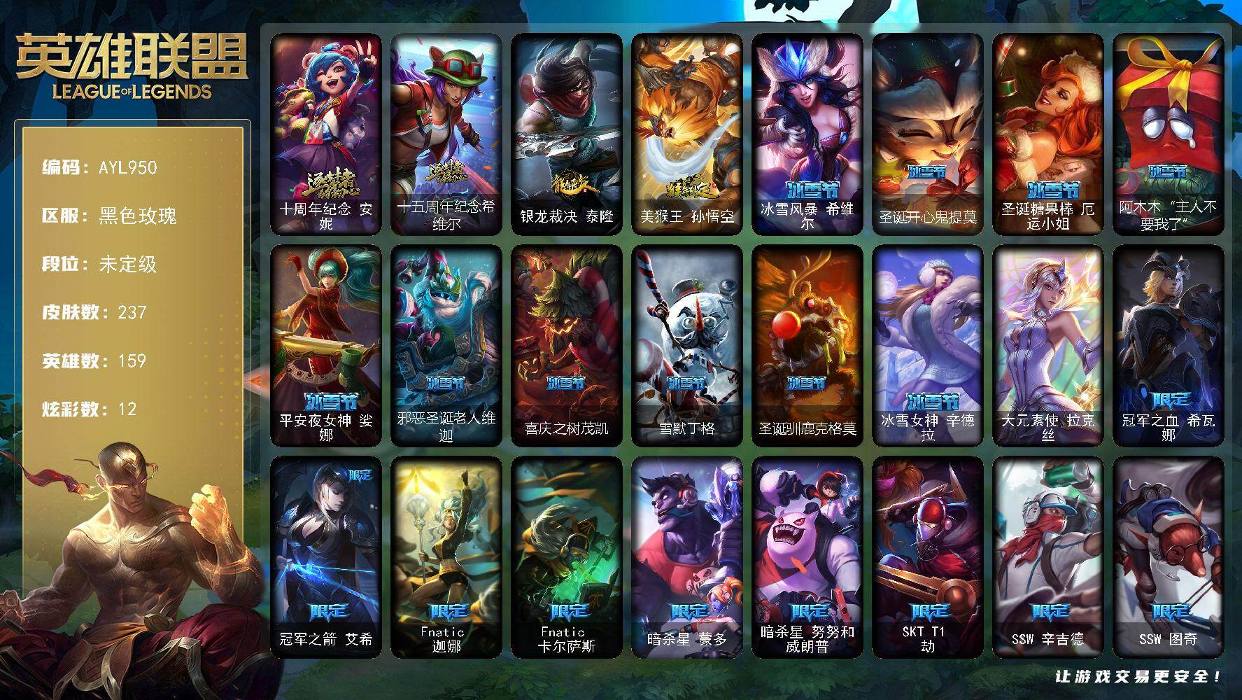 未定级段位-159英雄-237皮肤-12炫彩-1终极-2神话-37限定-28传
