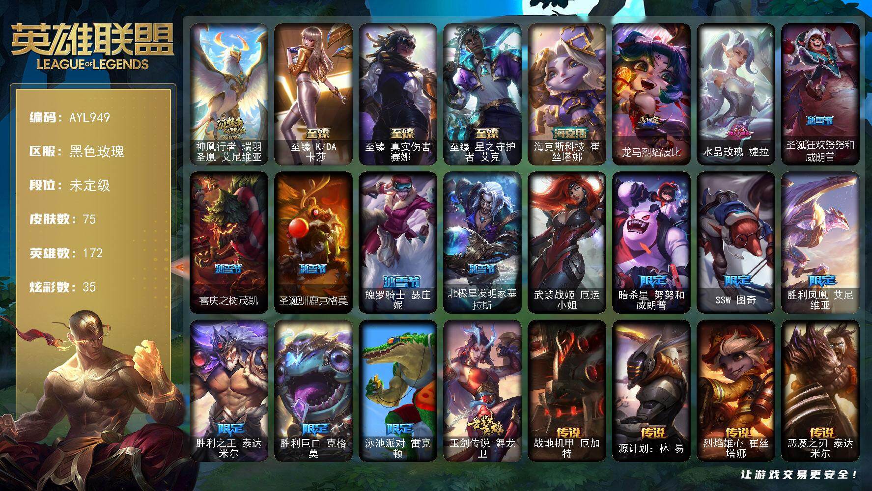 【店主推荐捡漏号】未定级段位-172英雄-75皮肤-35炫彩-1终极-5神话-