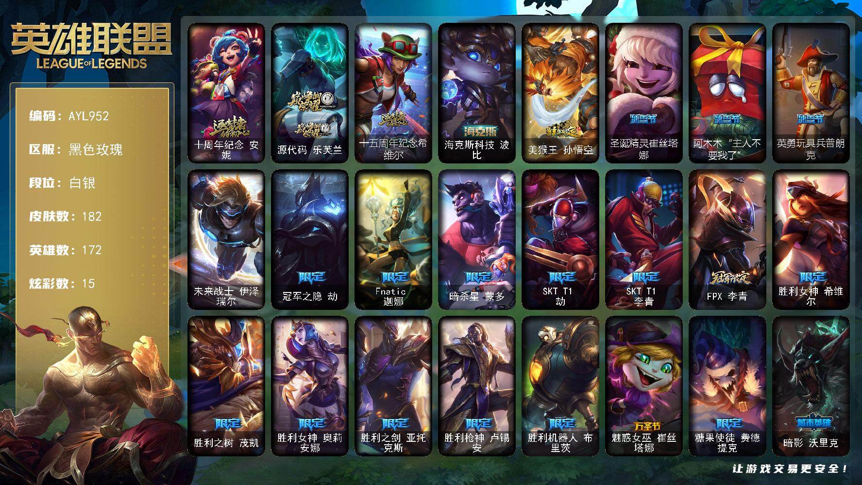 白银段位-172英雄-182皮肤-15炫彩-1终极-4神话-22限定-16传说
