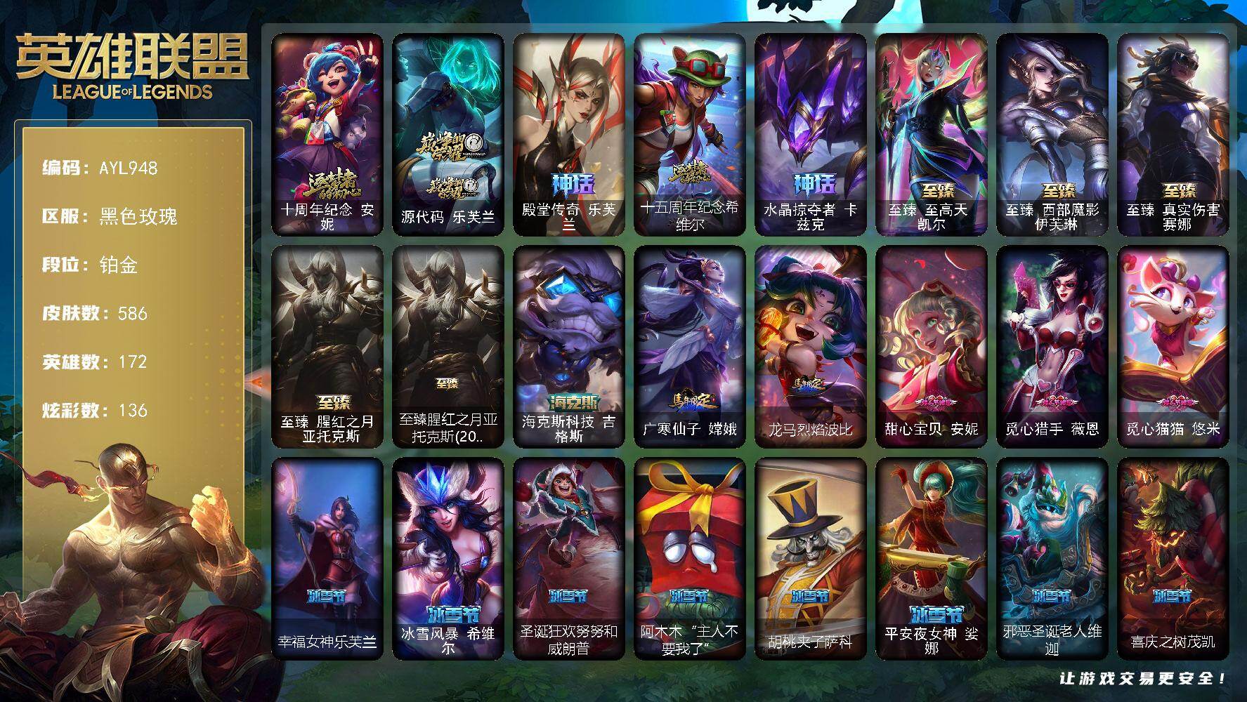 【店主推荐捡漏号】铂金段位-172英雄-586皮肤-136炫彩-2终极-11神