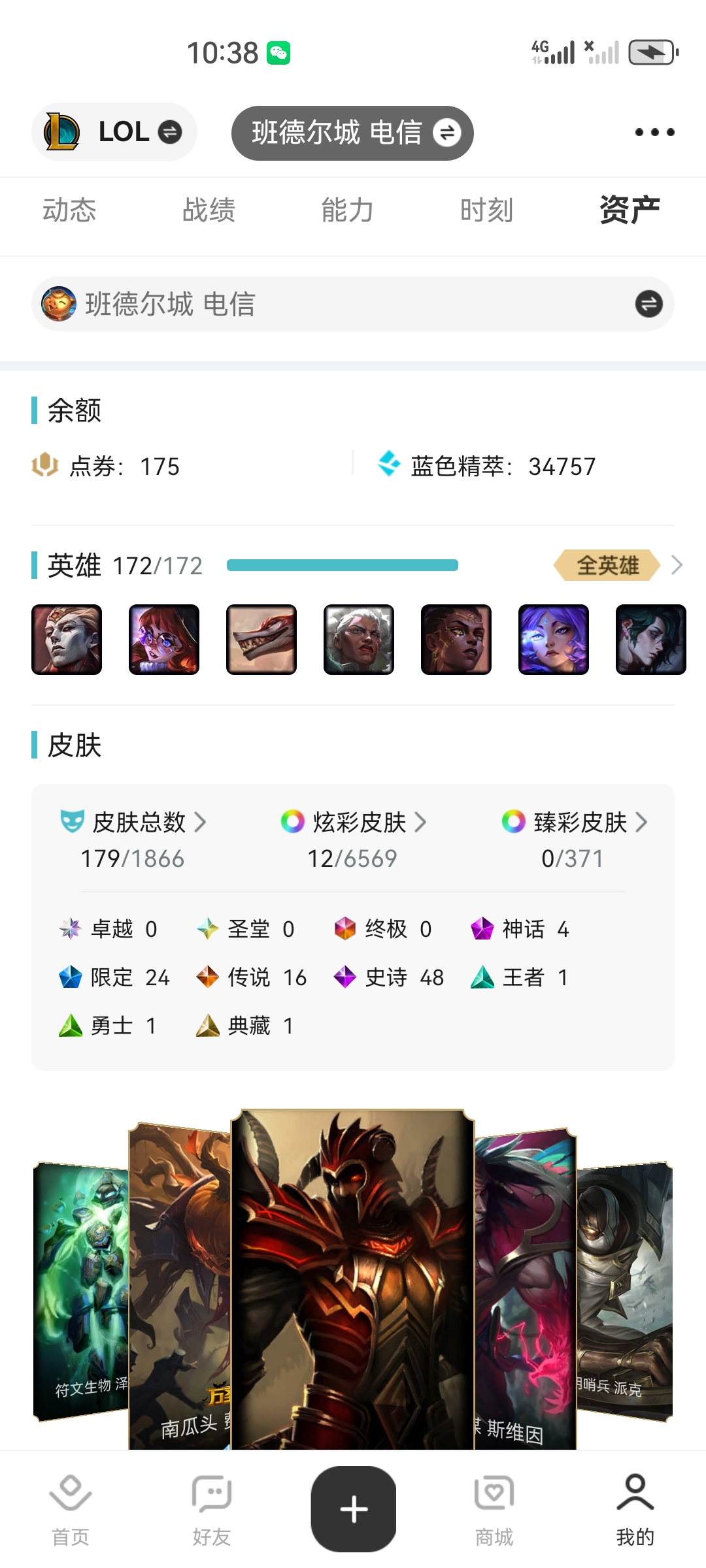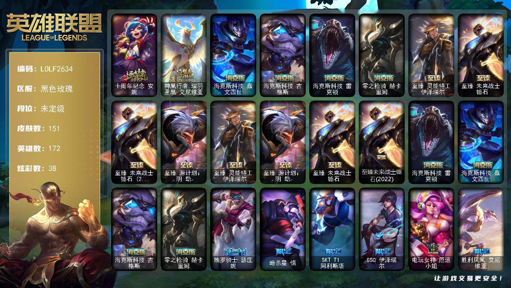 172英雄/151皮肤/10神话/13限定/2臻彩/38炫彩/11传说/43史诗/