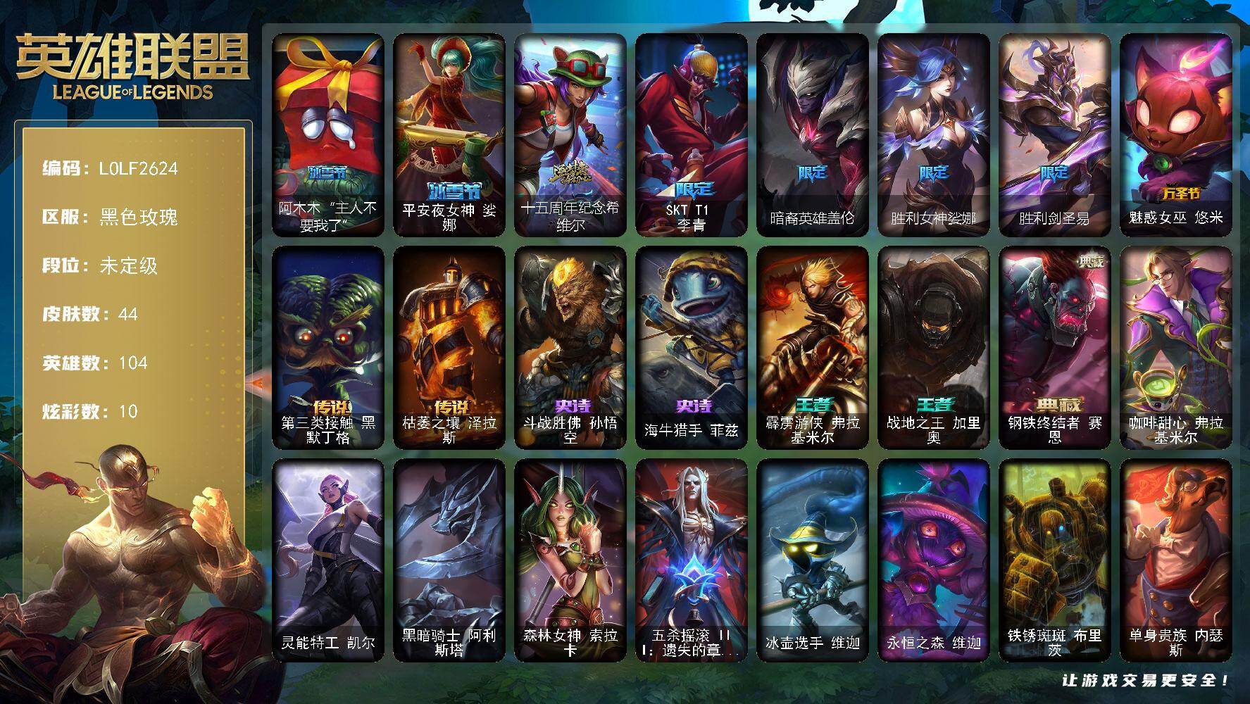 104英雄/44皮肤/1神话/8限定/3臻彩/10炫彩/2传说/2史诗