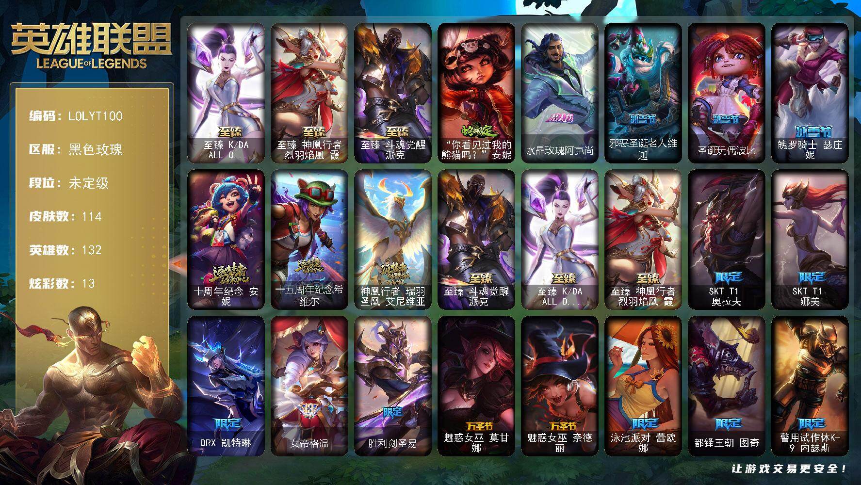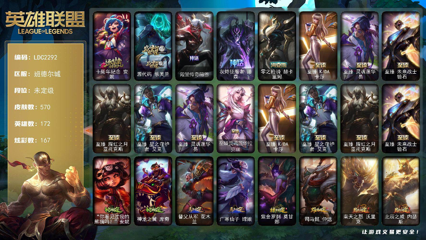 172英雄/570皮肤/11神话/99限定/22臻彩/167炫彩/61传说/128史诗/未定级账号等级:969/