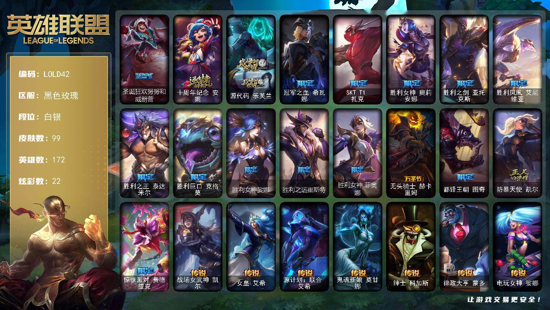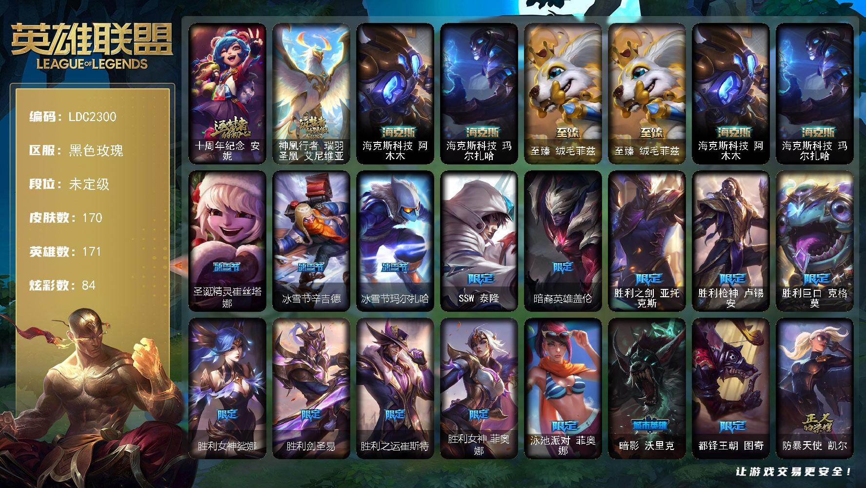 171英雄/170皮肤/5神话/17限定/4臻彩/84炫彩/14传说/42史诗/未定级/